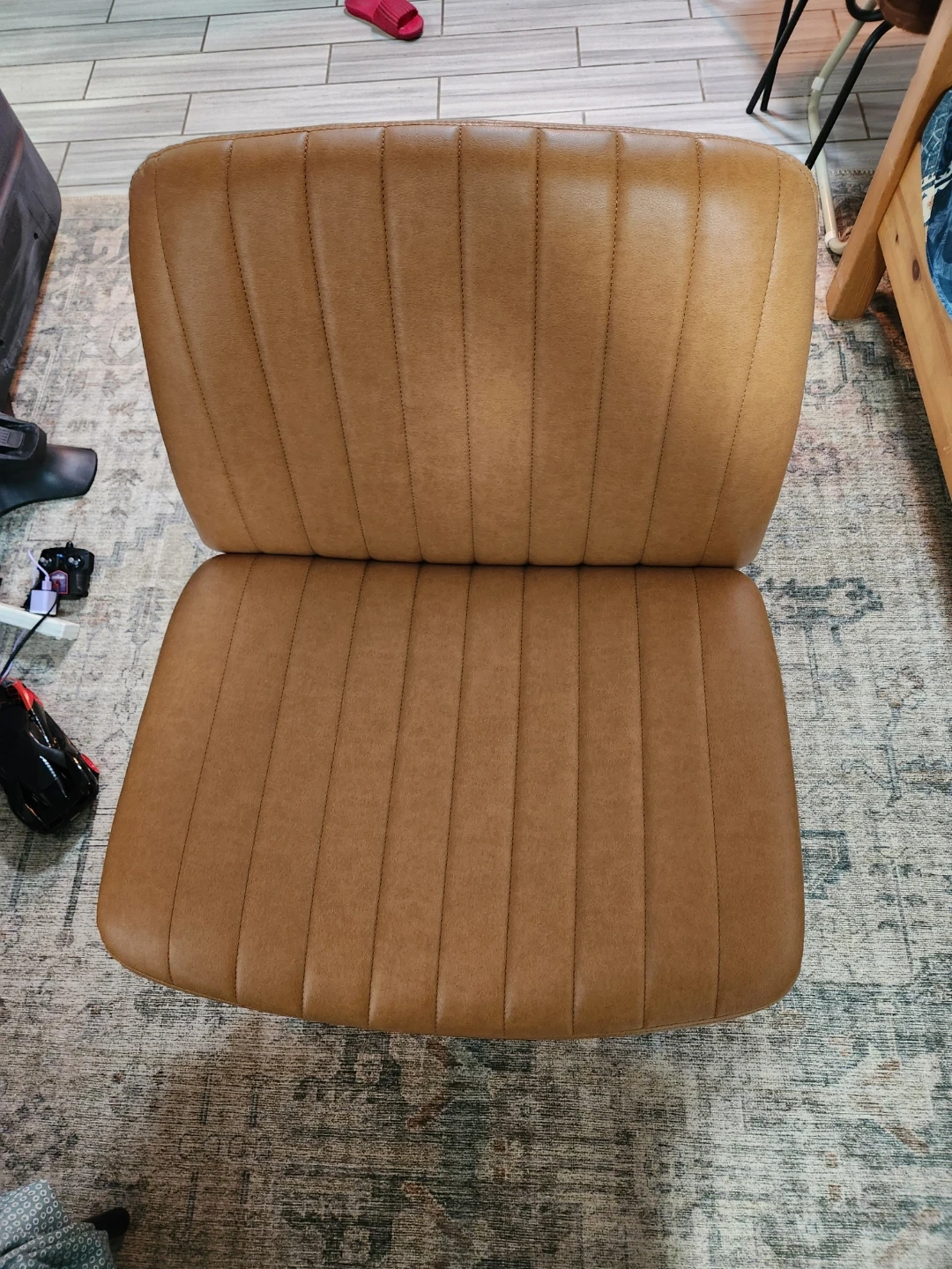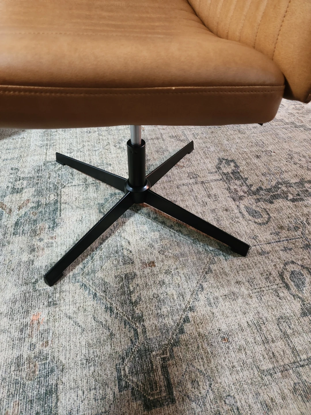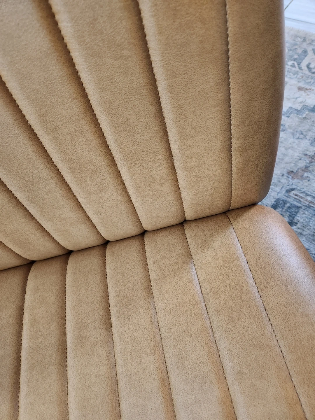 an faux leather accent chair with channel stitching. It's a comfortable and stylish addition to any room. Features a five-star base with a gas lift for adjustable height.