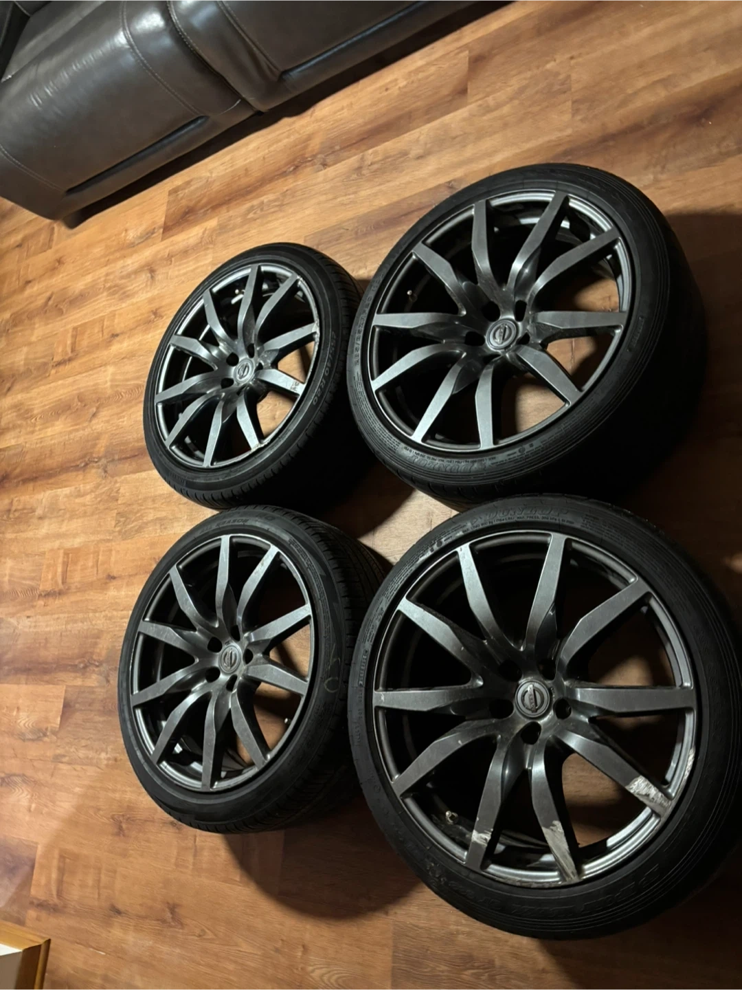 Set of four alloy wheels with tires. These wheels have a dark grey finish and a multi-spoke design. They're a great upgrade for your vehicle! Tires are included.