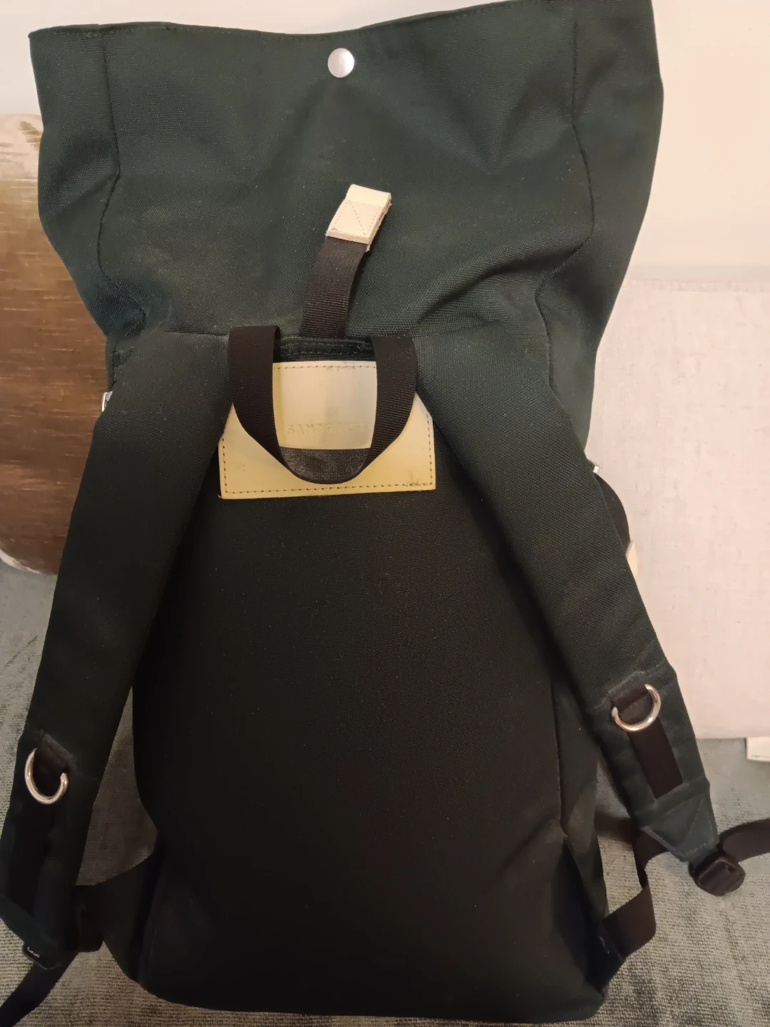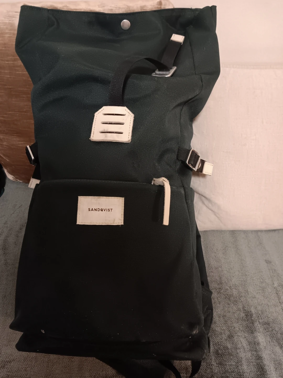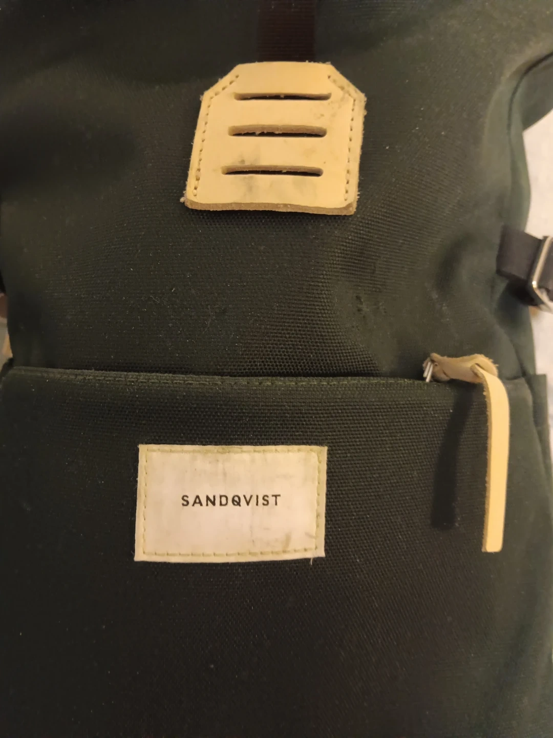 This is a green canvas backpack from SANDQVIST. It features adjustable straps and multiple pockets. It's a durable option for everyday use!