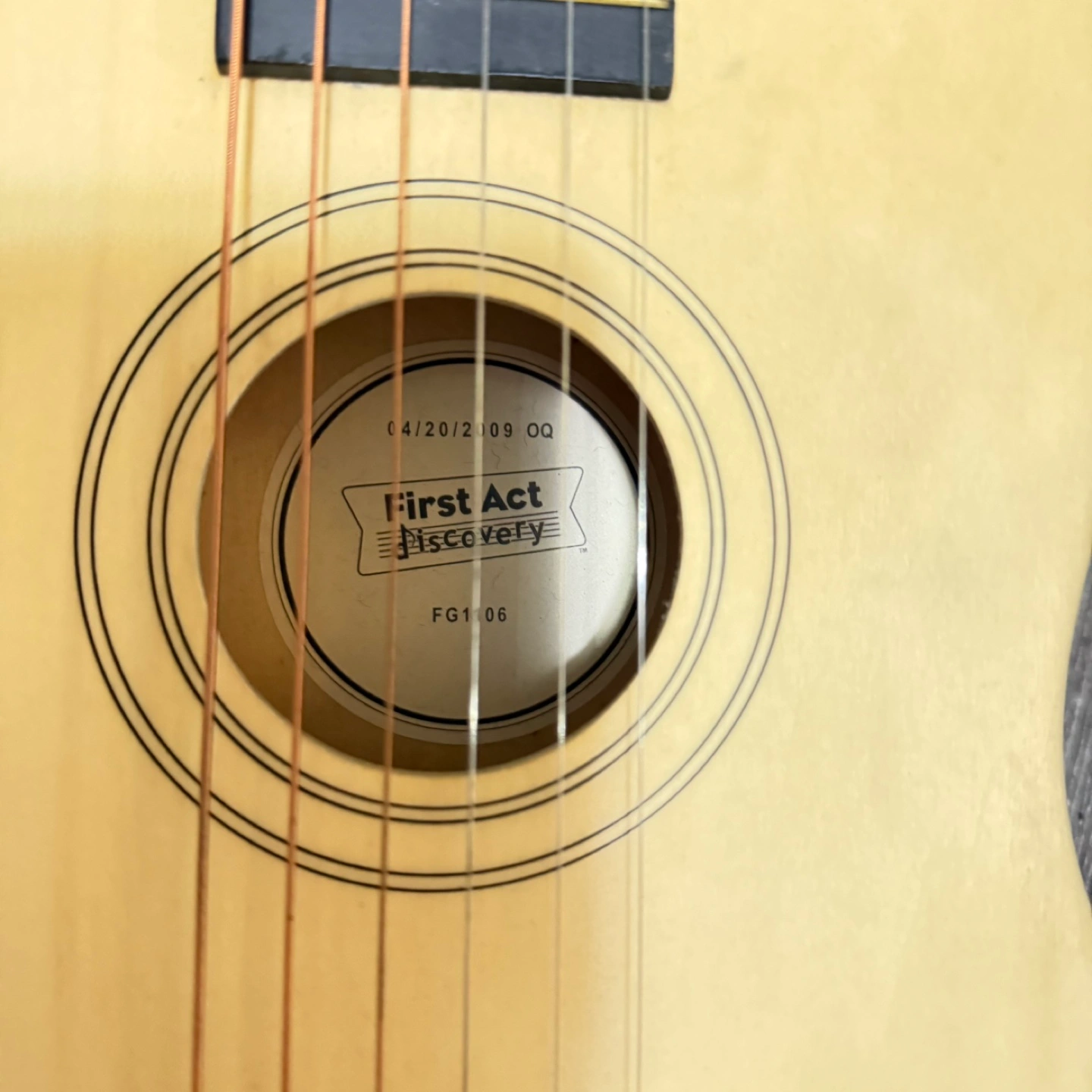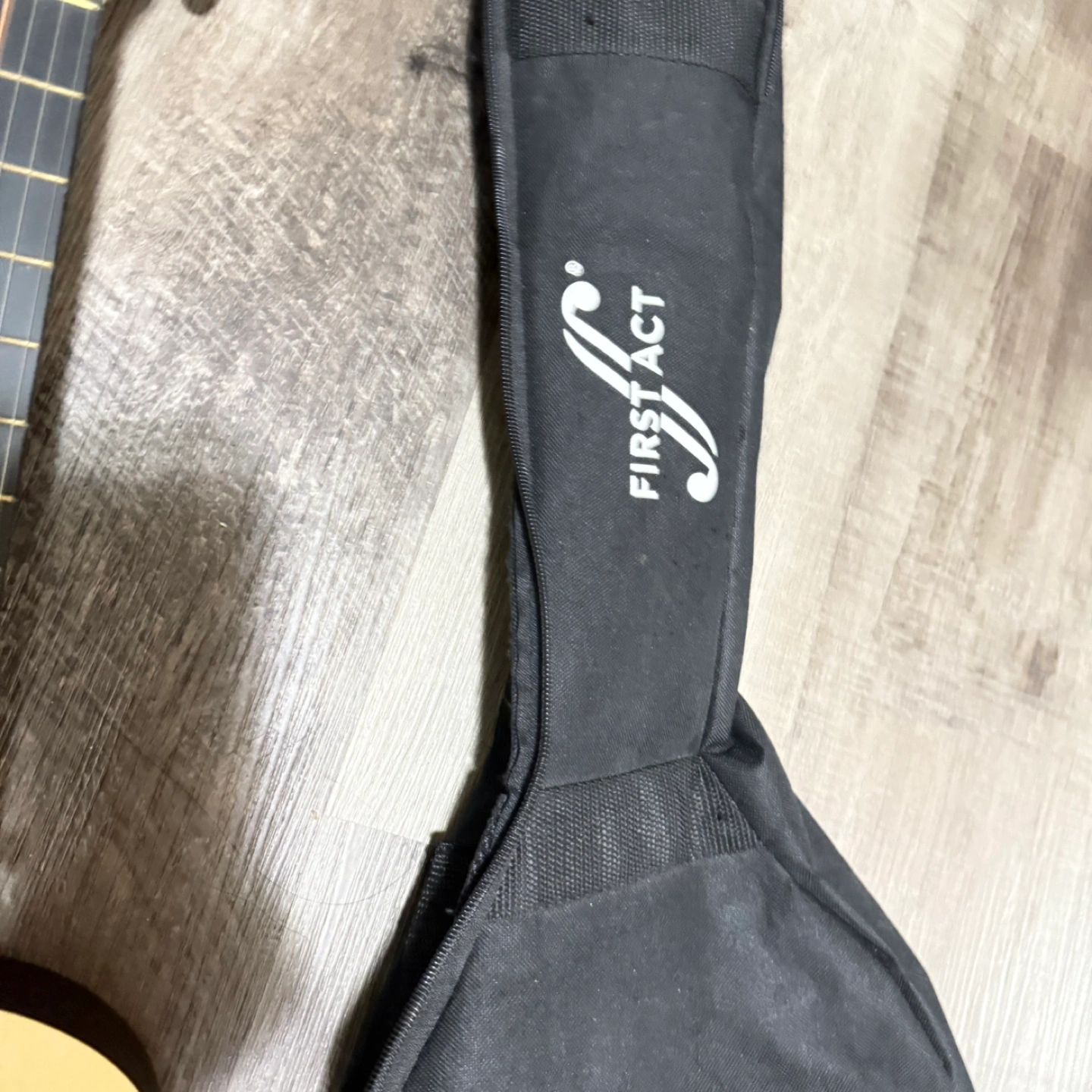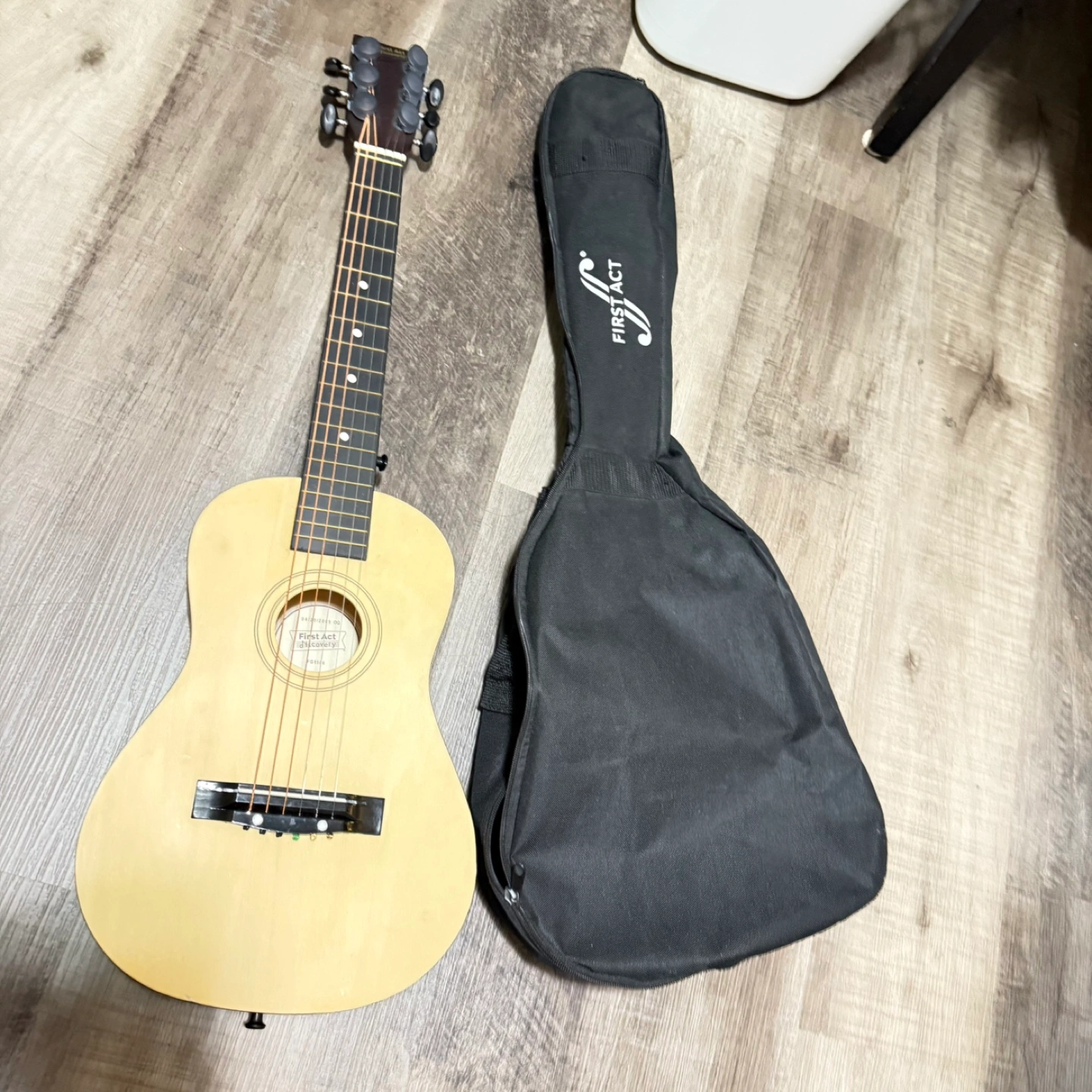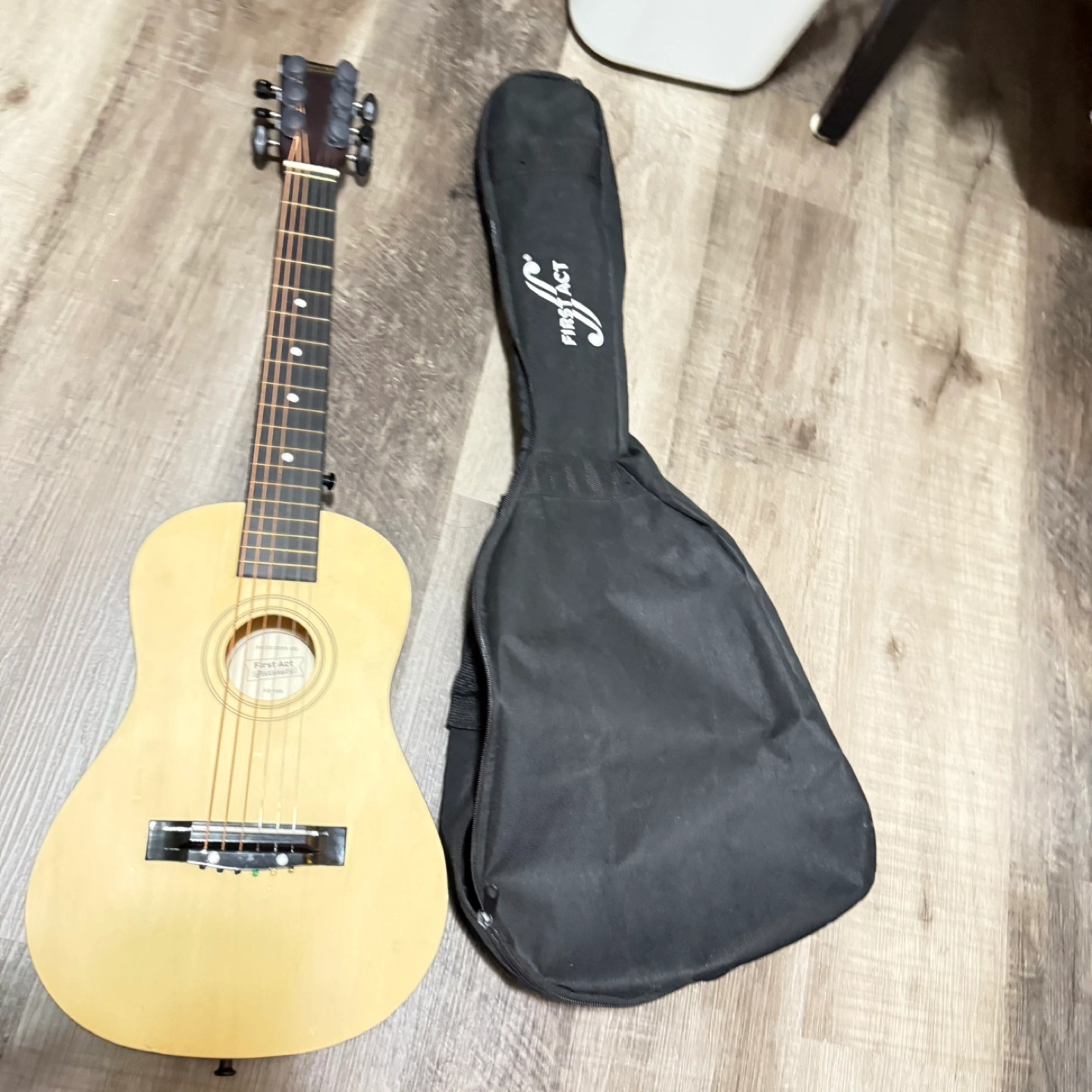 Guitar with a light wood finish. Comes with a black carrying case. A great musical instrument to learn and play.