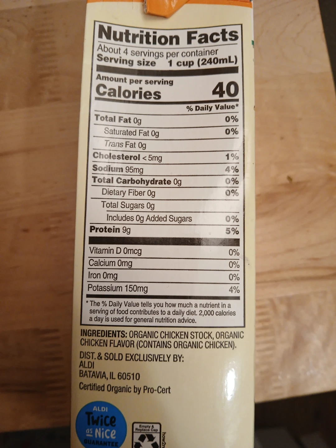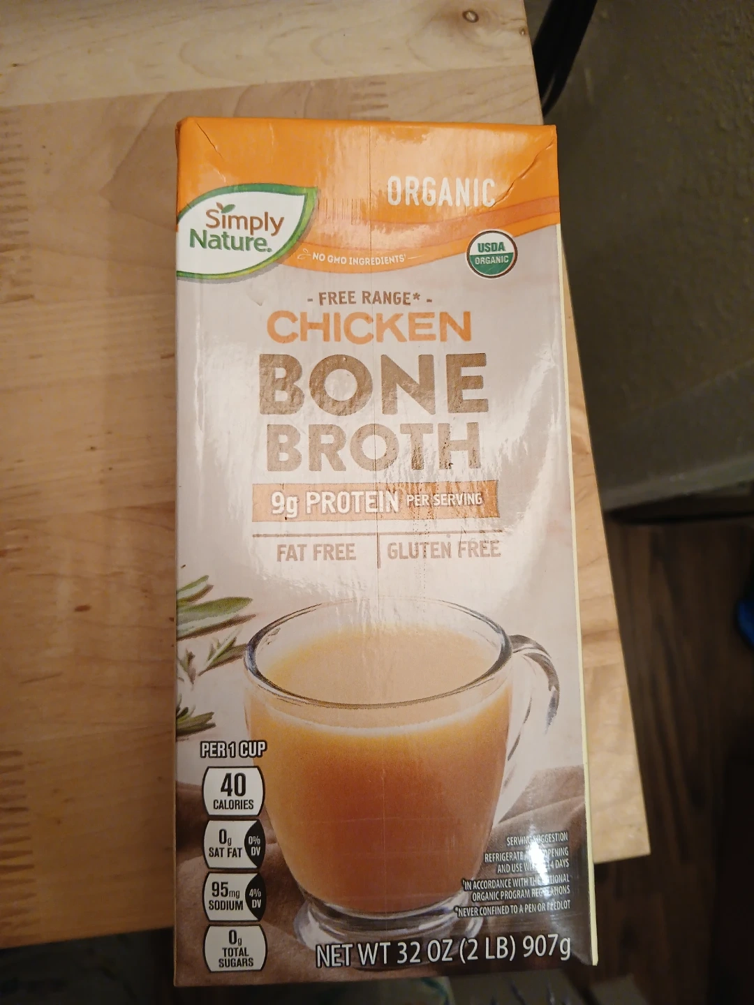 Organic chicken bone broth with 9g protein per serving. Fat-free and gluten-free. Ingredients: Organic chicken stock, organic chicken flavor. Comes in a 32 oz (2 lb) 907g container.