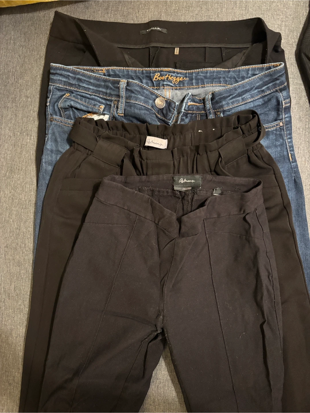 Includes a pair of Tahari black dress pants and a pair of Bootlegger blue jeans. Also includes two pairs of black Rothmans pants, one with a paperbag waist. Various sizes.