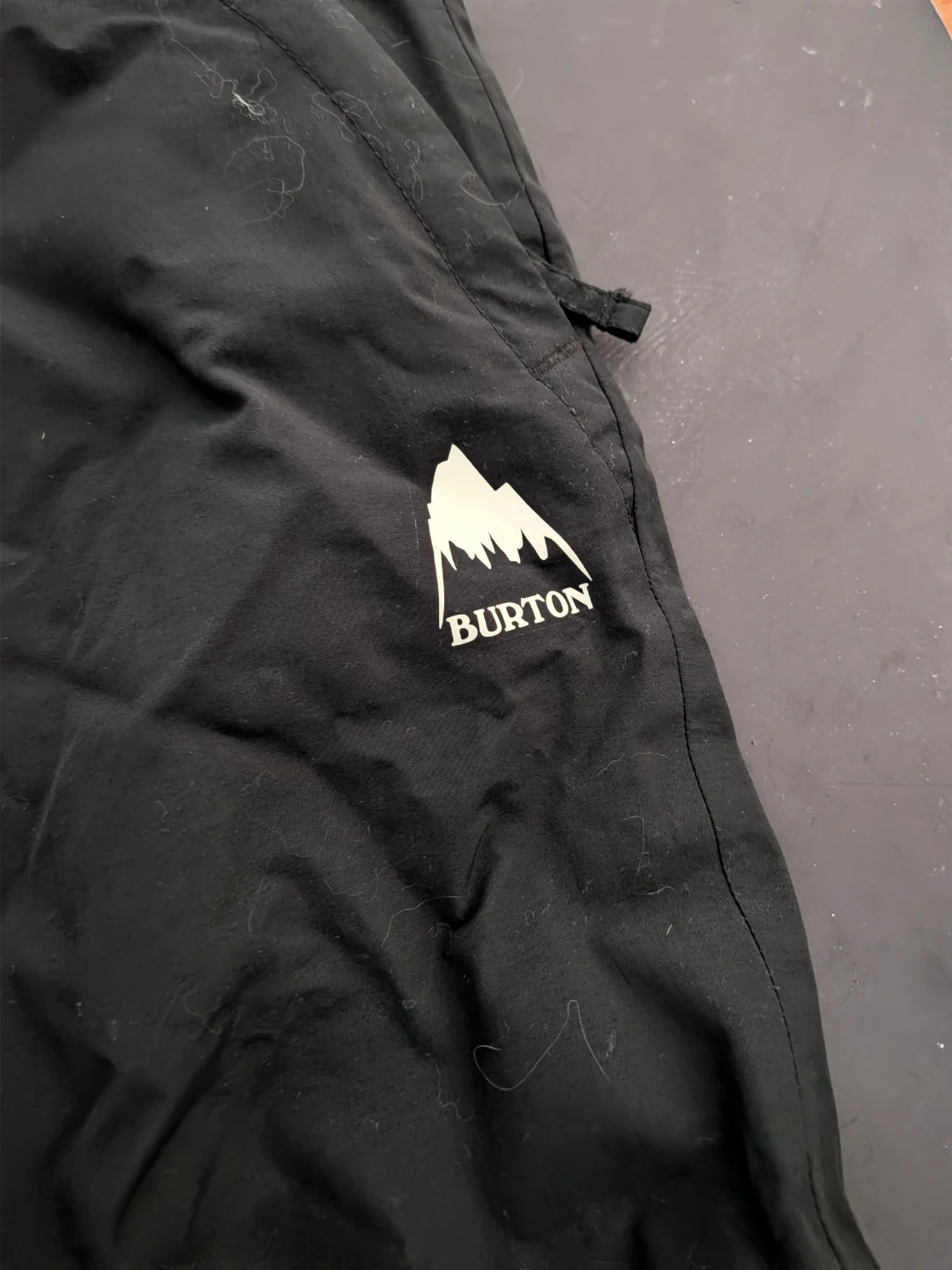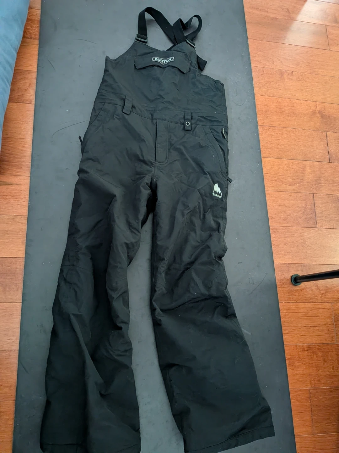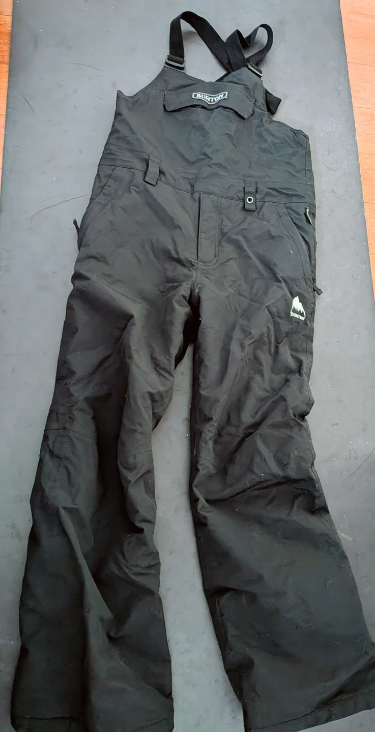 Black Burton snowboard bib pants for staying warm and dry on the slopes. These are durable and designed for winter sports. Keep your gear protected with these practical bib pants!