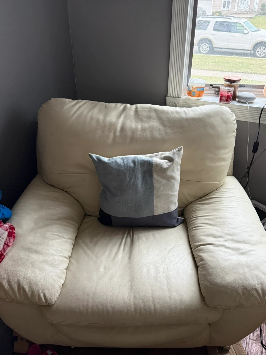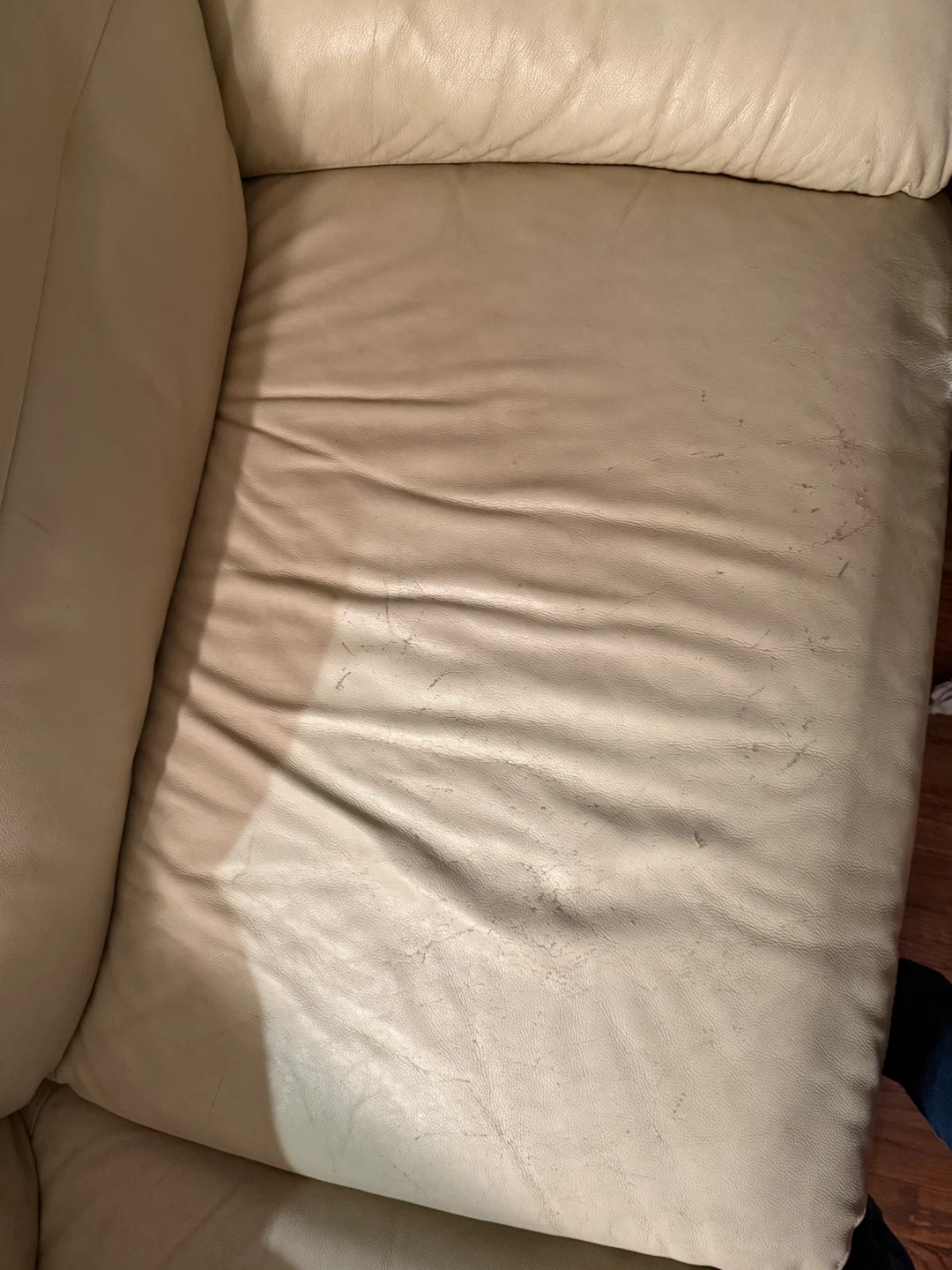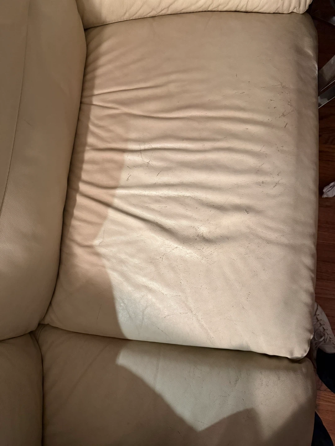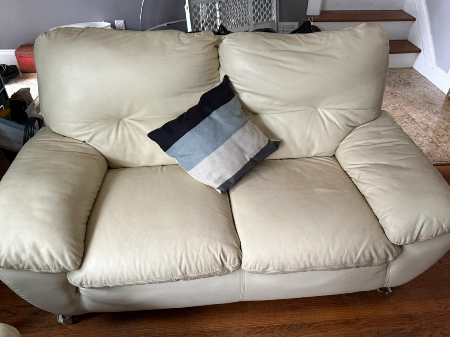 Cream colored leather sofa and loveseat. Both pieces are made of genuine leather. The sofa has three cushions and the loveseat has two. Nice wide comfortable chair. $100 each piece