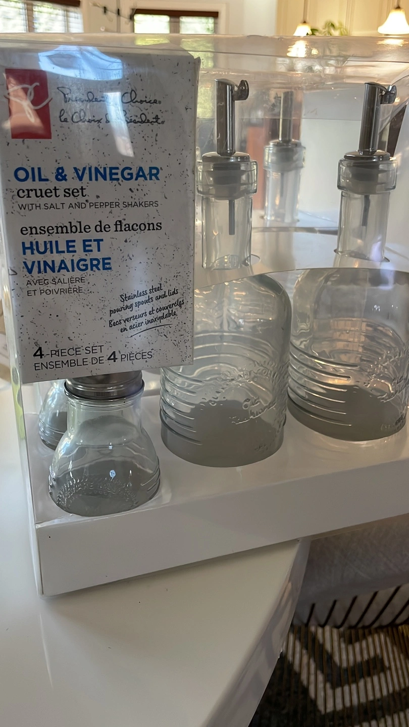 Oil and vinegar cruet set with salt and pepper shakers. Includes four glass bottles with stainless steel pouring spouts and lids. Brand new in original packaging. great Xmas gift.