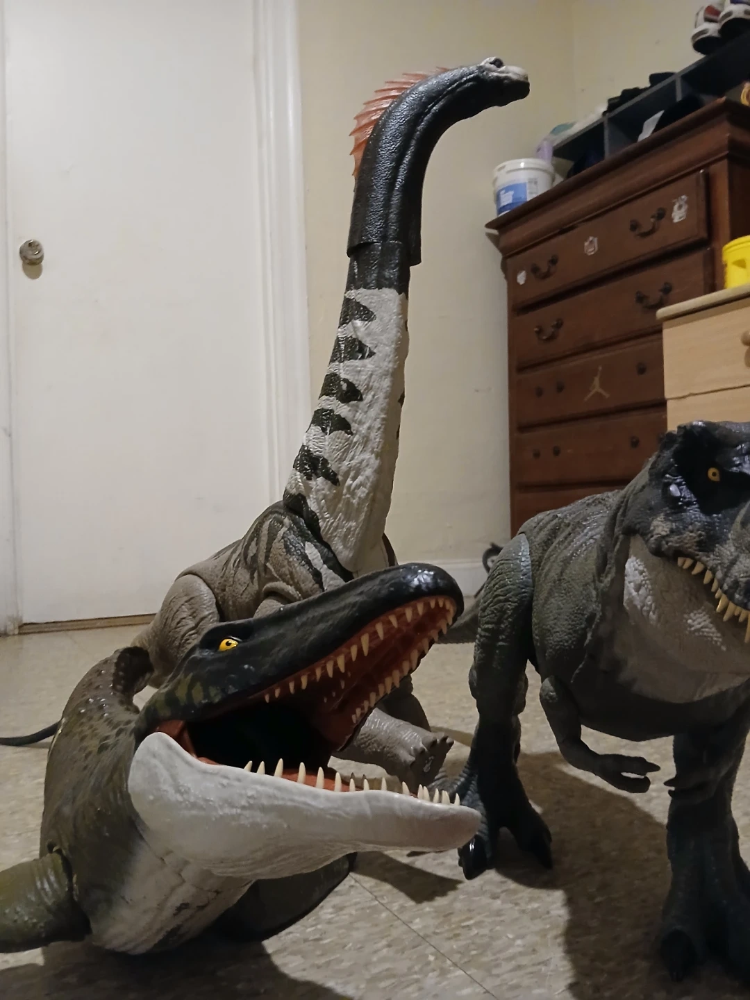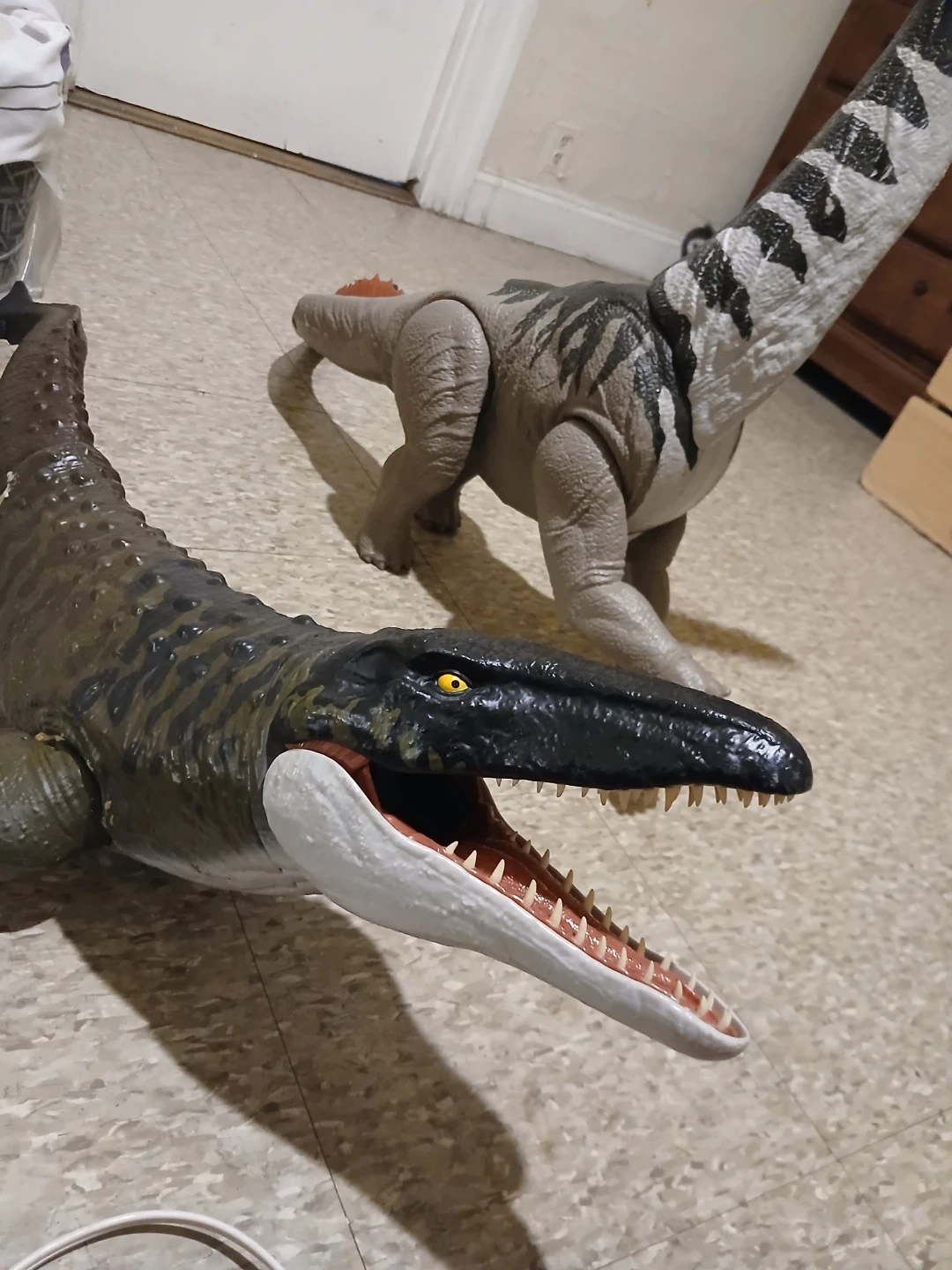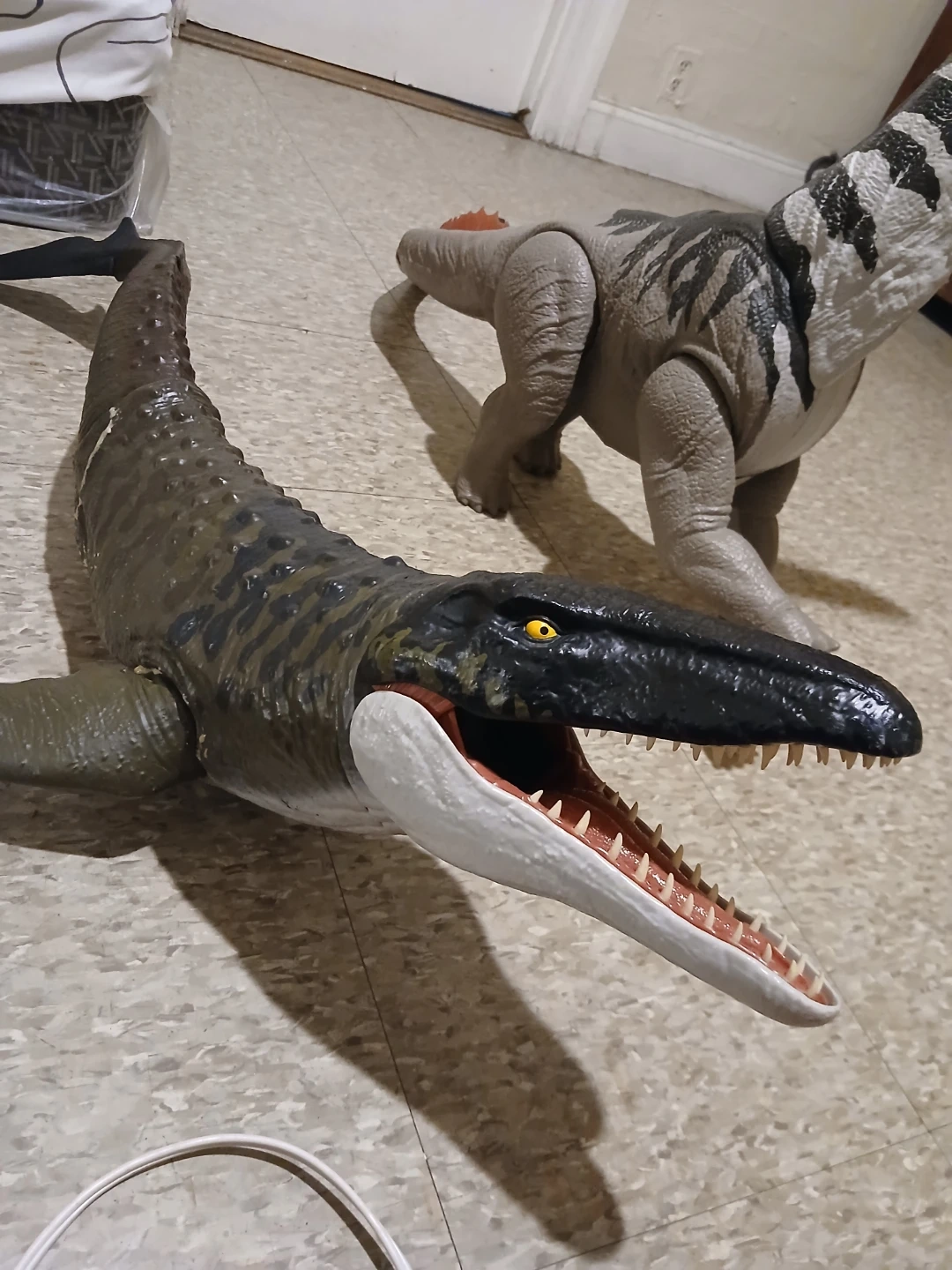 This set includes a Mosasaurus and a Tyrannosaurus Rex dinosaur figure. They're made of durable plastic with realistic details. These figures are great for dinosaur enthusiasts!