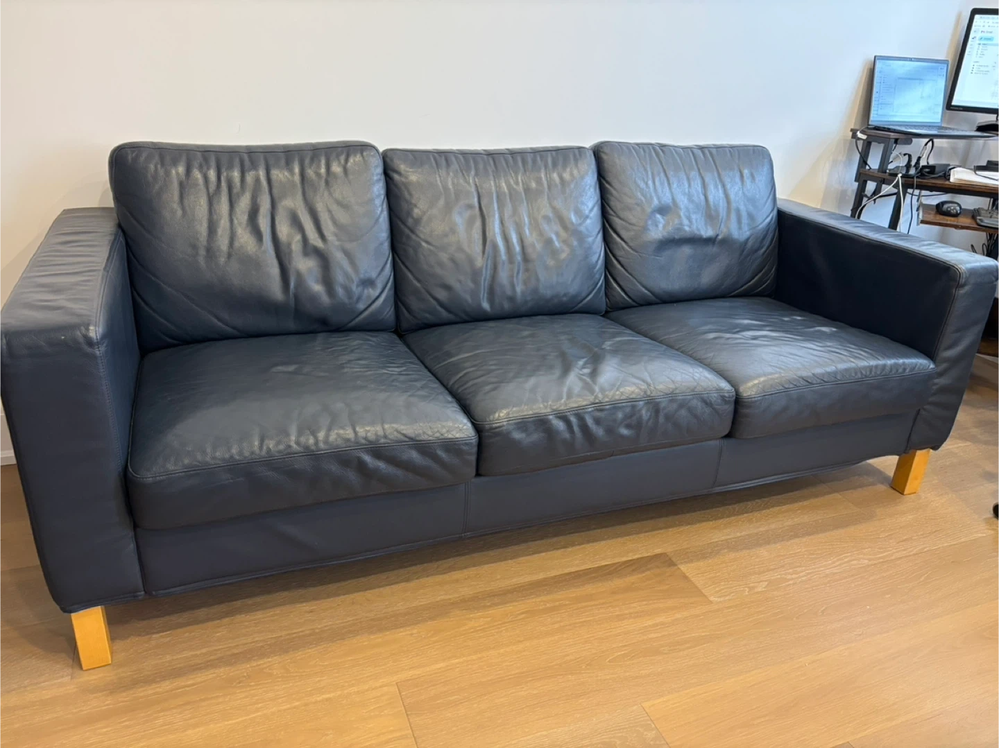 Excellent condition Ikea blue leather couch. The long part can be installed to either side.