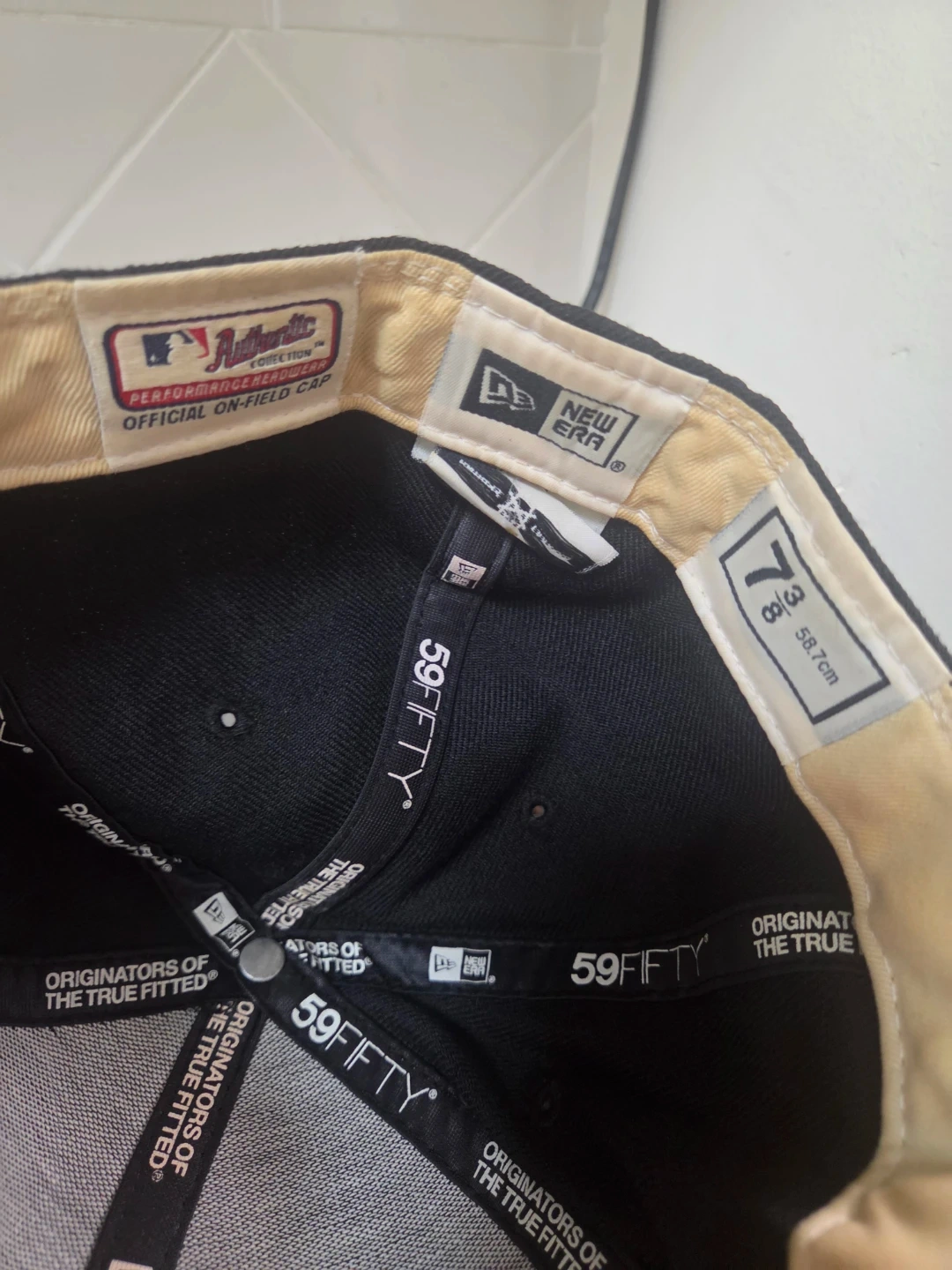 This is a New Era 59FIFTY fitted baseball cap. It features the Tampa Bay Rays 'TB' logo embroidered on the front. The cap is black with a gold brim and official MLB tags. Size 7 3/8 (58.7cm).