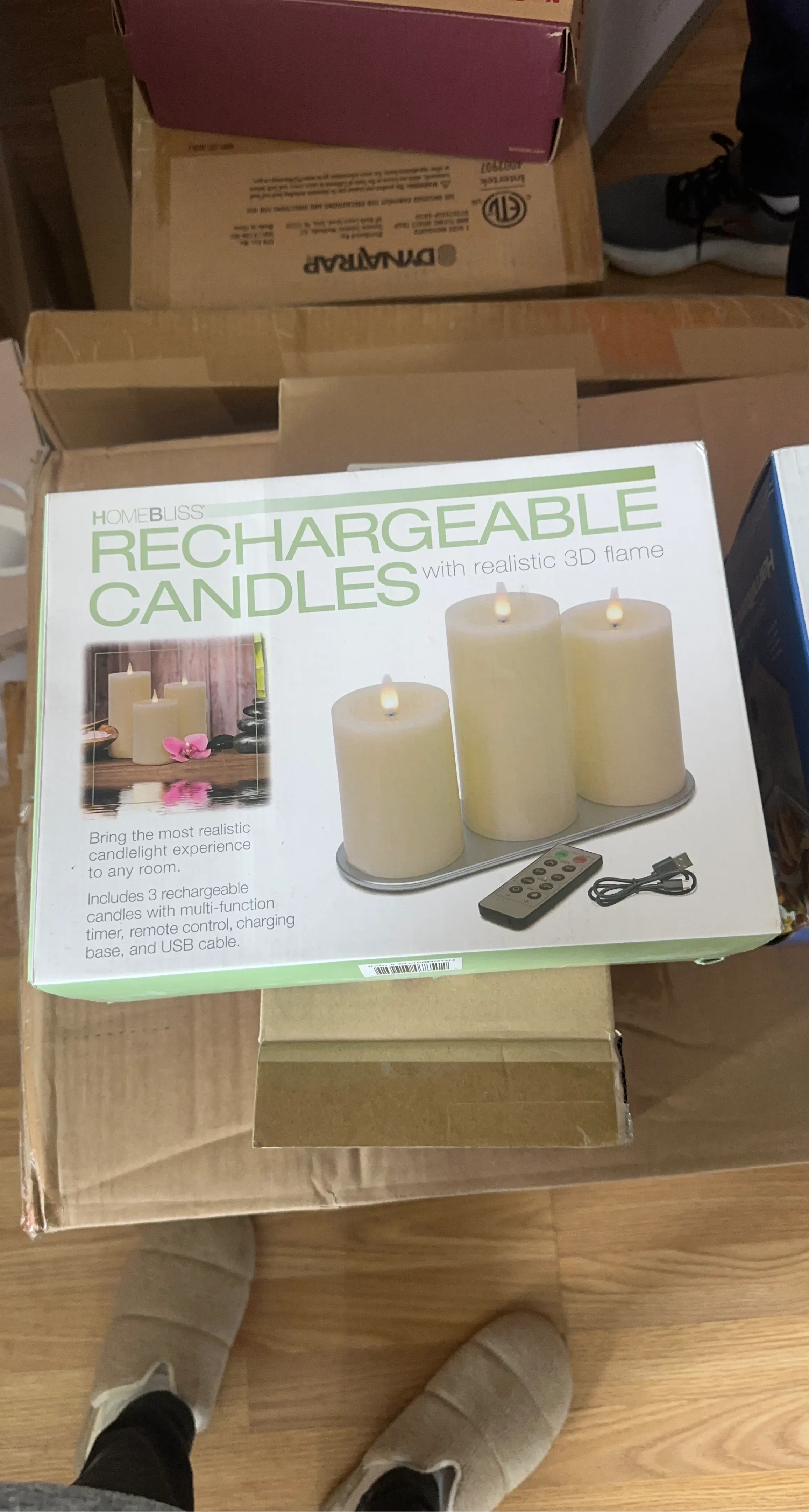 HomeBliss rechargeable candles bring a realistic candlelight experience. Includes 3 candles, multi-function timer, remote control, charging base, and USB cable. They're designed to add ambiance to any room!