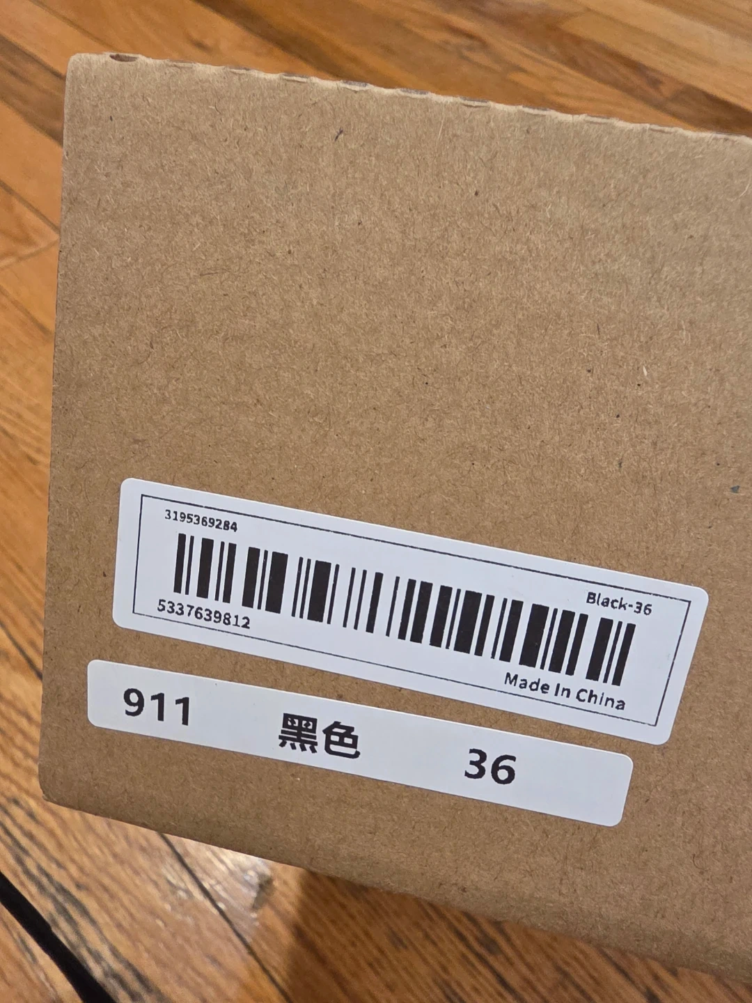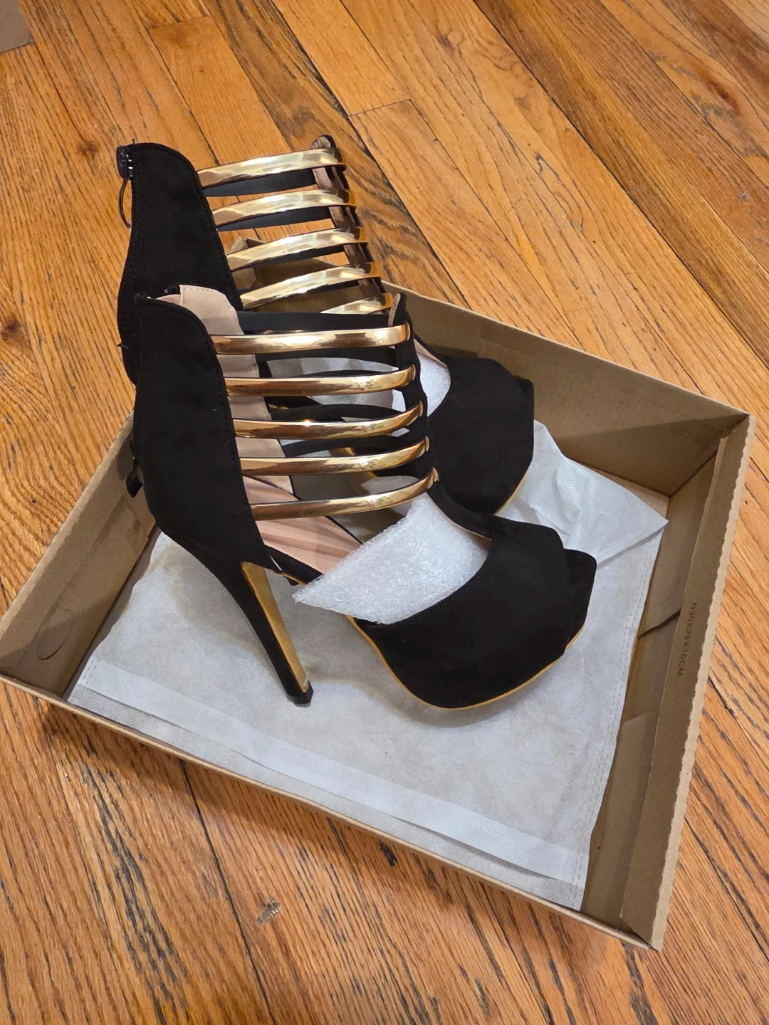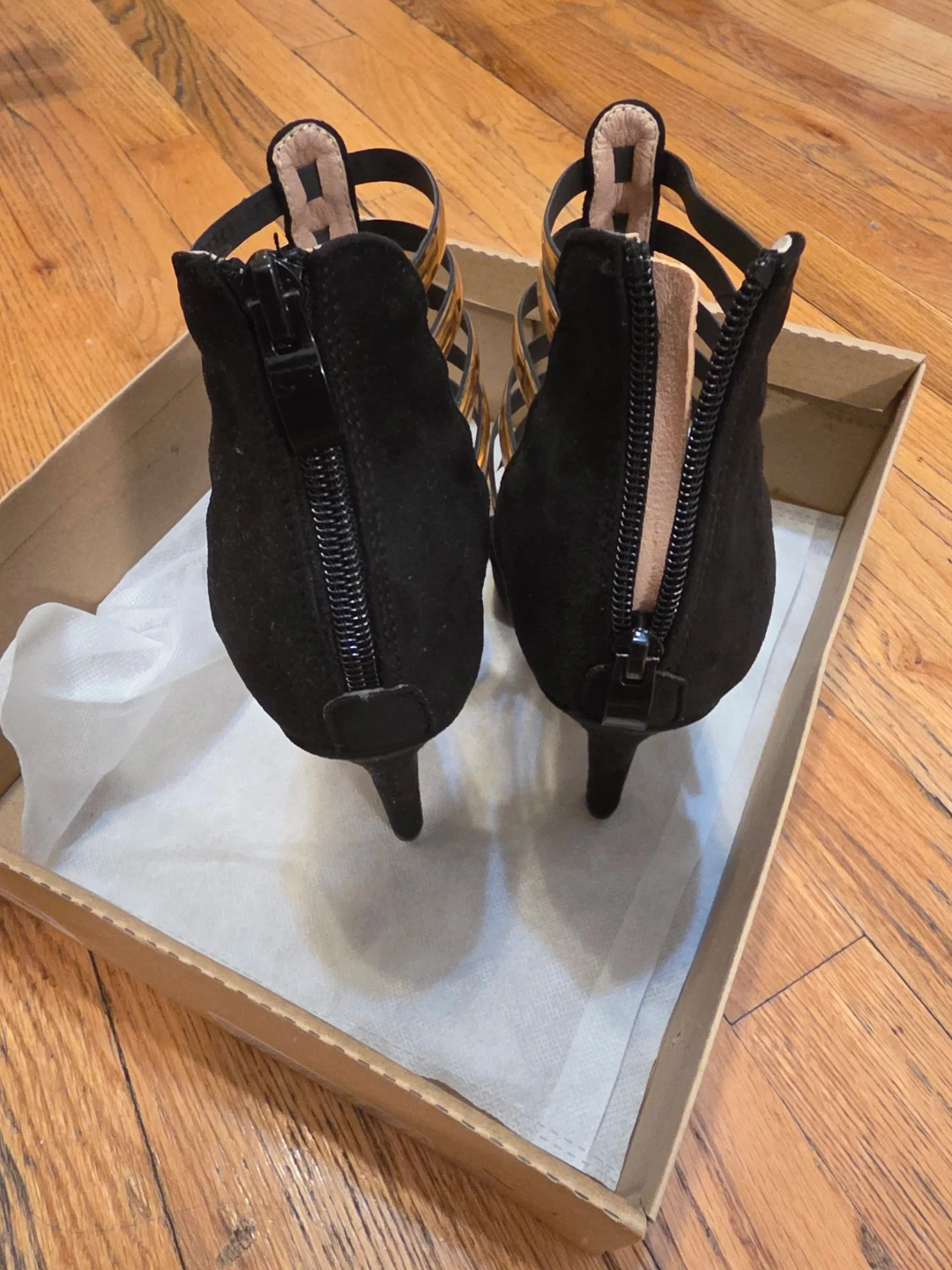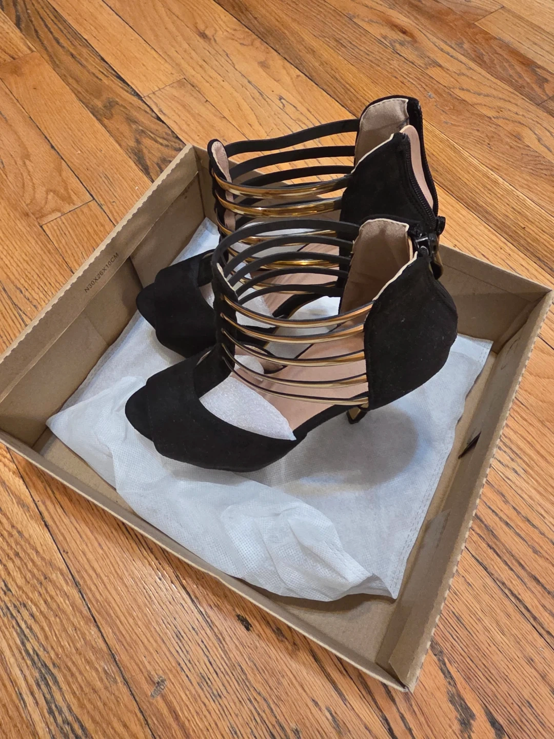 Stylish black heels with a strappy design featuring gold accents. These open-toe heels have a zipper closure in the back. Made in China, size 36. US size 6