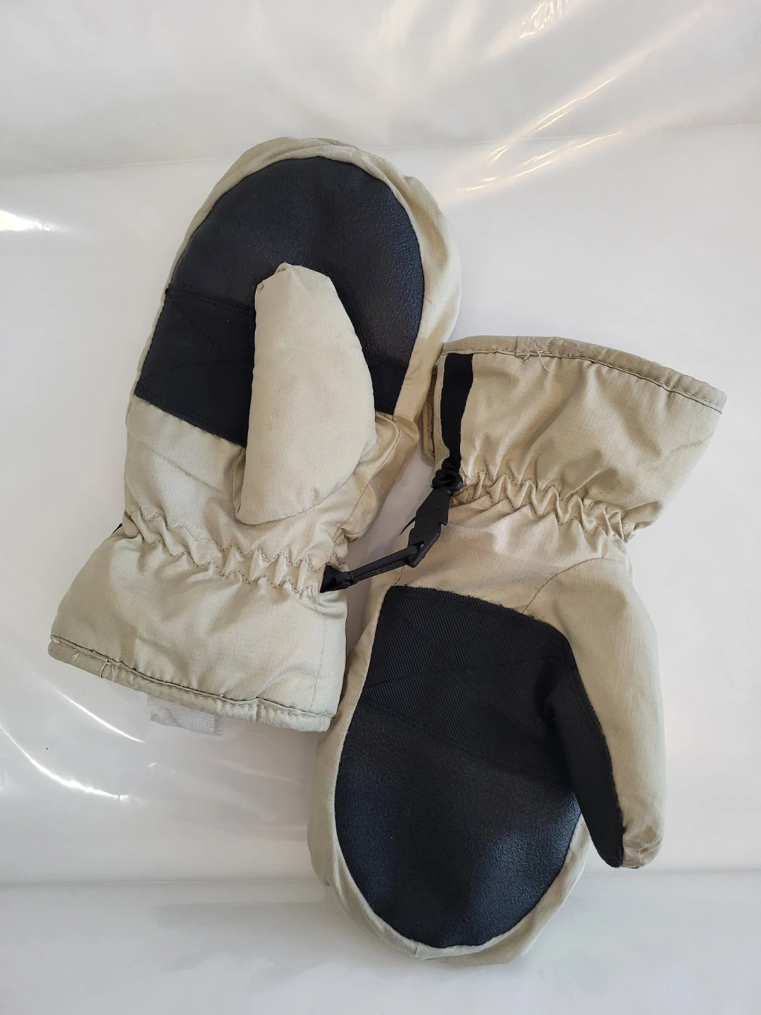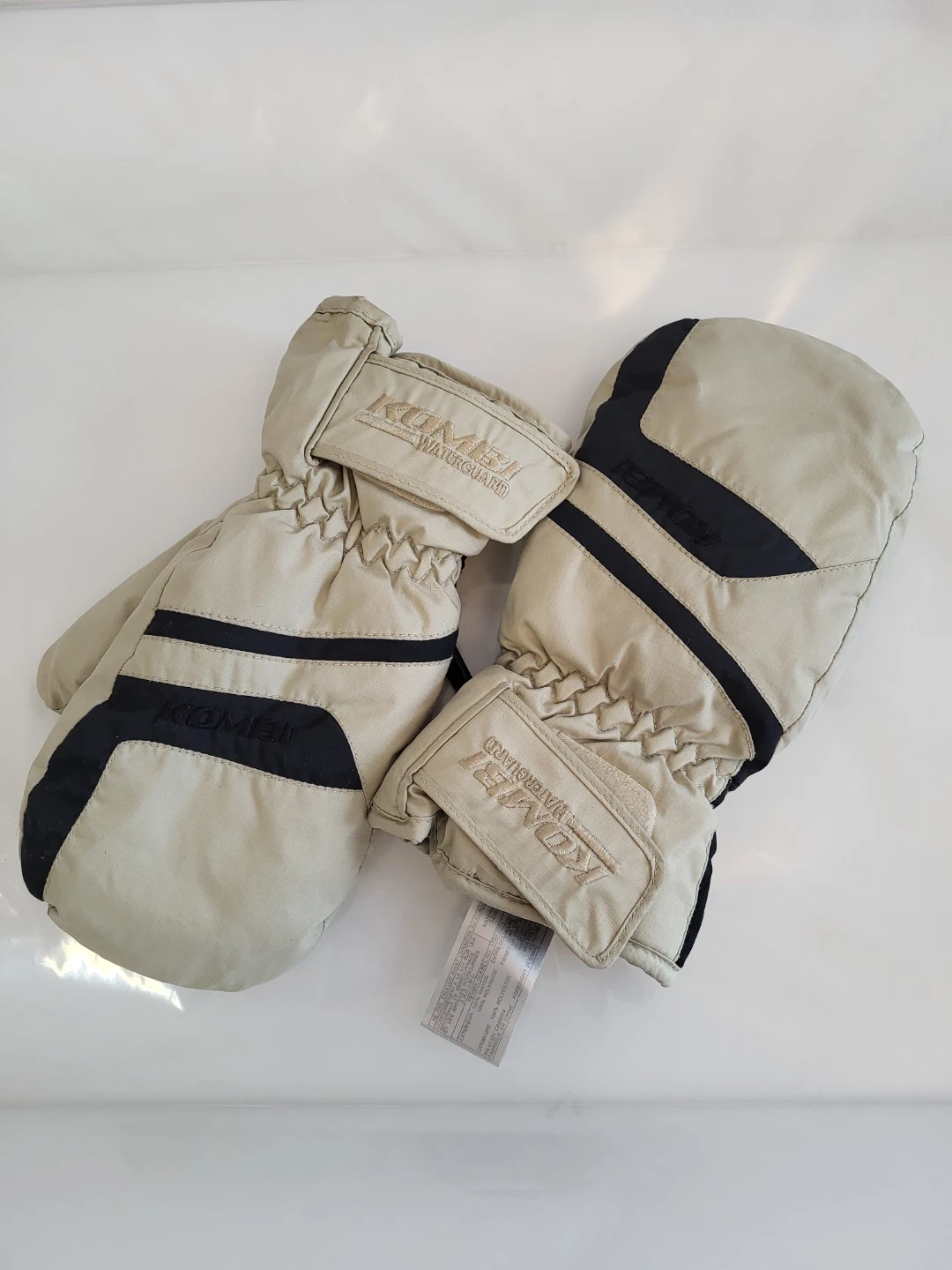 Kombi Waterguard mittens in a beige and black colourway. These mitts are designed for warmth and protection in cold weather. They feature adjustable wrist straps for a snug fit.