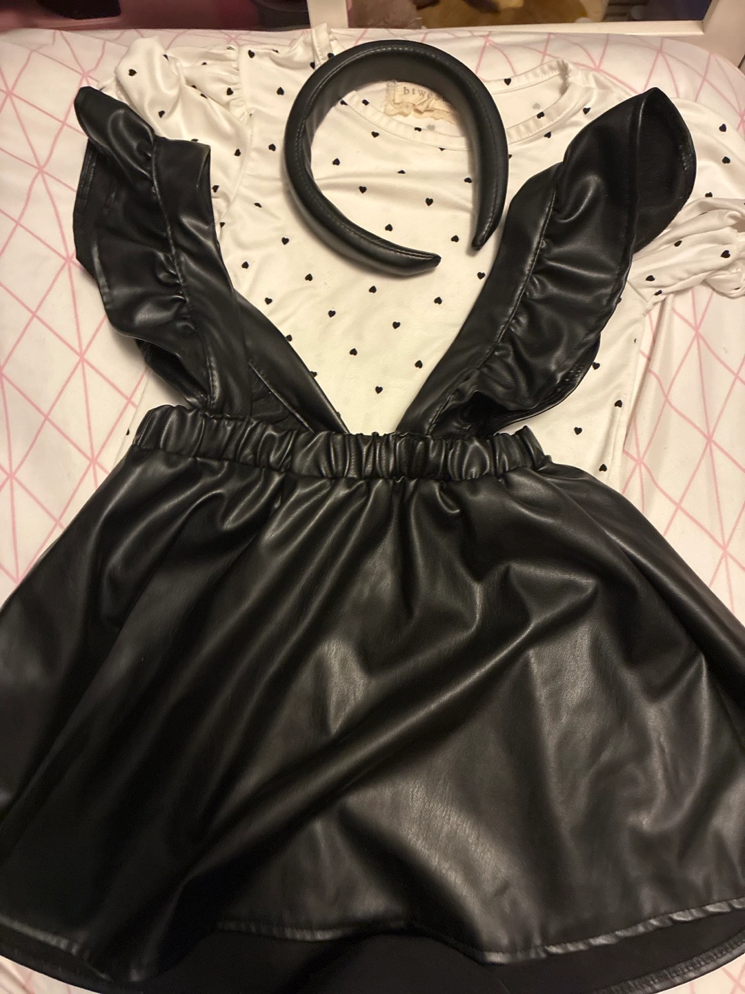 Adorable girls outfit. Features black faux leather jumper and a white top with black hearts. Includes a black headband. Great for special occasions or everyday wear.
