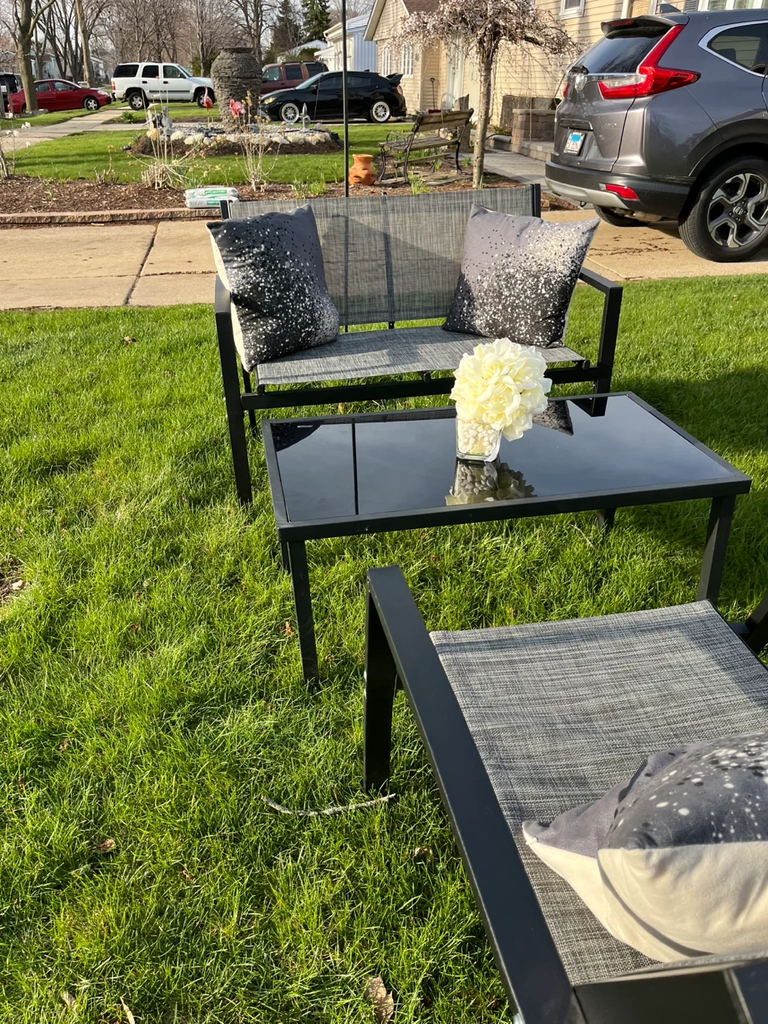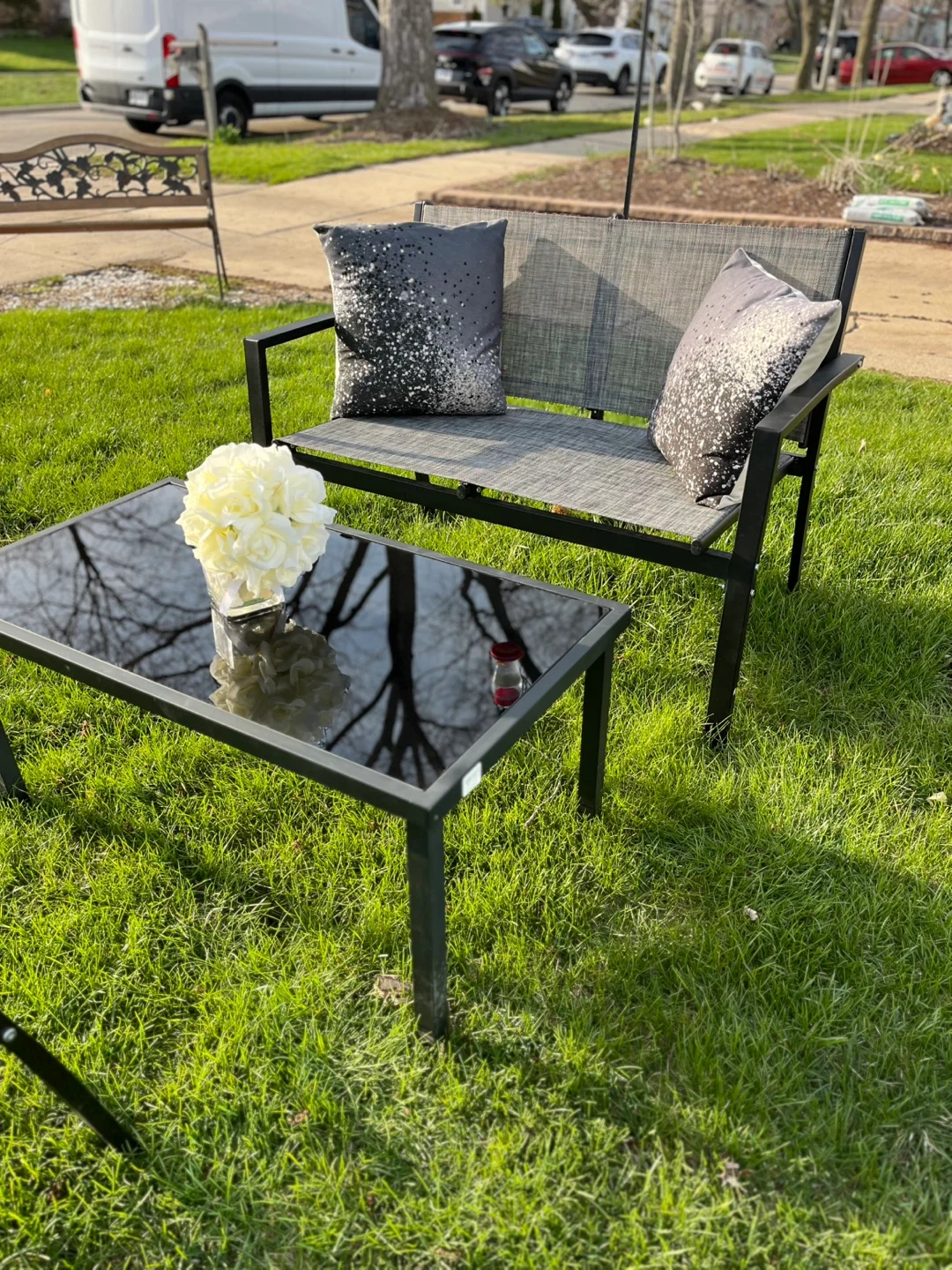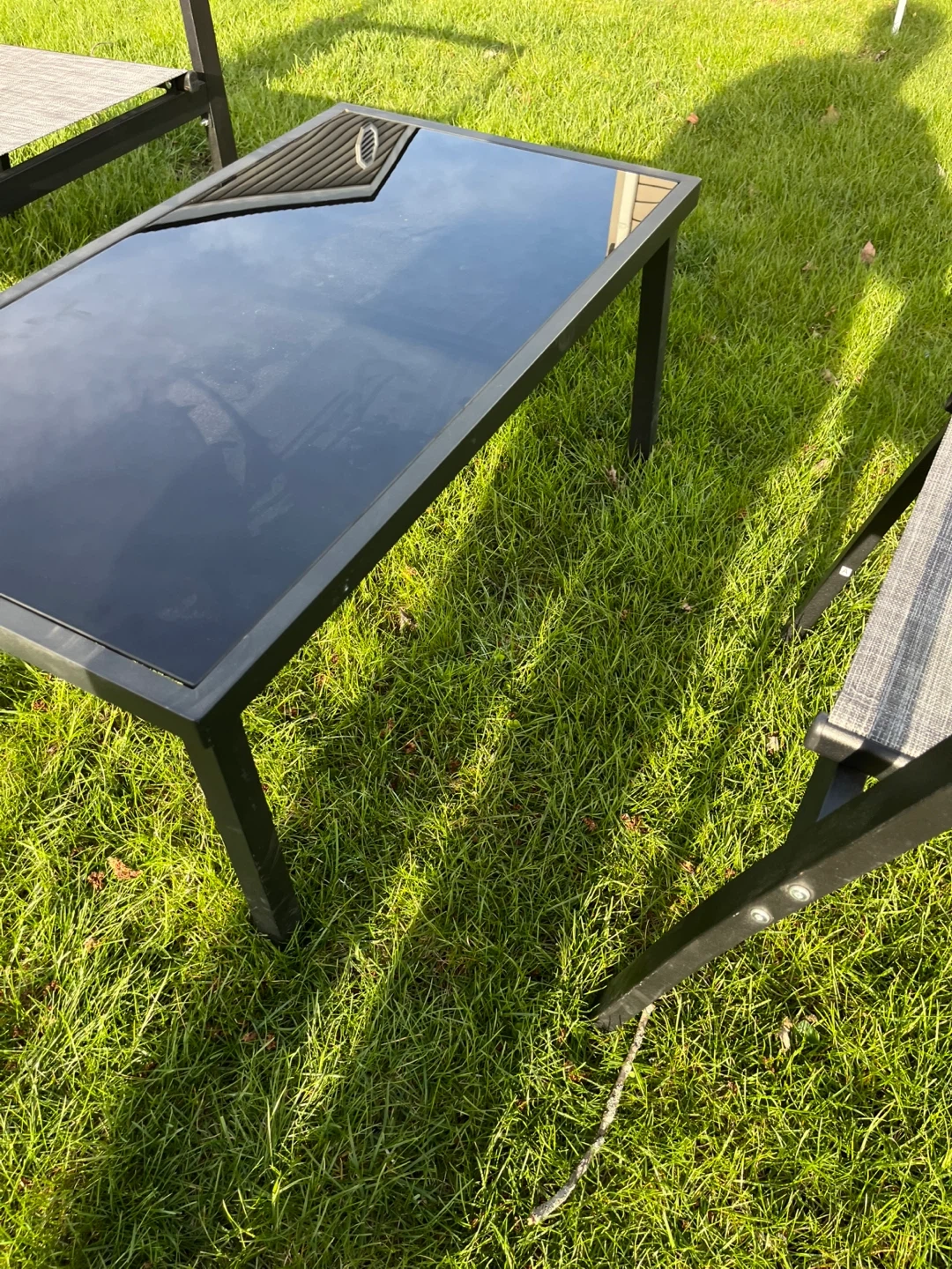 This set is one table features a sleek black glass top with a durable metal frame. New 3 pieces set no cushions included, Its compact size makes it suitable for patios or small outdoor spaces. Easy to wipe clean!