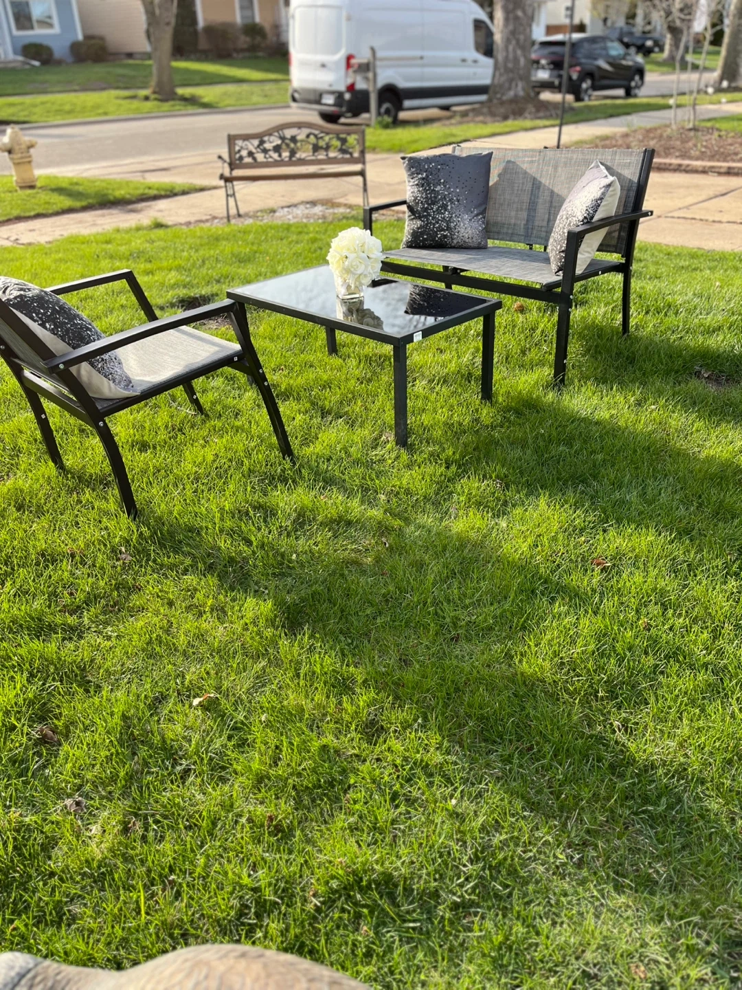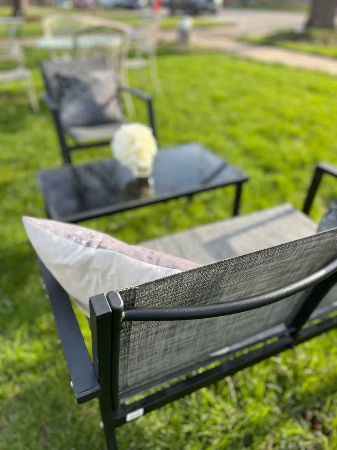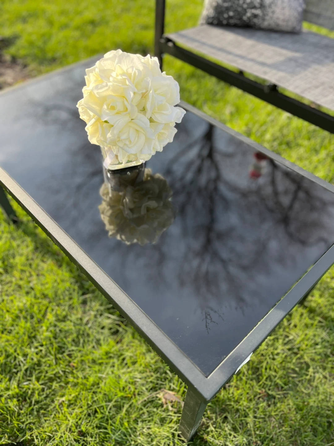 This set is one table features a sleek black glass top with a durable metal frame. New 3 pieces set no cushions included, Its compact size makes it suitable for patios or small outdoor spaces. Easy to wipe clean!
