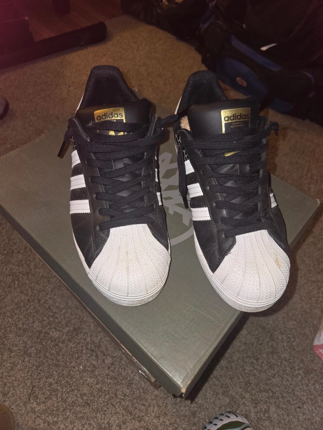 Classic Adidas Superstar sneakers. Black leather with white stripes and shell toe. Features a snakeskin-patterned accent on the heel.
