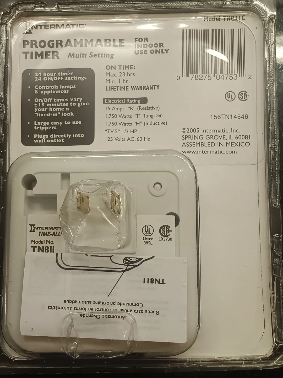 This Intermatic programmable timer features 24 ON/OFF settings and a lived-in look. It controls lamps and appliances, offering on/off times in 15-minute increments. Plugs directly into a wall outlet. Electrical rating: 15 Amps, 1,750 Watts "R" (Resistive), 1,750 Watts "I" (Inductive), 1/3 HP. Operates on 125 Volts AC, 60 Hz.