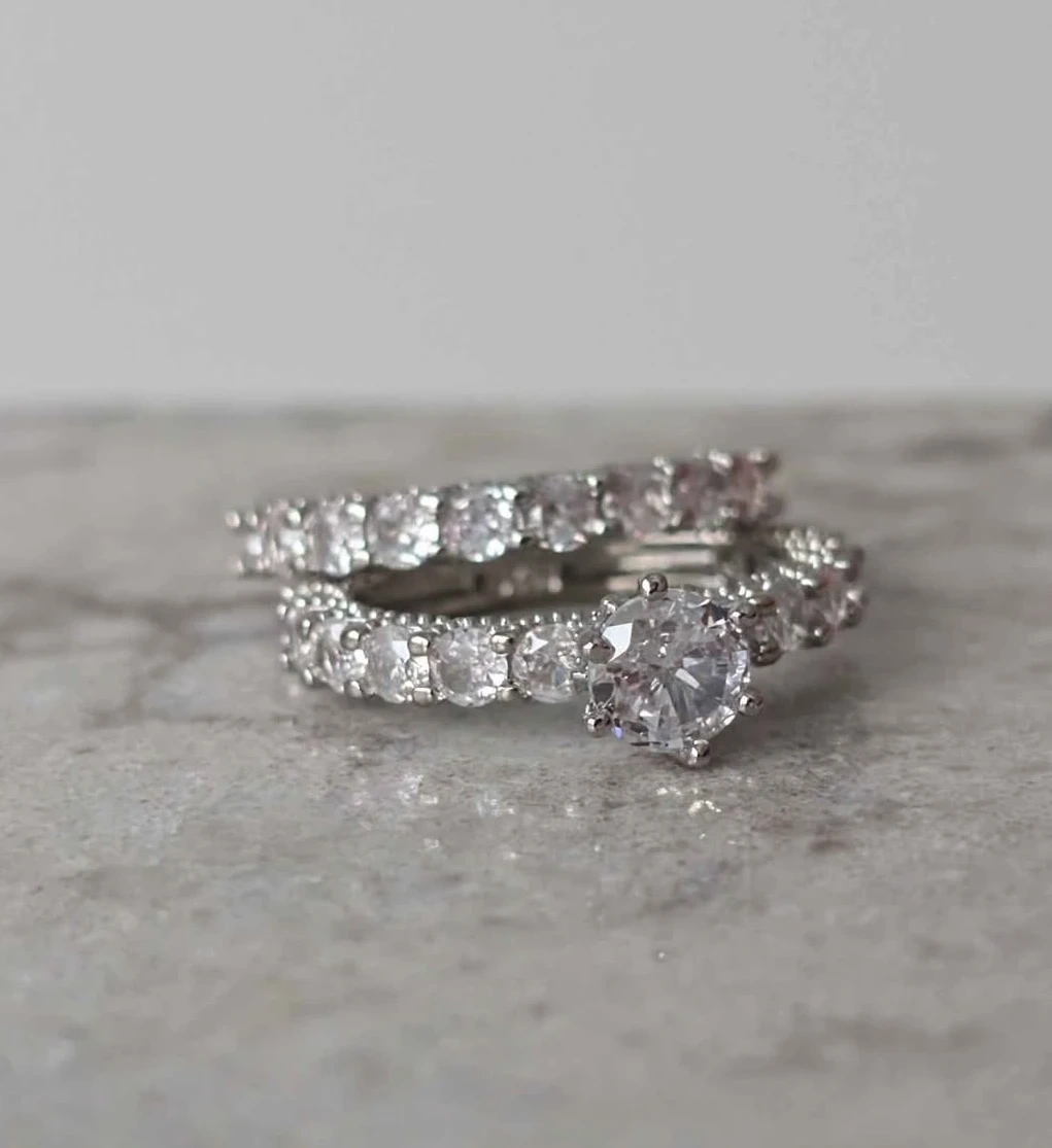 This is a set of two rings, one with a large central stone and the other with a band of smaller stones. They're made of silver-toned metal and are encrusted with clear, sparkling stones. This set would be a lovely addition to any jewellery collection!
