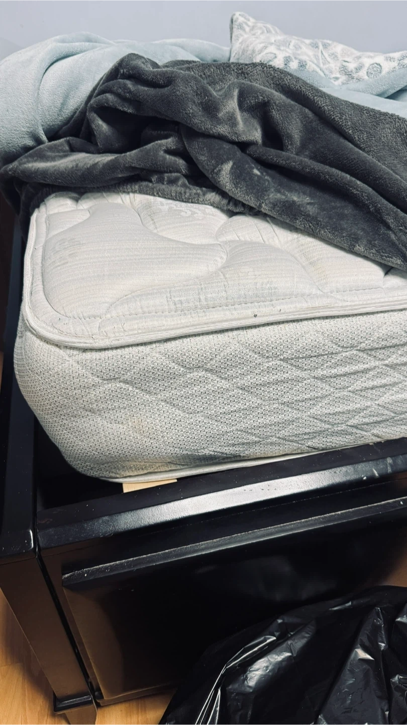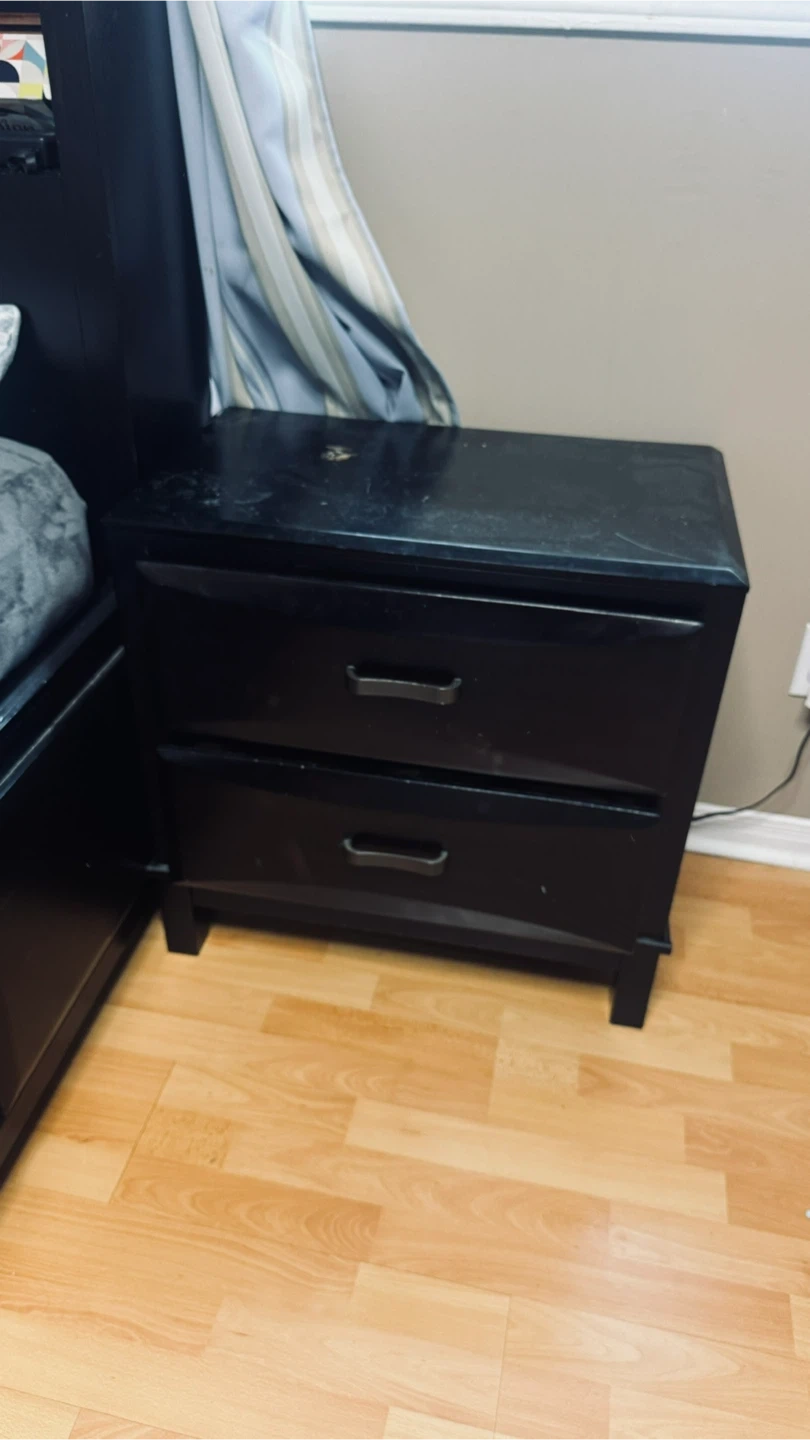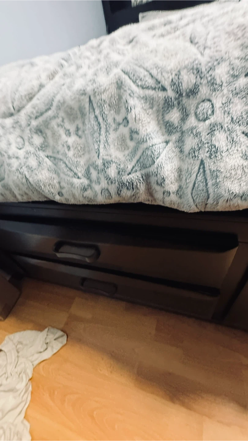 Bed has storage headboard, 2 storage drawers at the end of bed and 1 big drawer on one side. Comes with dresser, mirror and nightstand. Pillow top mattress included if wanted (twin) . Has some scratches but can be easily covered with furniture repair markers or light sanding. Super sturdy. Smoke free bug free home. You need to pick up asap. Will need a truck