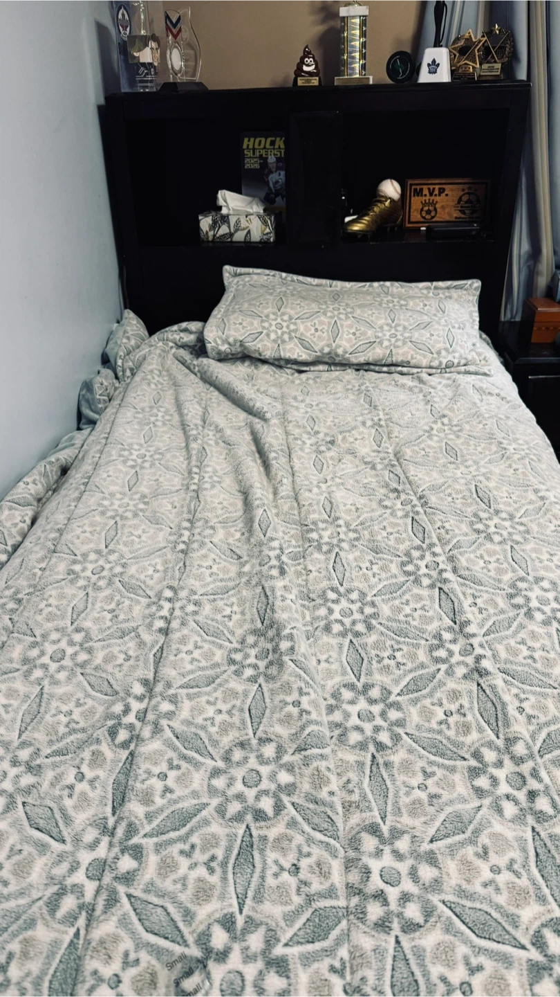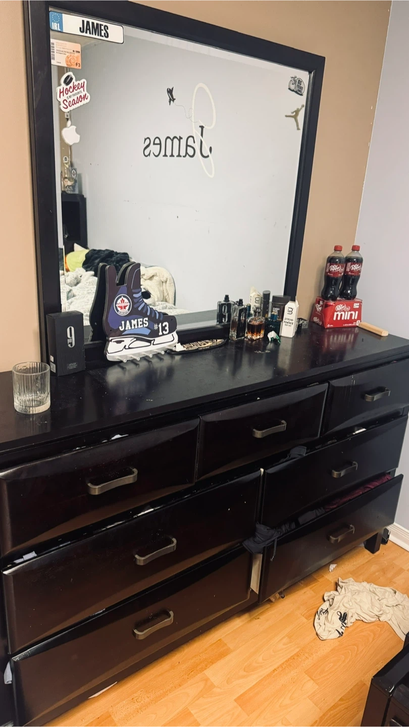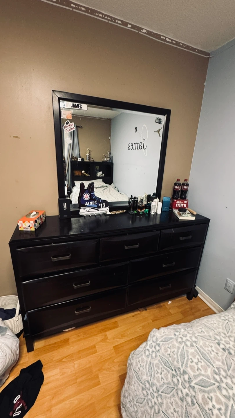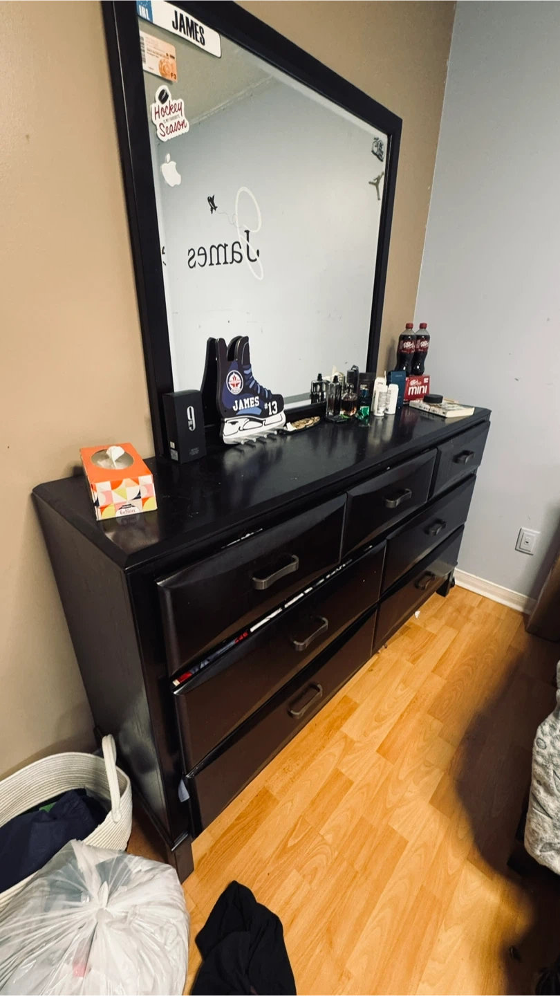 Bed has storage headboard, 2 storage drawers at the end of bed and 1 big drawer on one side. Comes with dresser, mirror and nightstand. Pillow top mattress included if wanted (twin) . Has some scratches but can be easily covered with furniture repair markers or light sanding. Super sturdy. Smoke free bug free home. You need to pick up asap. Will need a truck