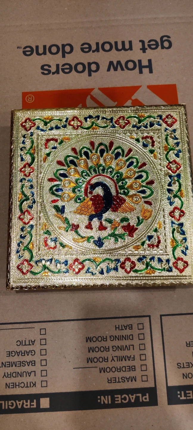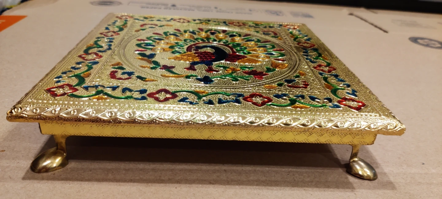 This is a decorative golden stand featuring a vibrant peacock design. It's made of metal with colourful enamel accents. The stand has small legs for elevation. Perfect for ganapati idol