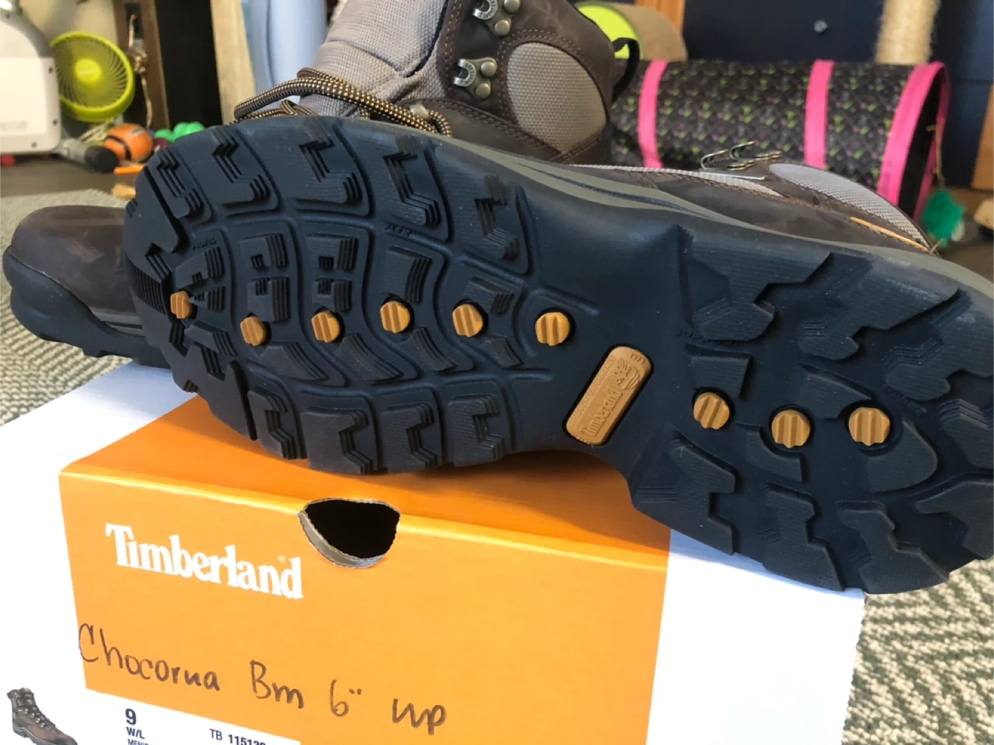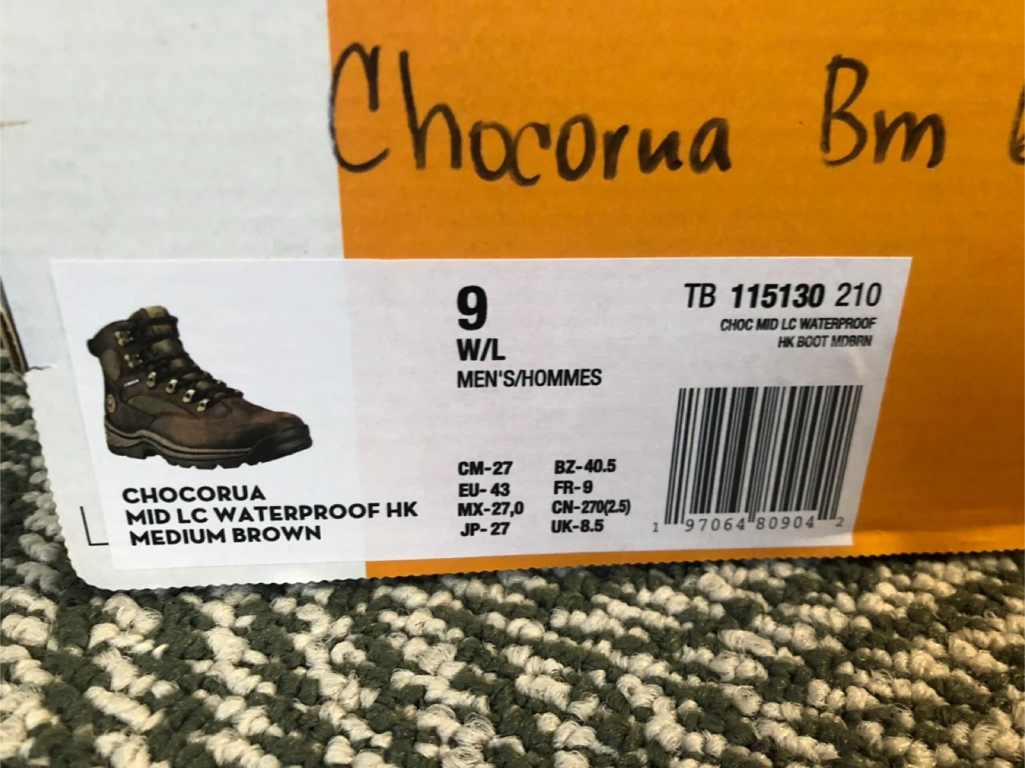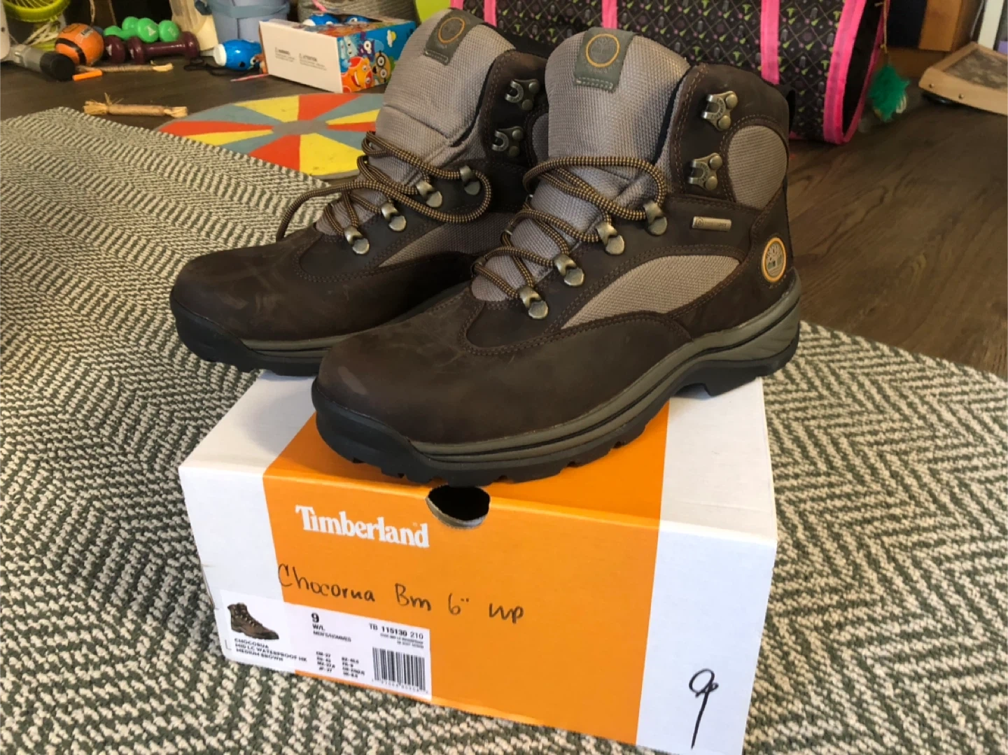 Timberland Chocorua Mid LC Waterproof hiking boots. These men's boots are size 9 W/L and medium brown. They offer great ankle support for trails. The waterproofing keeps your feet dry on wet hikes!paid $149 plus tax at always discount boots on kingsway and knight st , never wear sell for $100