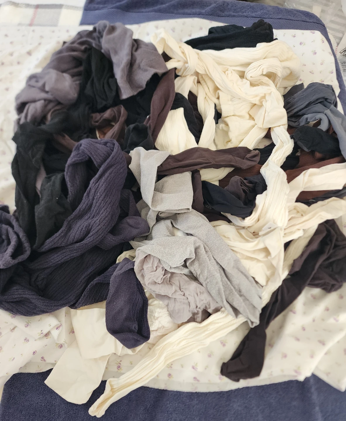 A collection of various tights in multiple colors and textures. Includes sheer, opaque, and ribbed styles.
