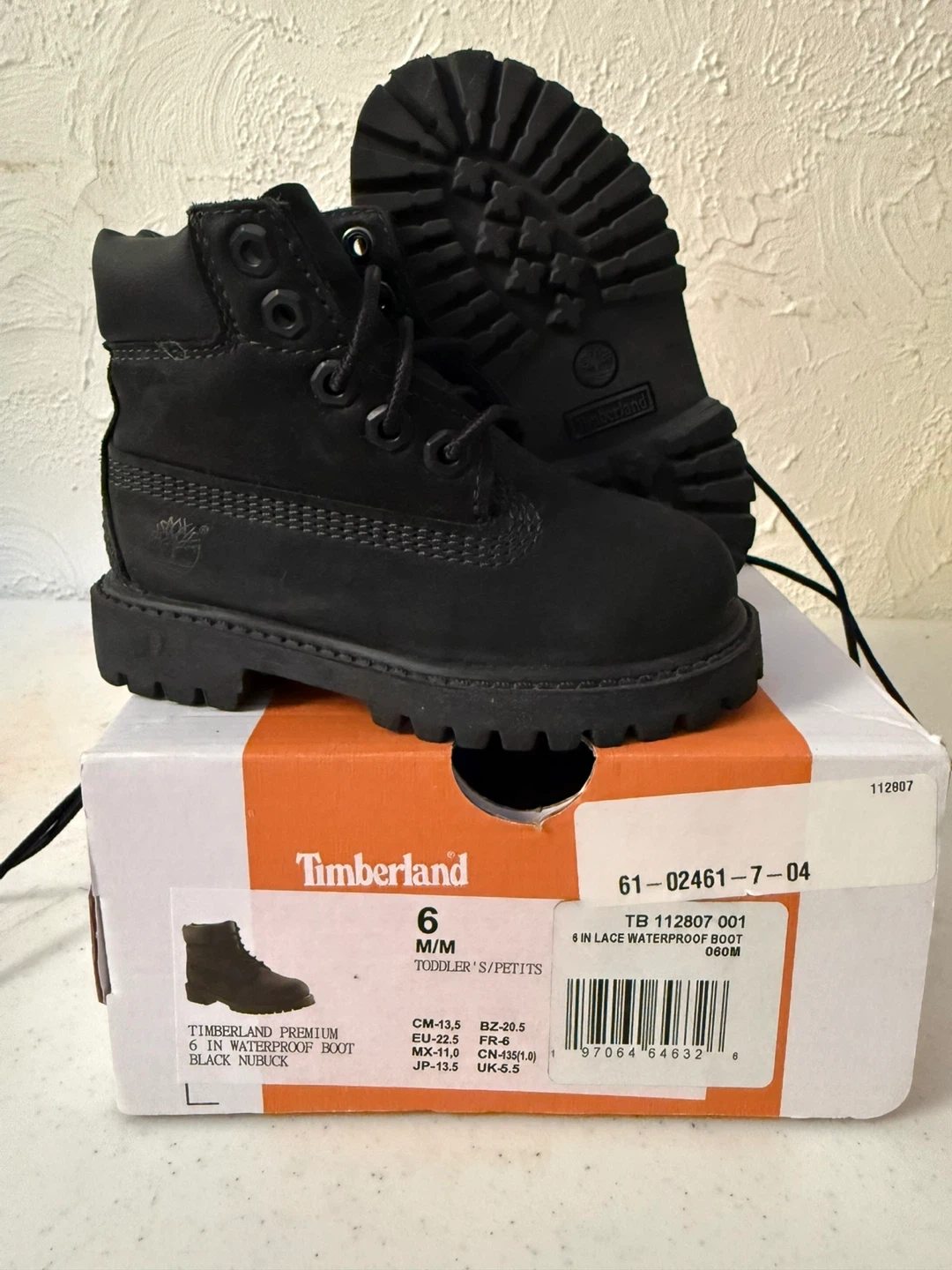 Timberland Premium 6-inch waterproof lace-up boots for toddlers. Black nubuck material. Includes original box. Perfect for keeping little feet dry and warm!