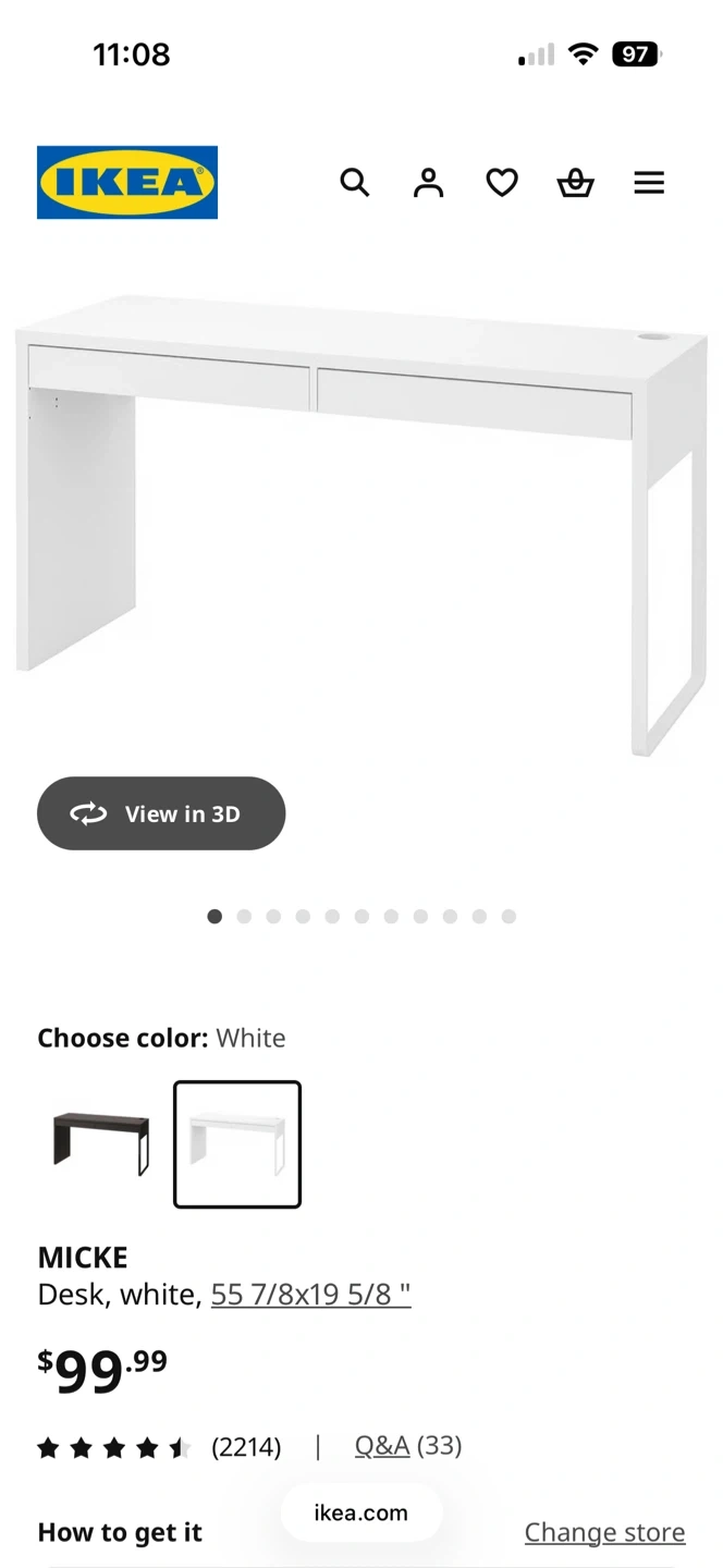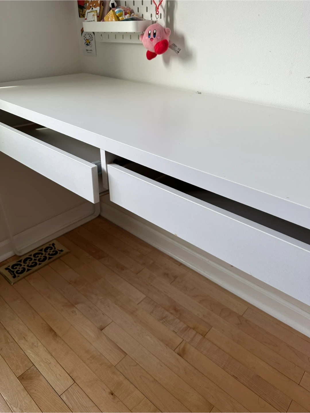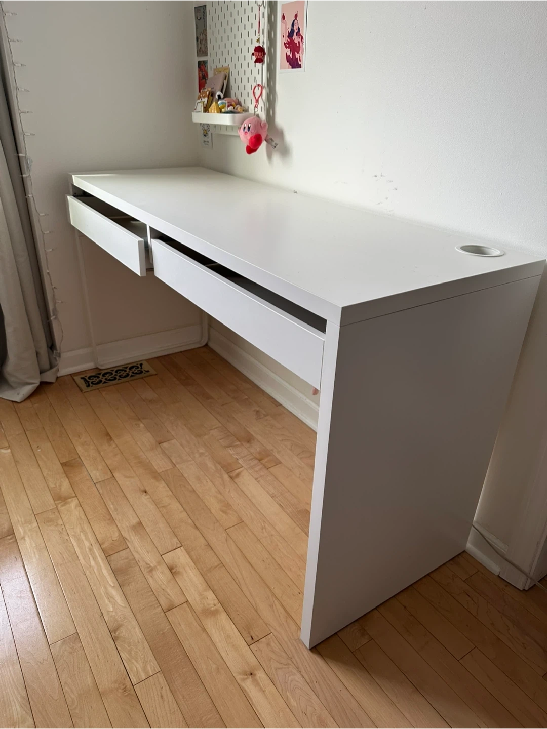 Selling a white IKEA MICKE desk. It has a clean and simple look that fits just about anywhere. The desk measures 55 7/8x19 5/8 ". It features drawers for storage and a cable outlet in the back to keep cords organized. Drawers needs to be fixed