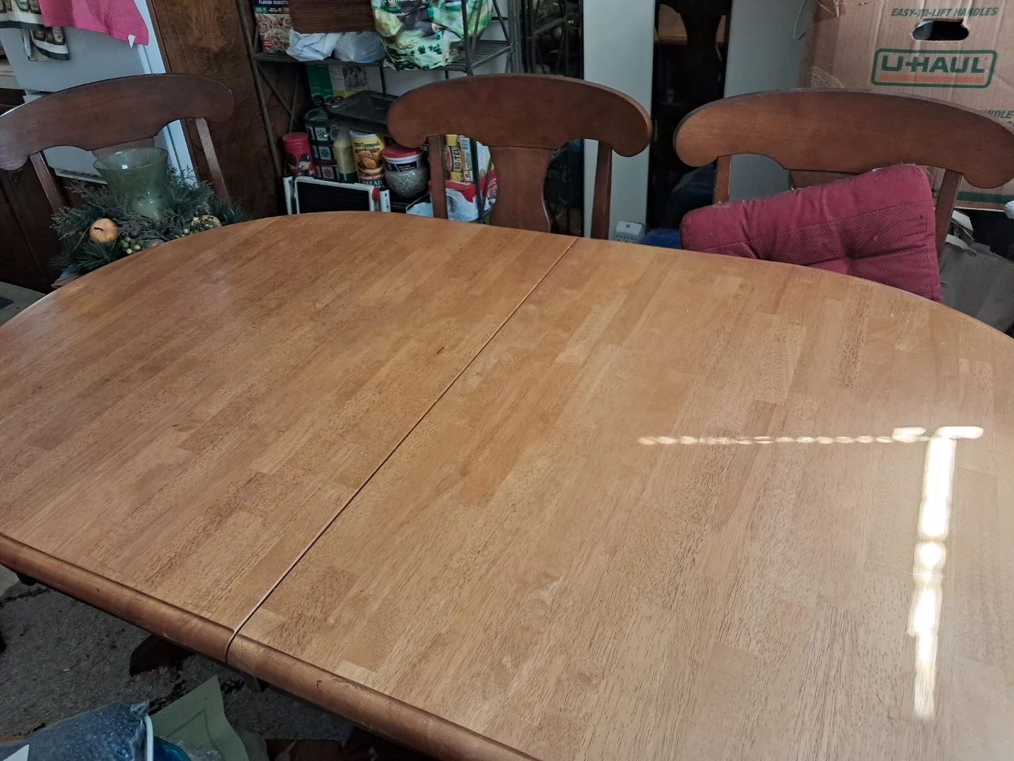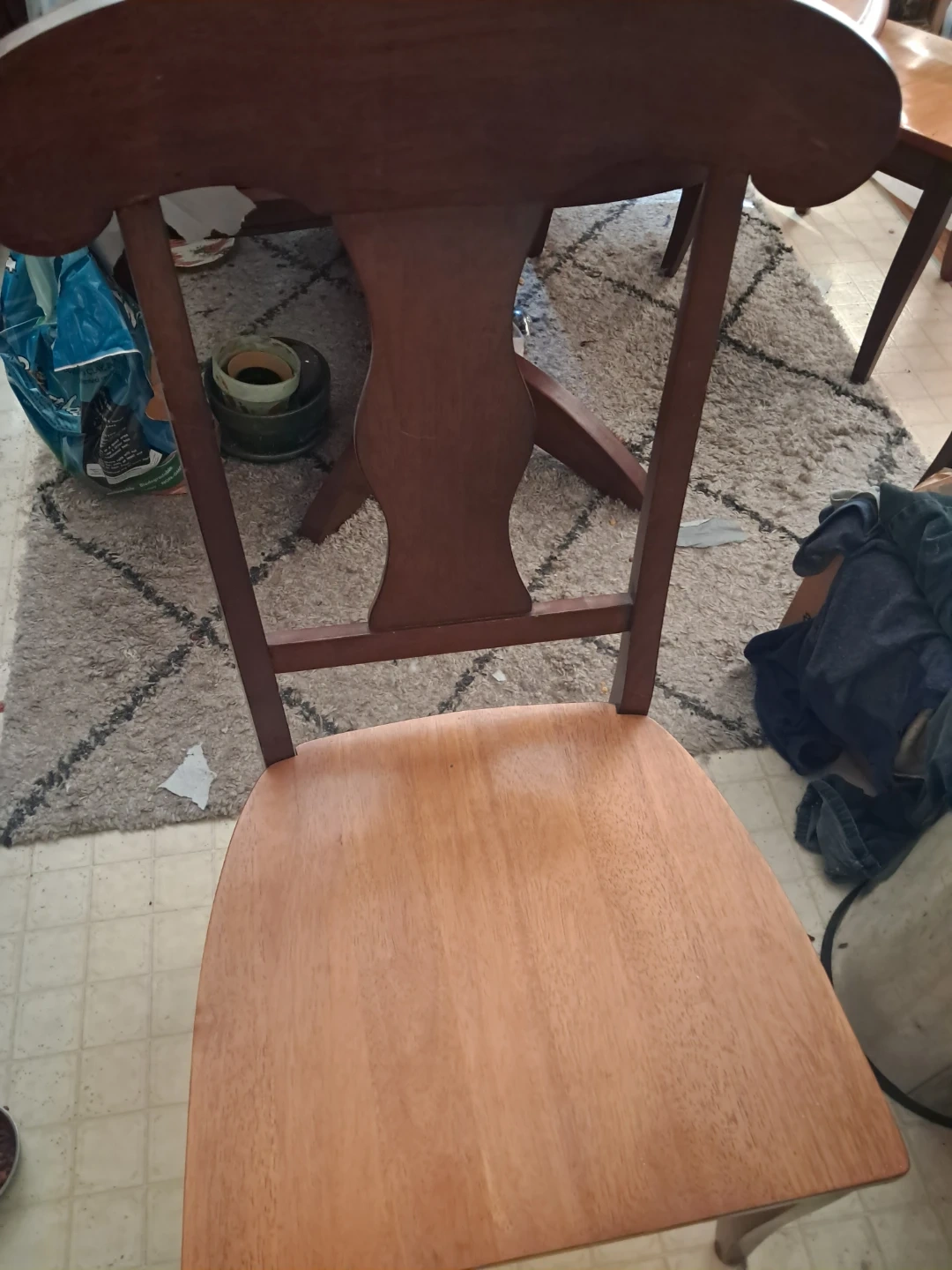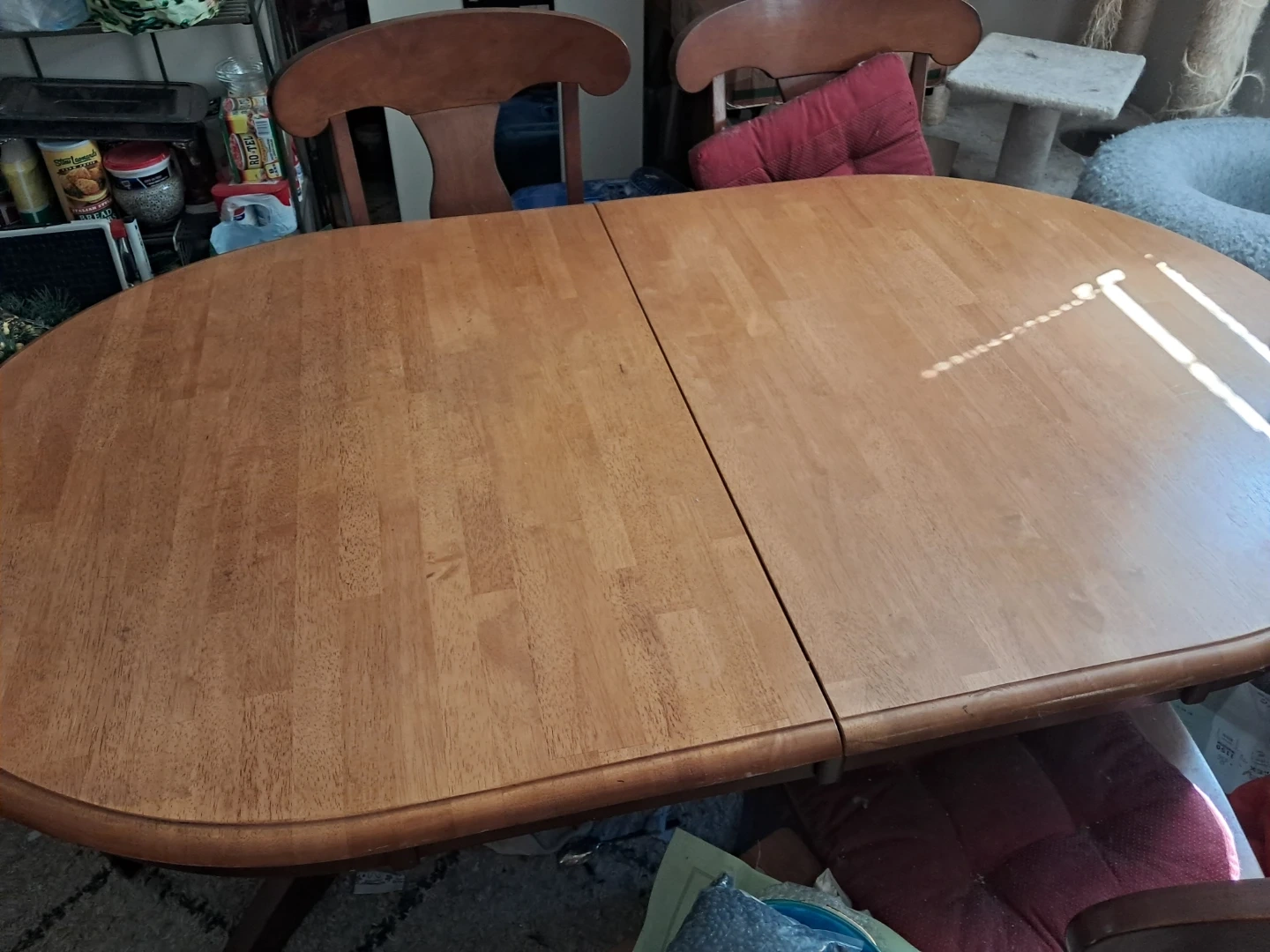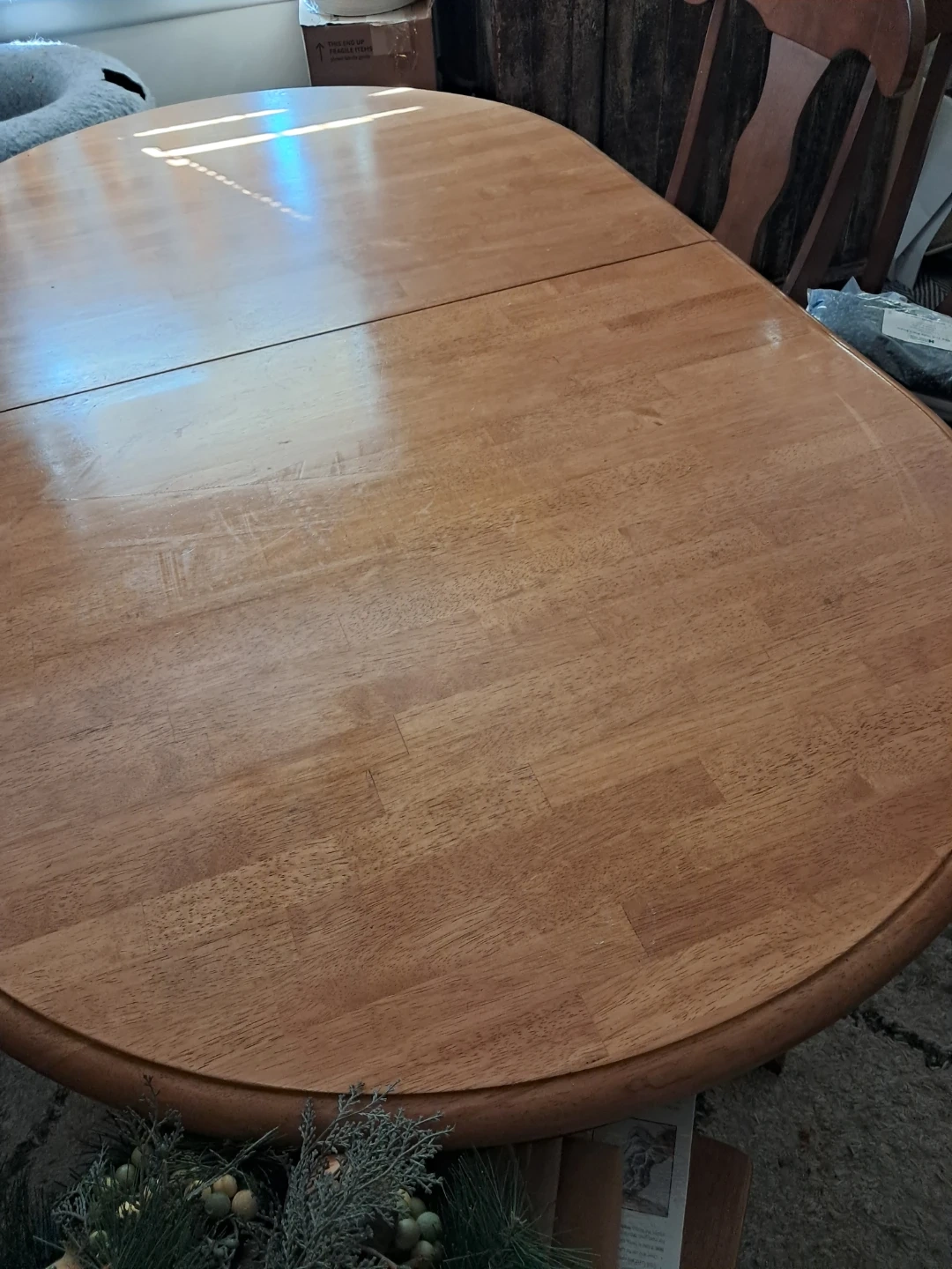 This is a light-colored wooden dining table with an extension leaf. It's oval-shaped with a natural wood finish. It has a smooth surface. It's legs are darker wood. Six (6) matching chairs.