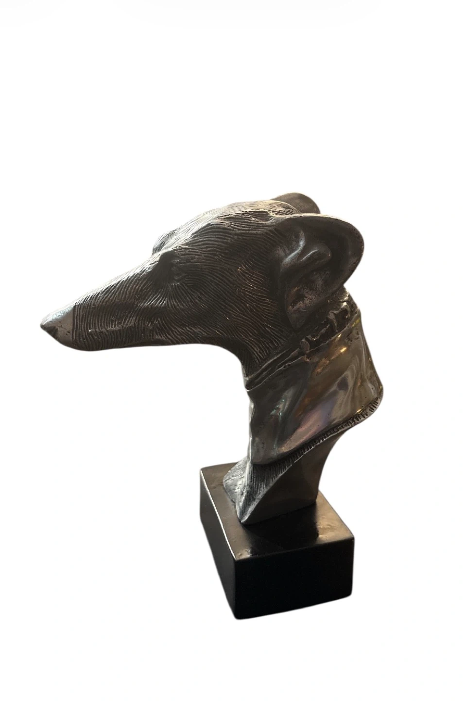 A decorative sculpture featuring the head and neck of a greyhound dog. It's made of aluminum metal with a brushed finish and mounted on a black rectangular base. This piece would add a touch of elegance to any shelf or mantel.