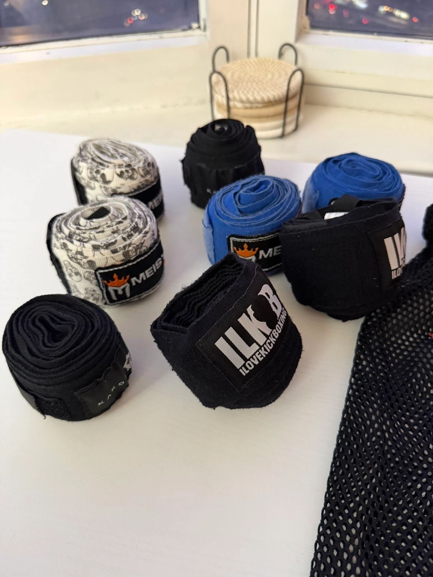 - 4 pairs hand wraps (black, blue, white print) and $10 for all.