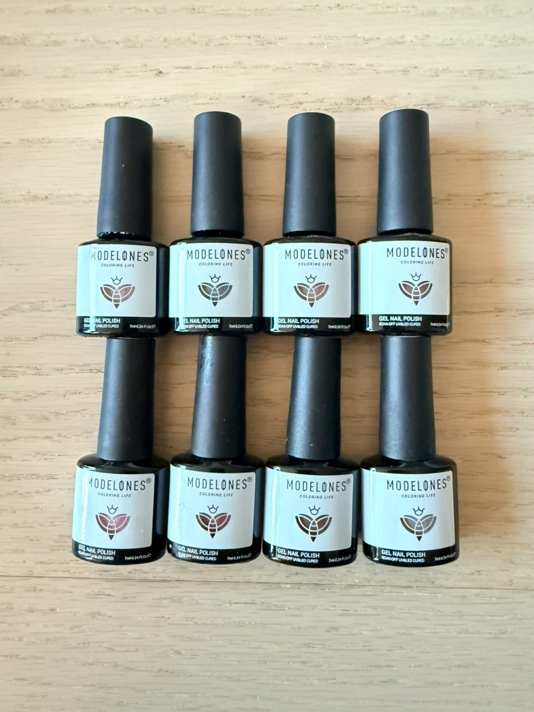 This set includes 8 bottles of Modelones gel nail polish. Each bottle contains 7ml (0.24 fl oz) of polish. These are gel polishes for UV/LED lamp curing. Great for creating salon-quality manicures at home!