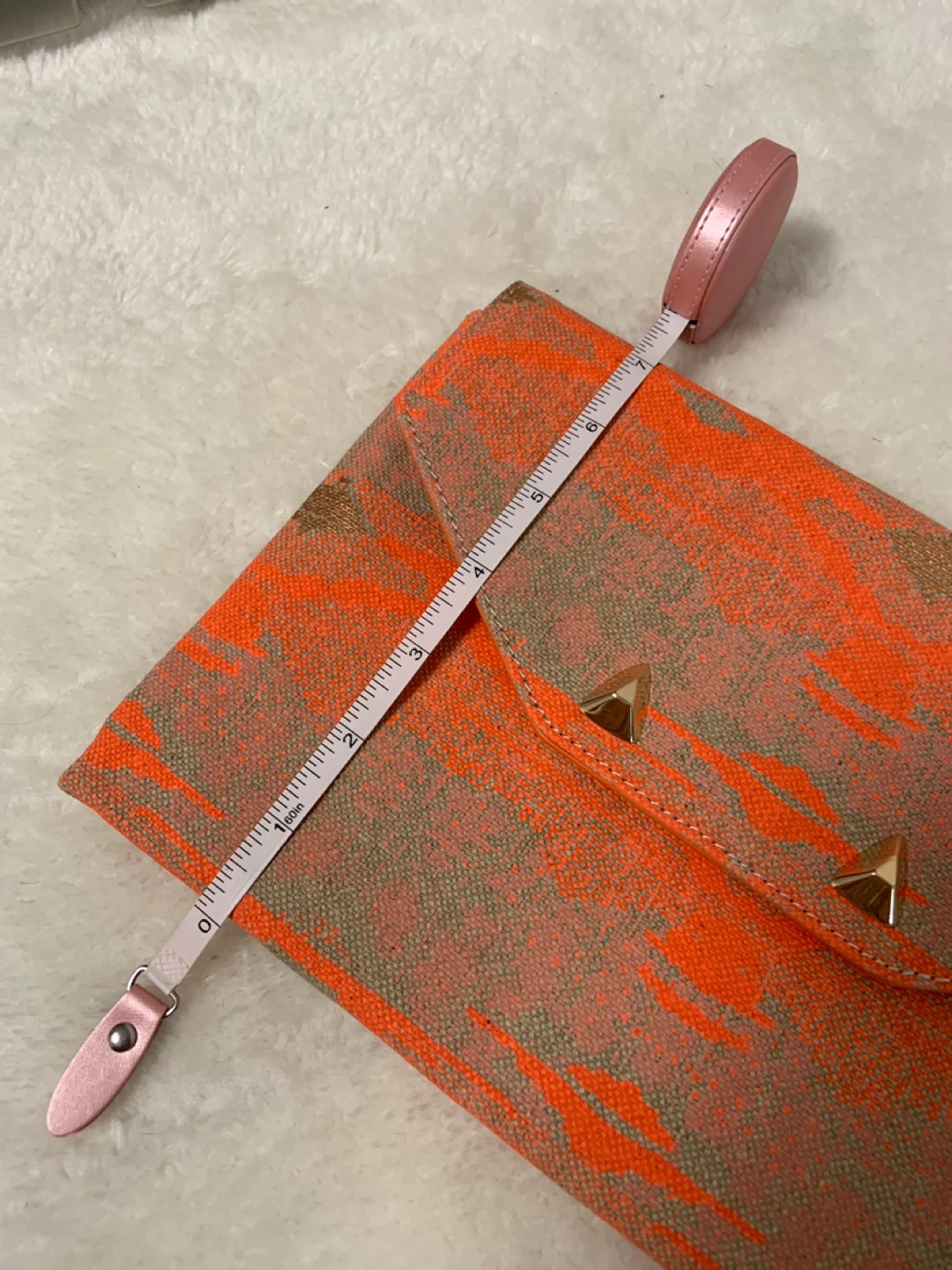 It measures approximately 10.5”inches in length and 7”inches in height. The interior has a fun polka dot pattern.