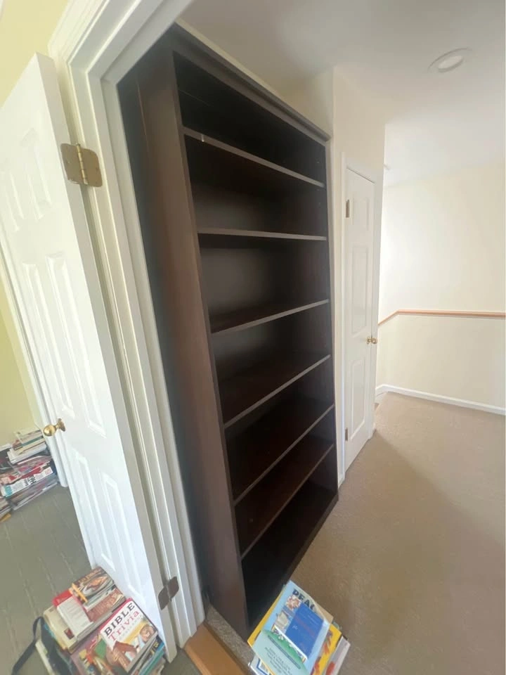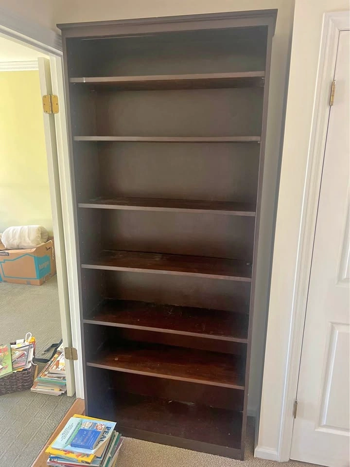Simple, functional black wooden bookshelf in fair condition. Solid piece overall, with a crack on the top portion (cosmetic, still usable). Dimensions: 3’ W × 11 1/4” D × 7’ H. Multiple shelves for books or storage. Slim profile—fits well in tight spaces. Good for basement, office, or rental setup. Asking $50 OBO.
