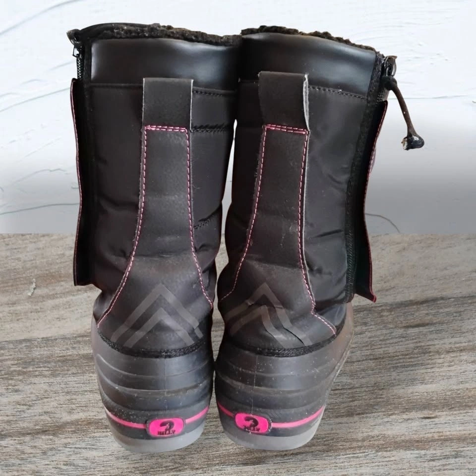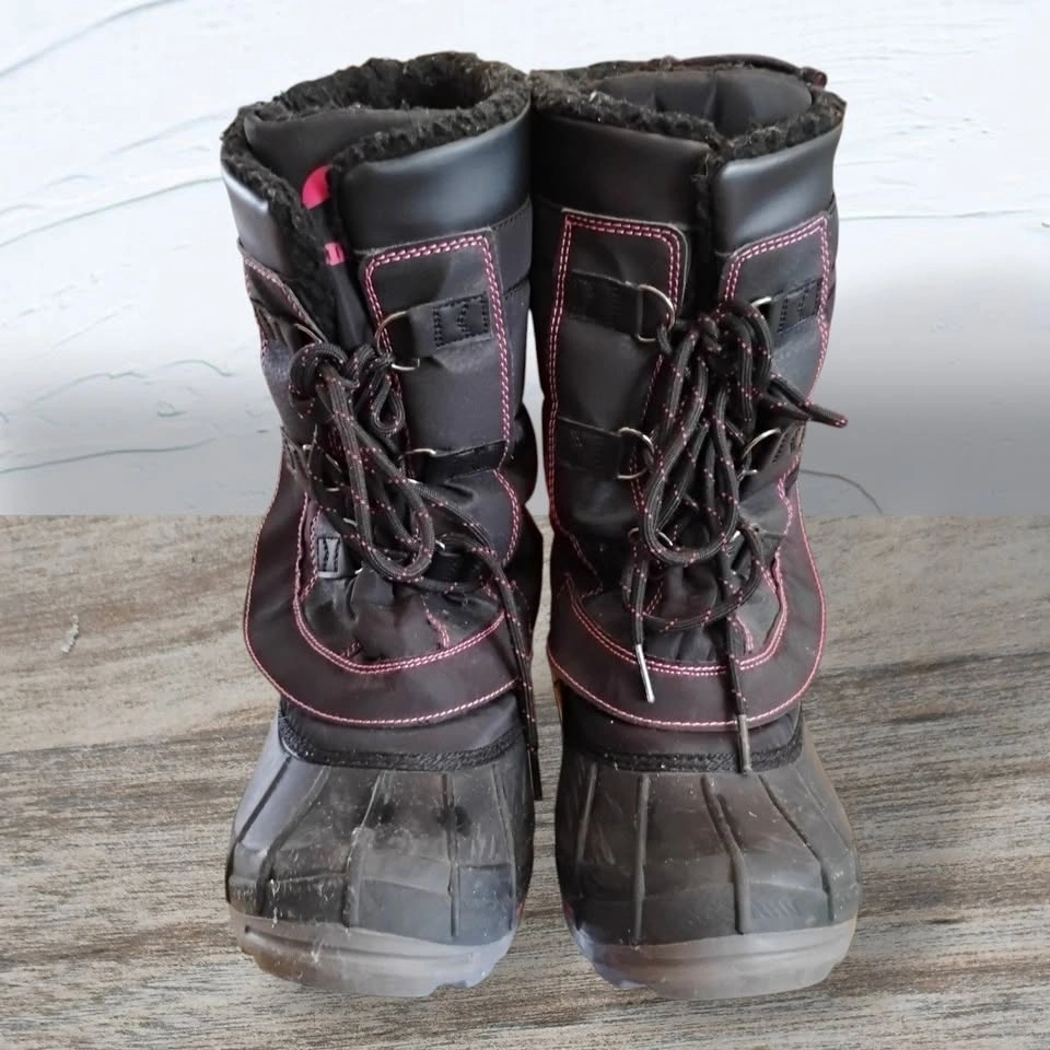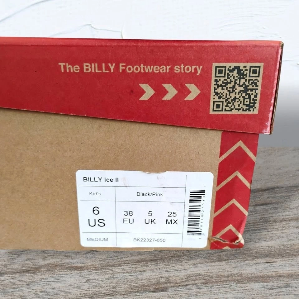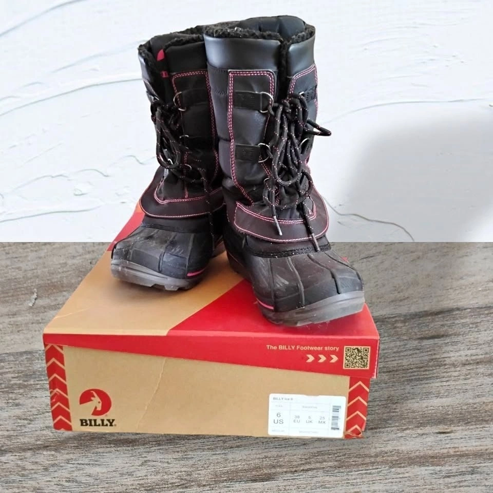 Billy Shoes Ice II Snow Boots, youth size 6. Pink/black AFO friendly boots with zipper and tie closure. Rubber toe box/treads, fabric upper. Reaches to mid-calf. Removable insoles included. In very good pre-owned condition, rarely worn. Includes original box. Box has shipping damage from when originally purchased.
