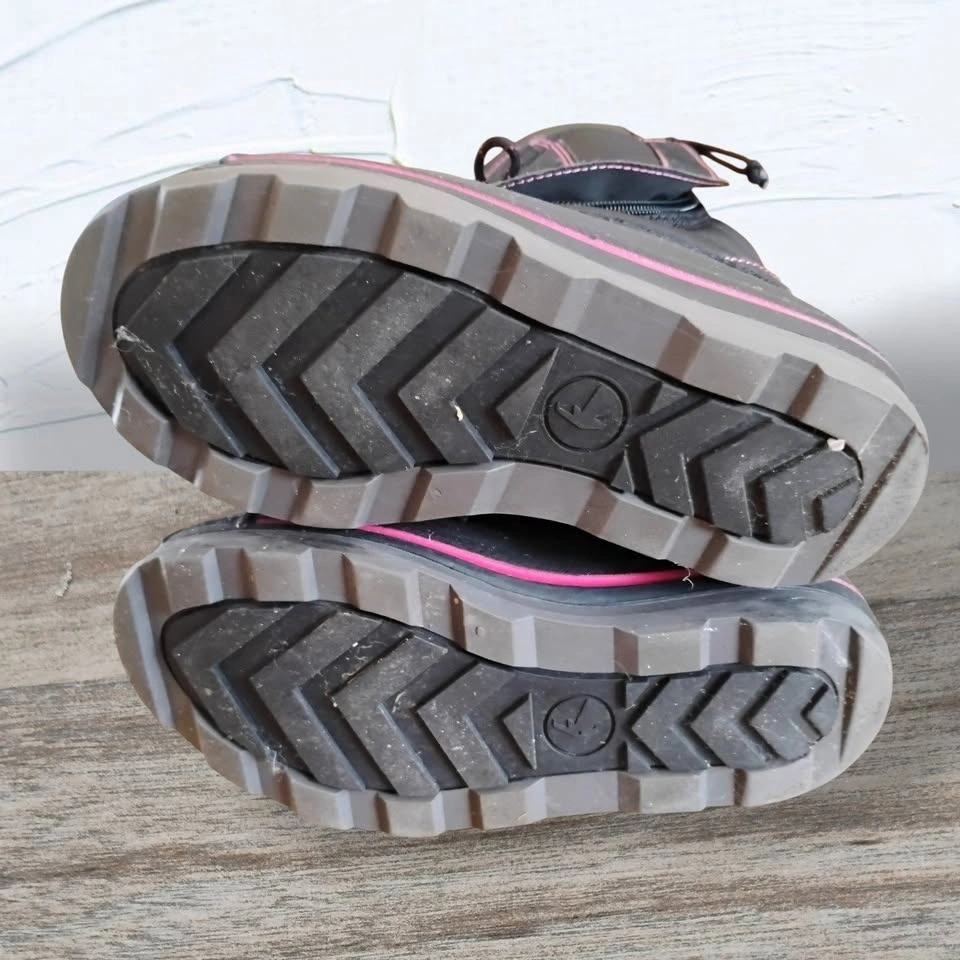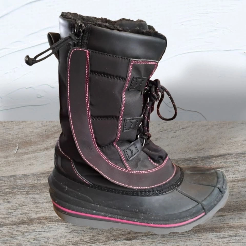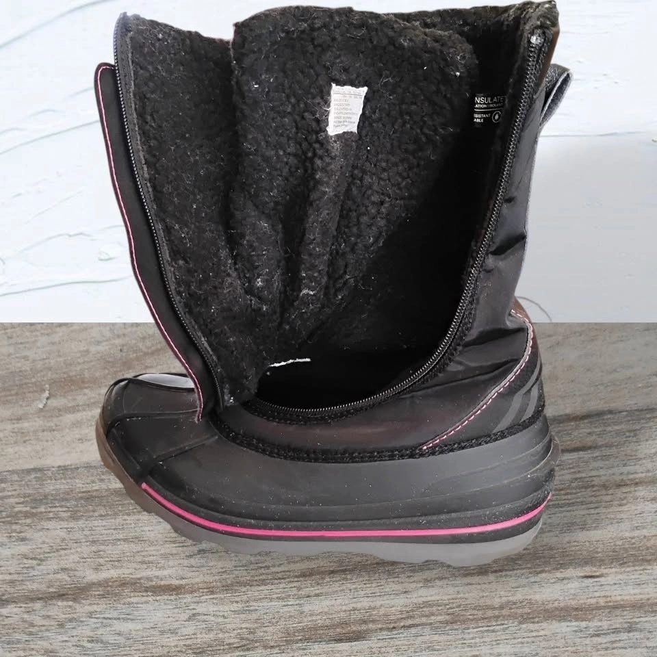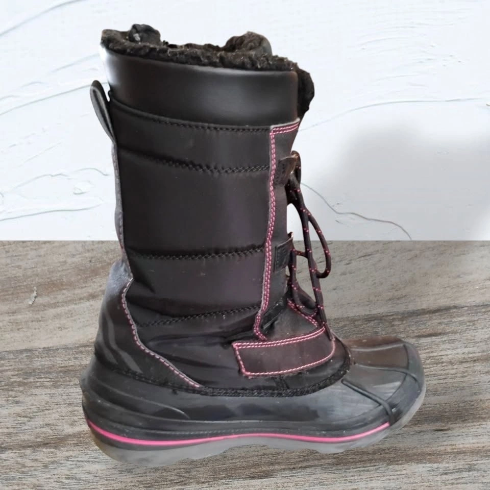 Billy Shoes Ice II Snow Boots, youth size 6. Pink/black AFO friendly boots with zipper and tie closure. Rubber toe box/treads, fabric upper. Reaches to mid-calf. Removable insoles included. In very good pre-owned condition, rarely worn. Includes original box. Box has shipping damage from when originally purchased.