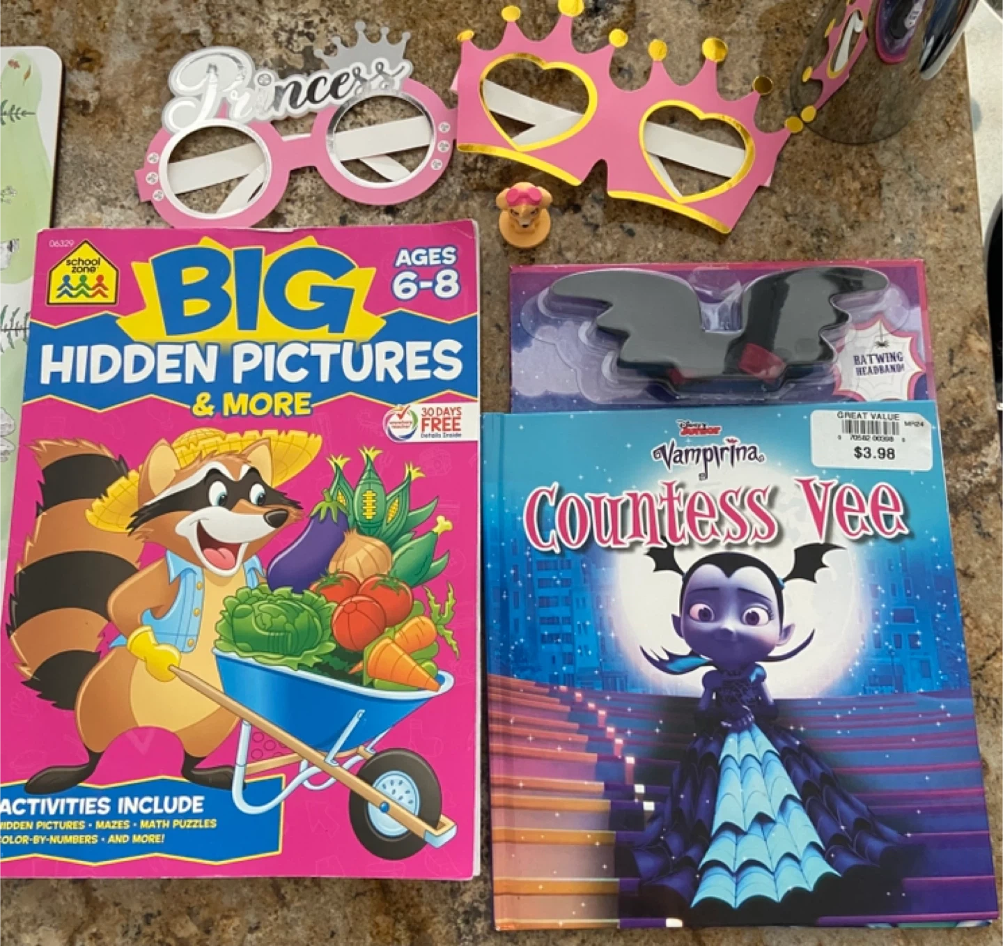 This bundle includes a School Zone Big Hidden Pictures & More activity book for ages 6-8 and a Vampirina Countess Vee book. The activity book features hidden pictures, mazes, math puzzles, and color-by-numbers. Perfect for kids who love puzzles and reading!