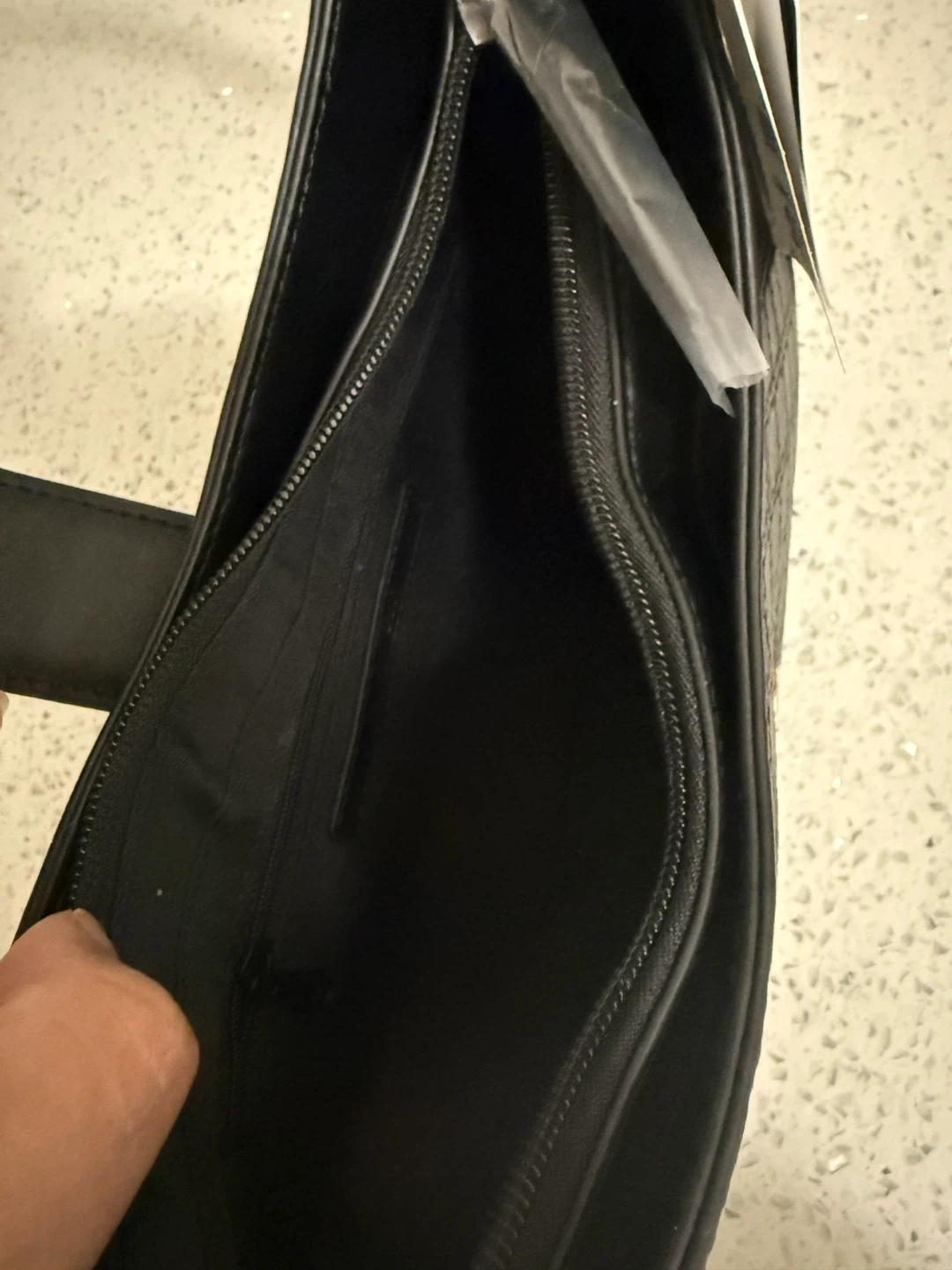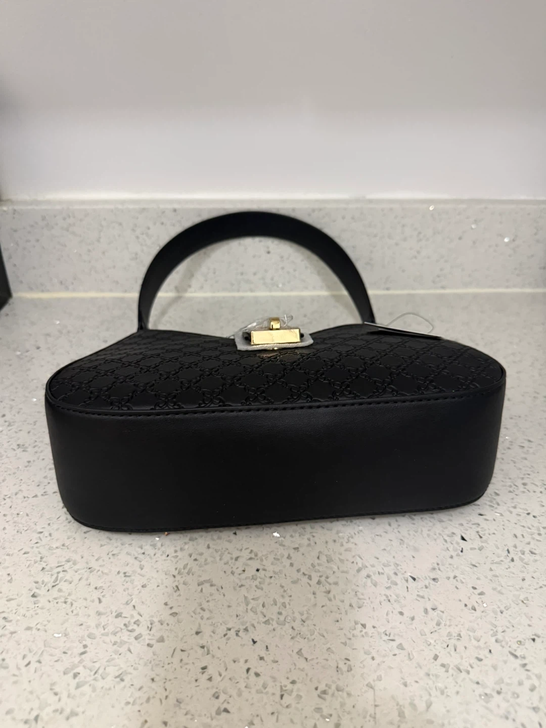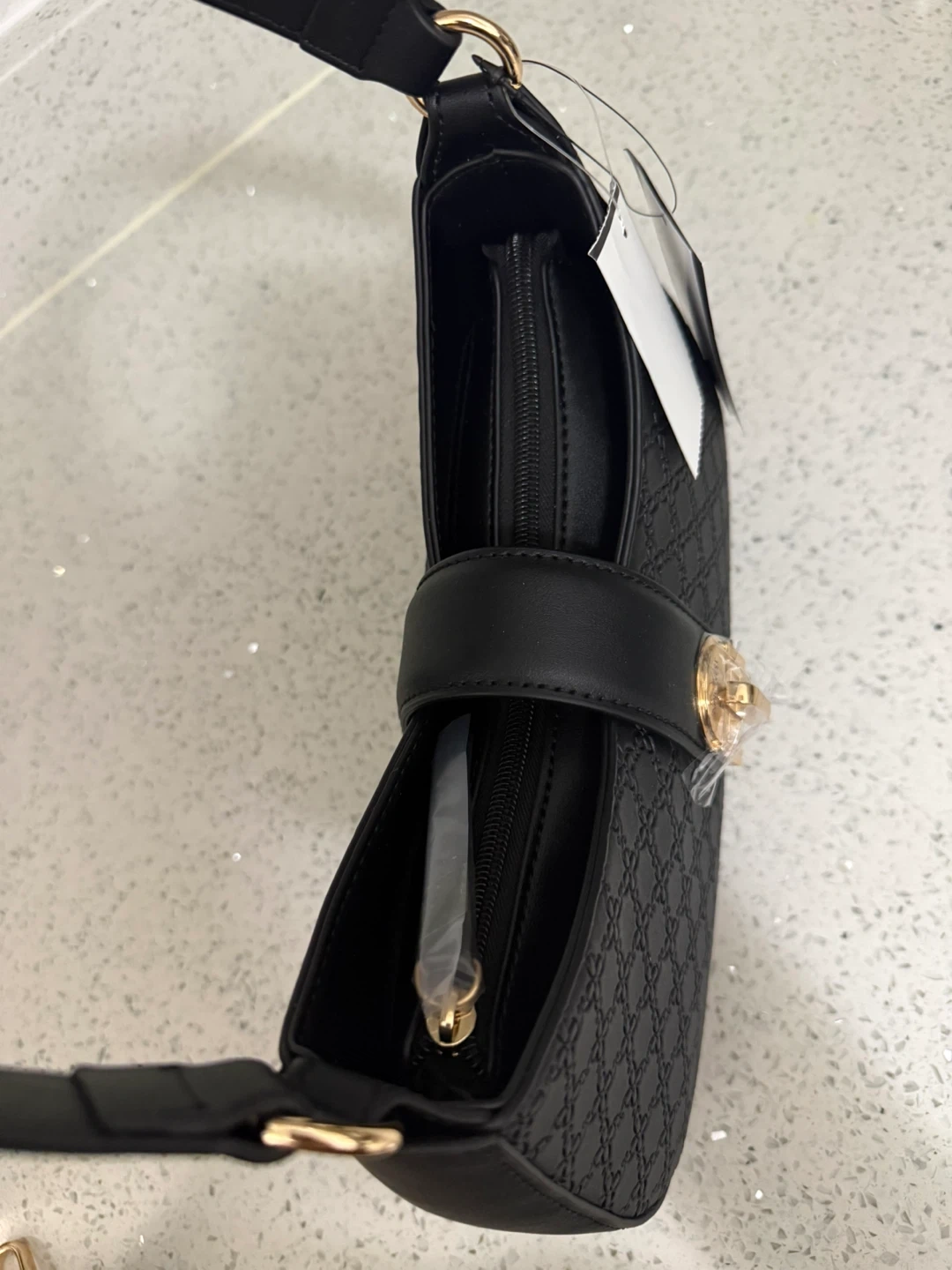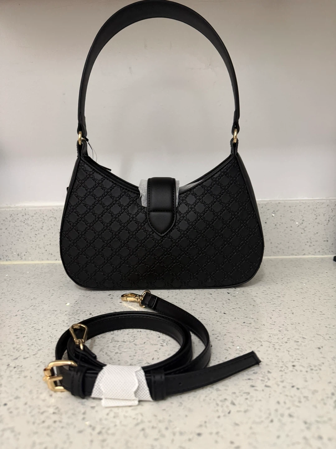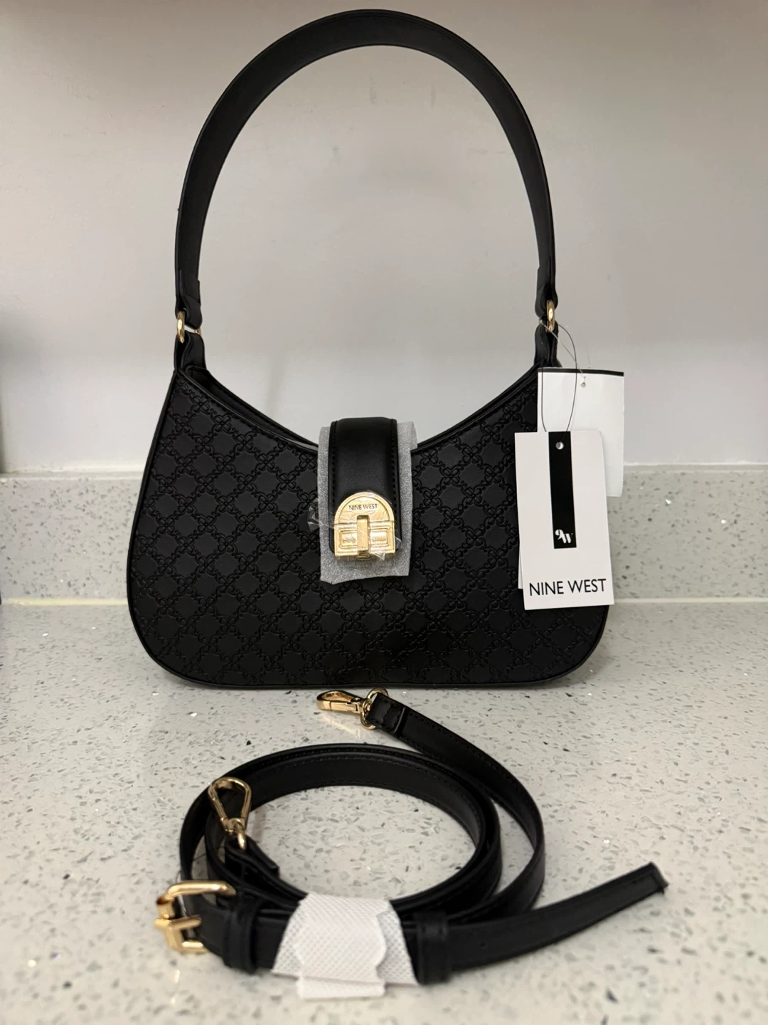 This black shoulder bag from Nine West features a subtle embossed pattern. It has a main zip compartment and includes an adjustable crossbody strap. Faux leather material.