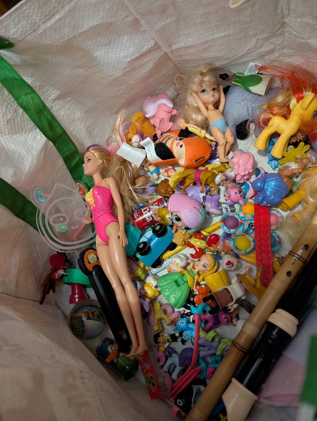 This bundle includes a variety of toys, featuring dolls like Barbie and other small figures. It's a mix of colorful plastic toys suitable for imaginative play. Some items appear to be from popular children's brands.