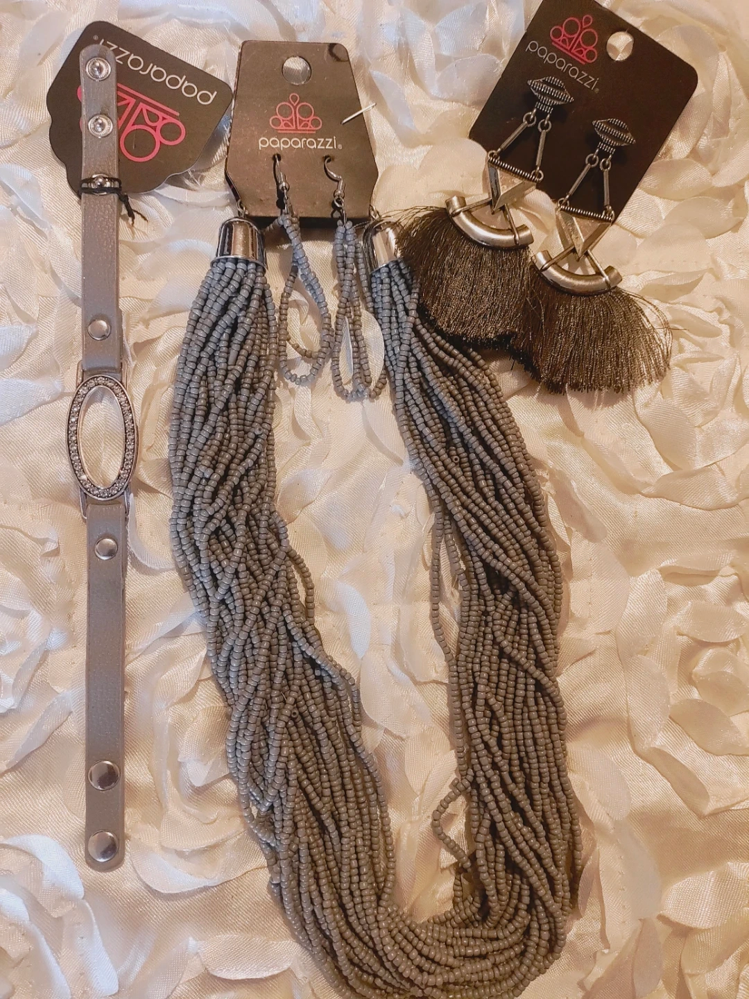 This Paparazzi jewelry set includes a beaded necklace, a matching bracelet with a rhinestone accent, and a pair of tassel earrings. All pieces are in a neutral gray tone. The set is perfect for adding a touch of sparkle to any outfit!