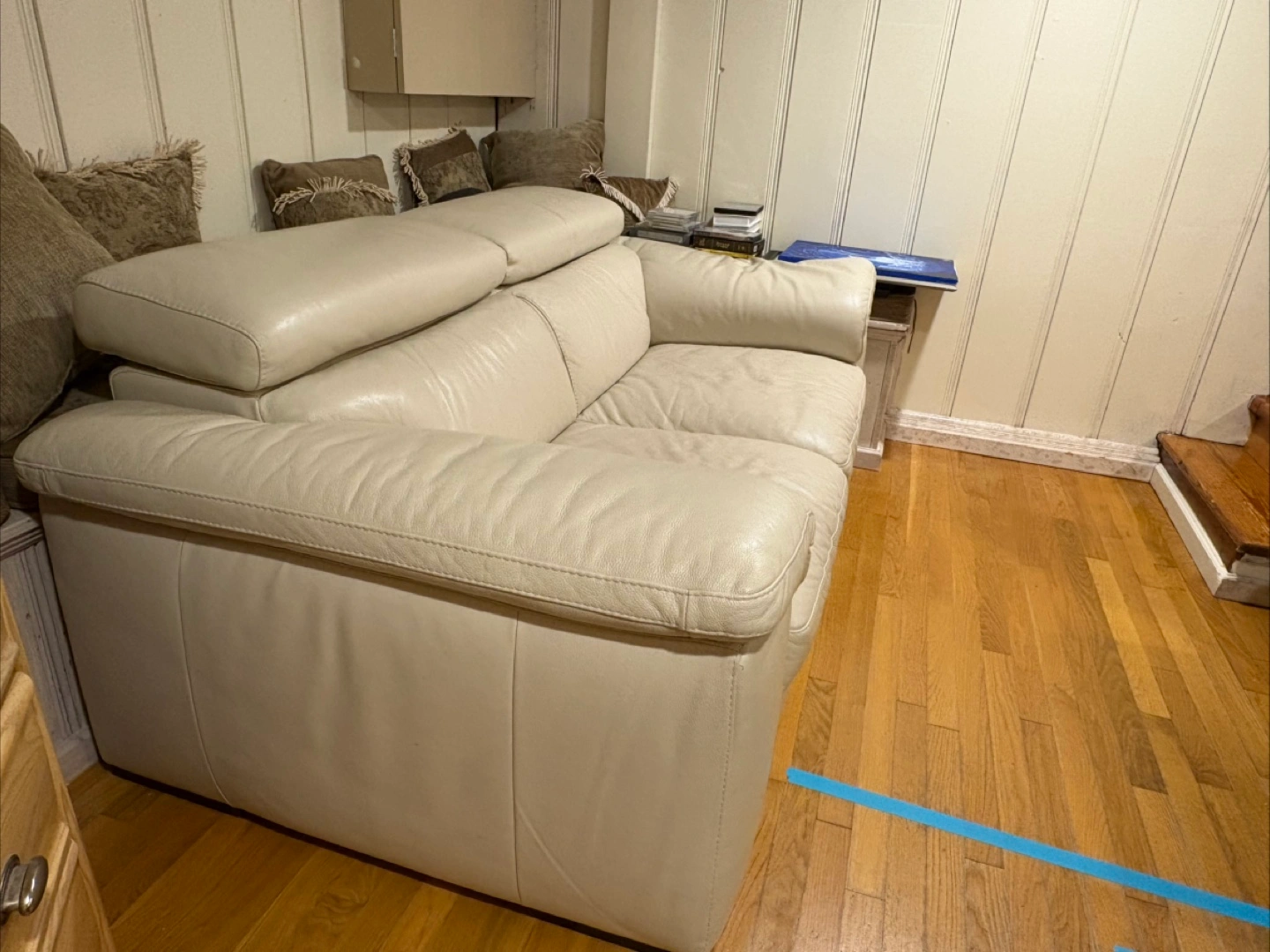 65Selling a cream-colored leather loveseat sofa. It's in good condition and would look great in any living room or den. Perfect for relaxing and watching TV or reading a book!