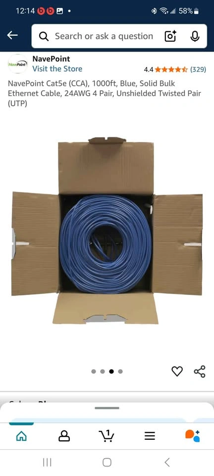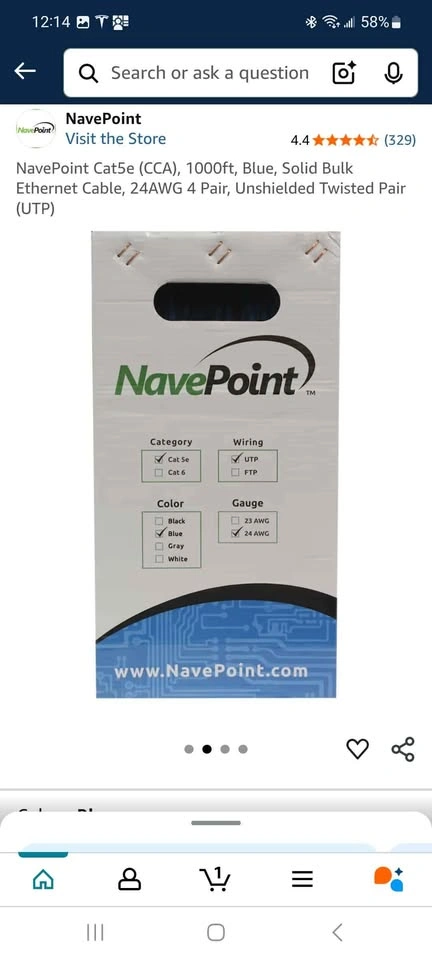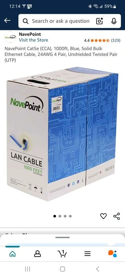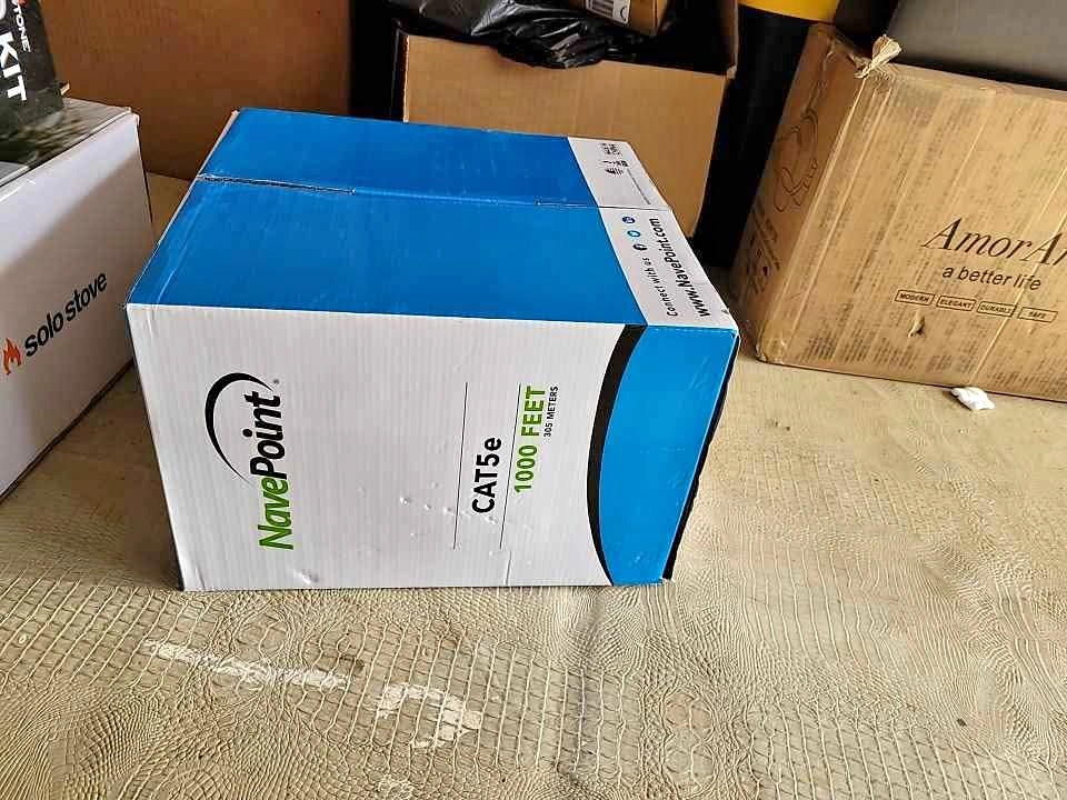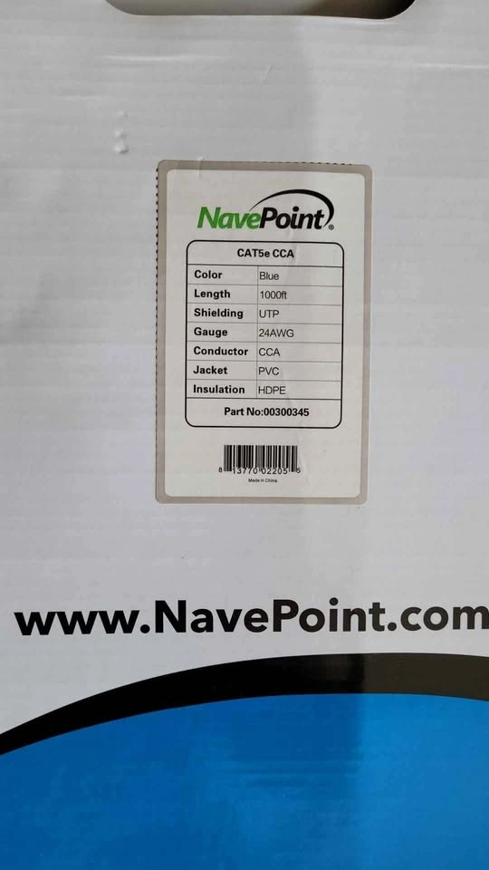 0NavePoint Cat5e (CCA), 1000ft, Blue, Solid Bulk Ethernet Cable, 24AWG 4 Pair, Unshielded Twisted Pair (UTP). New in box. Pickup near Fox Valley Mall Aurora.