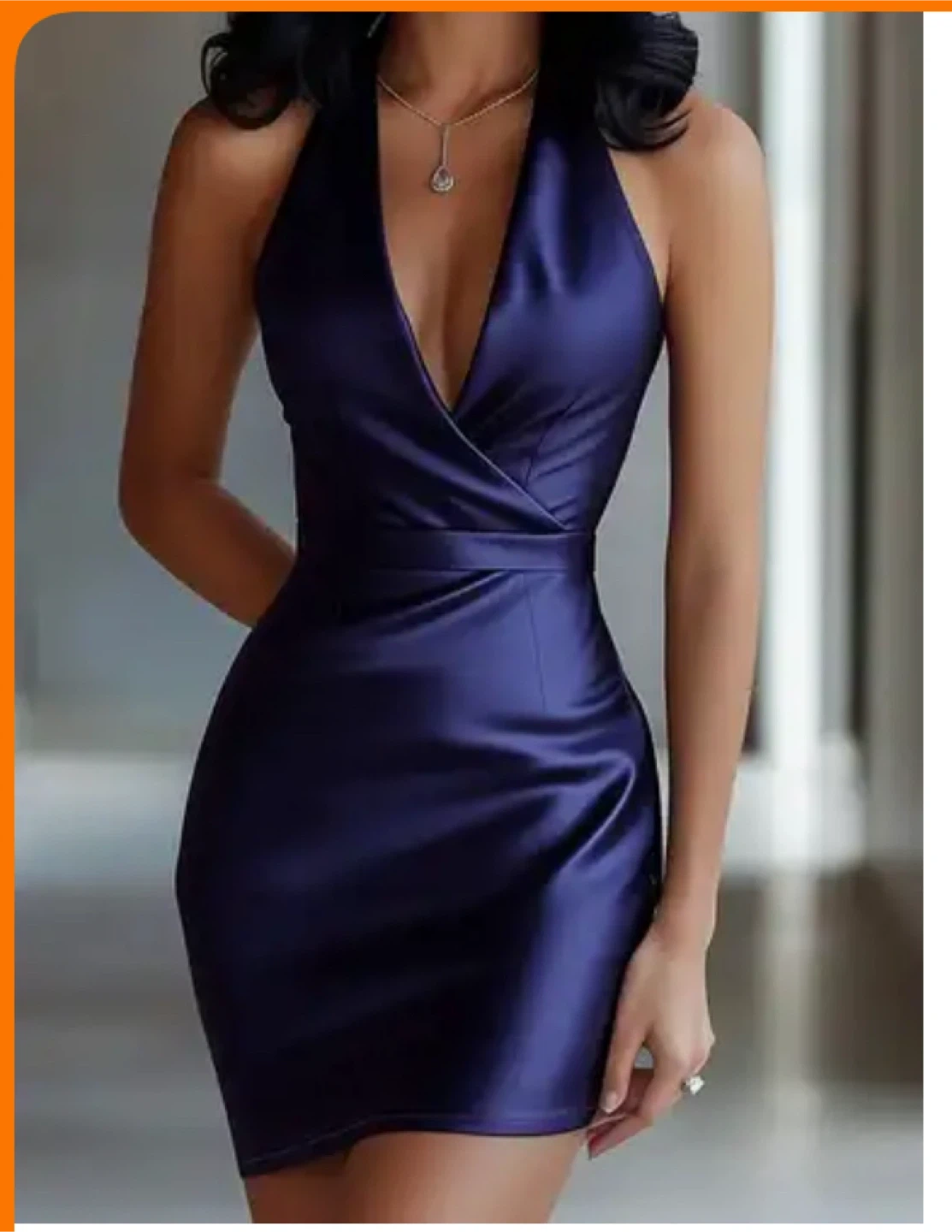 Selling a stylish navy blue halter mini dress! It's perfect for a night out or a special occasion. The dress features a flattering wrap-style front and a sleek, bodycon fit. The material has a subtle sheen that catches the light beautifully