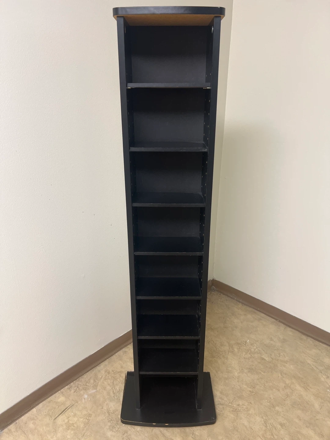 This is a tall, black media storage tower. It has ten shelves for organizing DVDs, CDs, or books. It's a great space-saving solution for any room!
