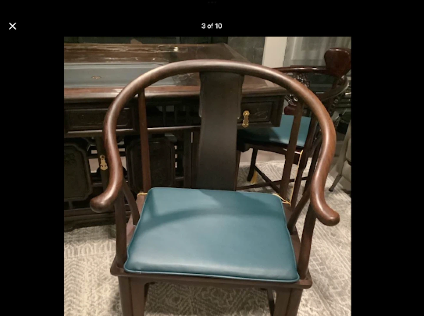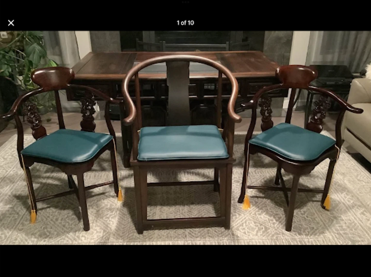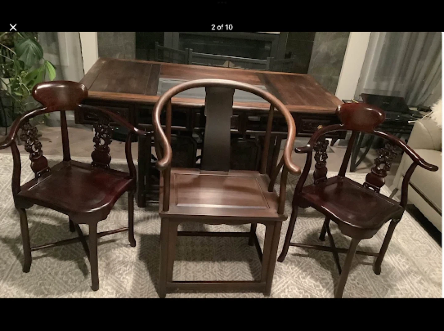Walnut Hand Carved Tea Ceremony Chinese Table with natural stone insert and drain + Walnut Captain’s Chair and two Chinese Rosewood Hand Carved Corner Chairs with cushions.