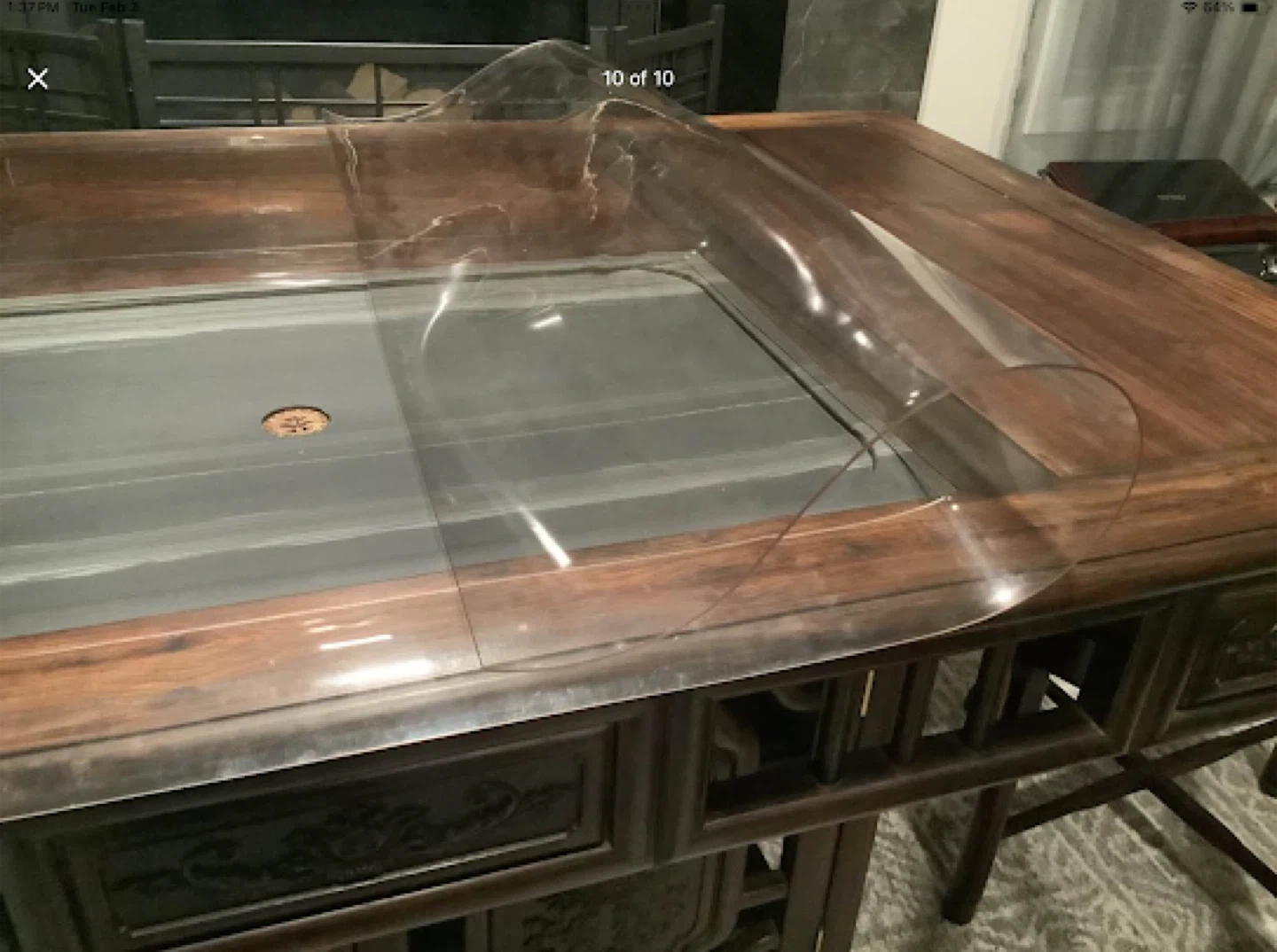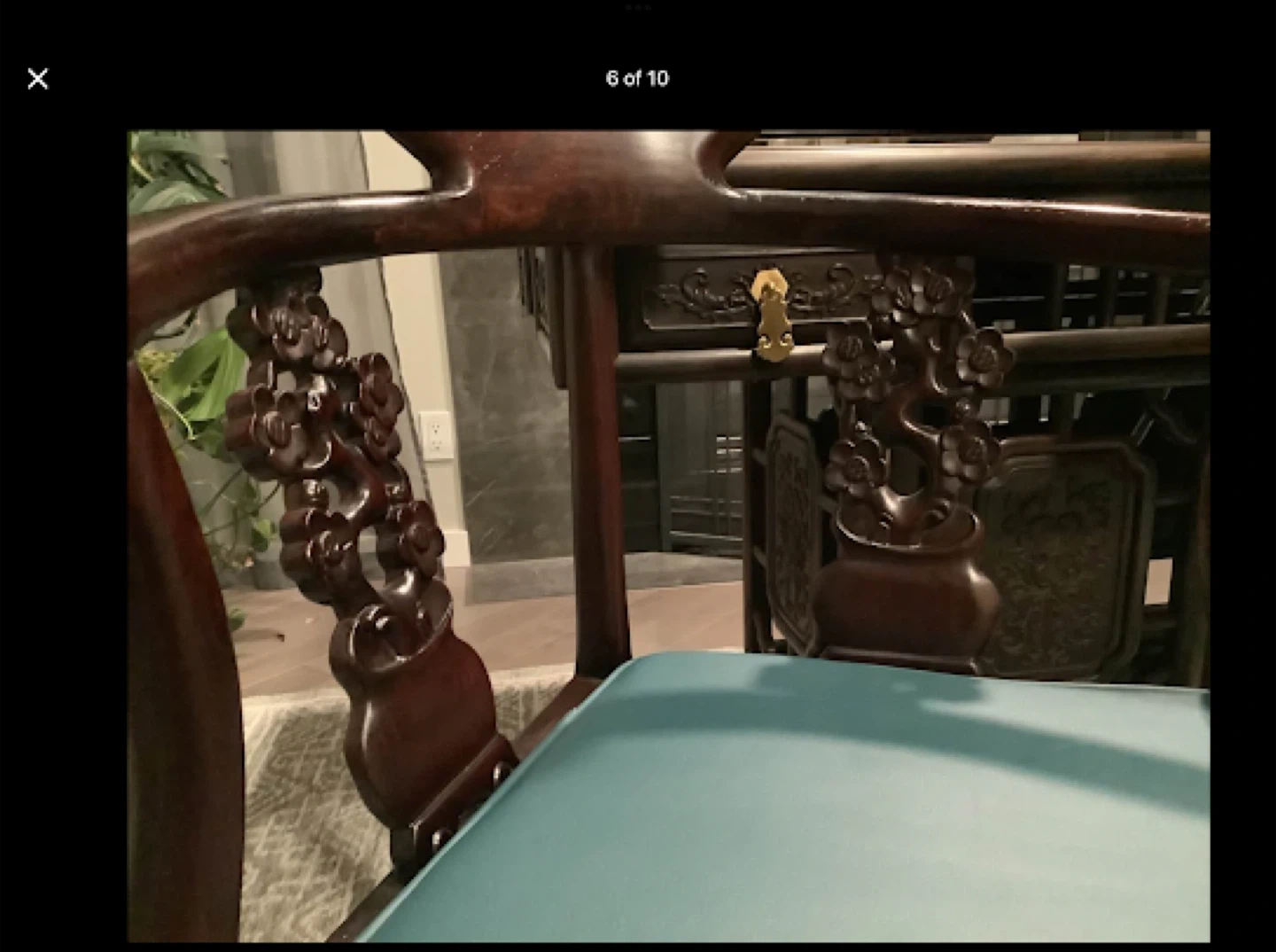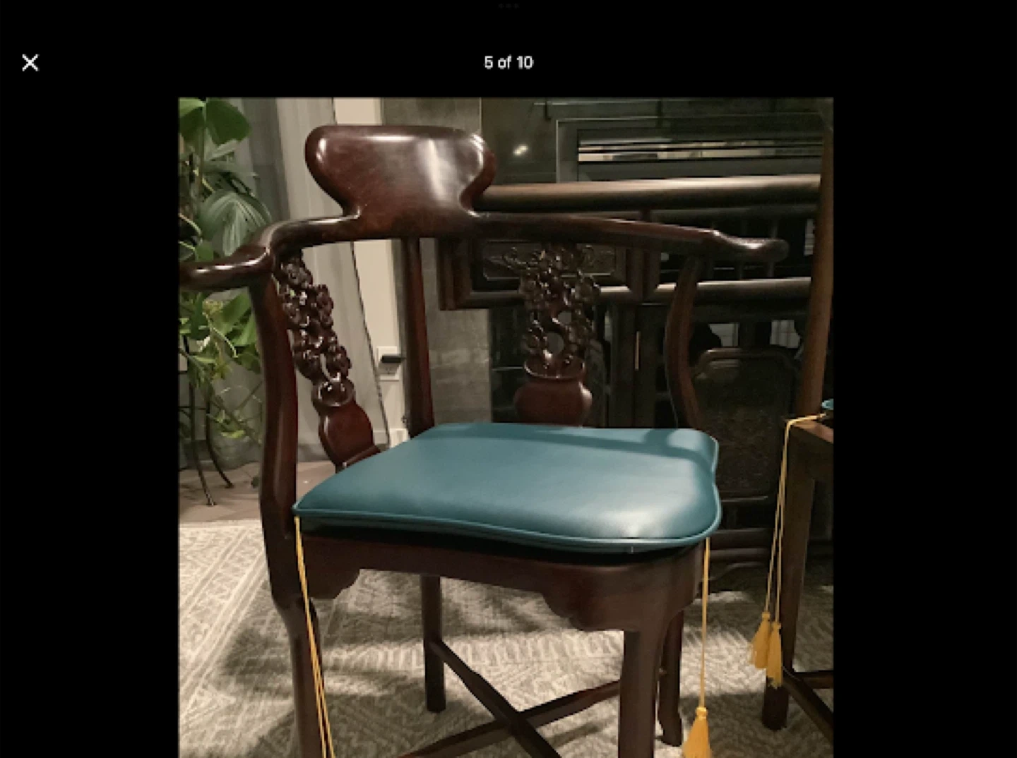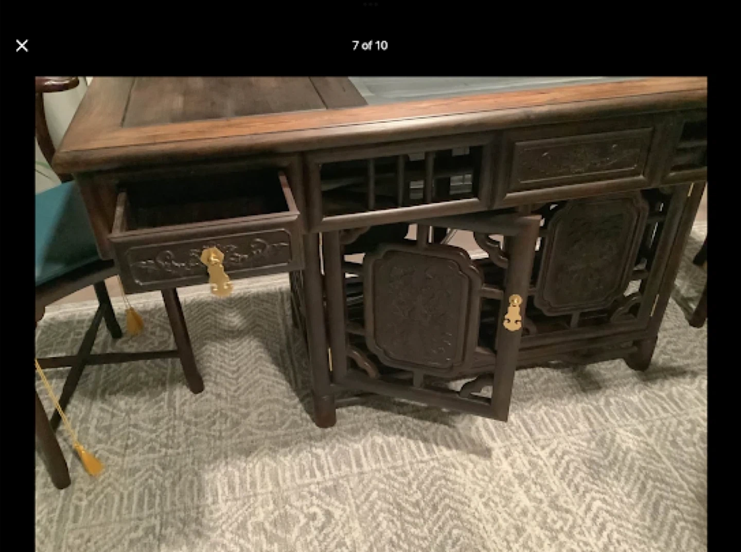 Walnut Hand Carved Tea Ceremony Chinese Table with natural stone insert and drain + Walnut Captain’s Chair and two Chinese Rosewood Hand Carved Corner Chairs with cushions.