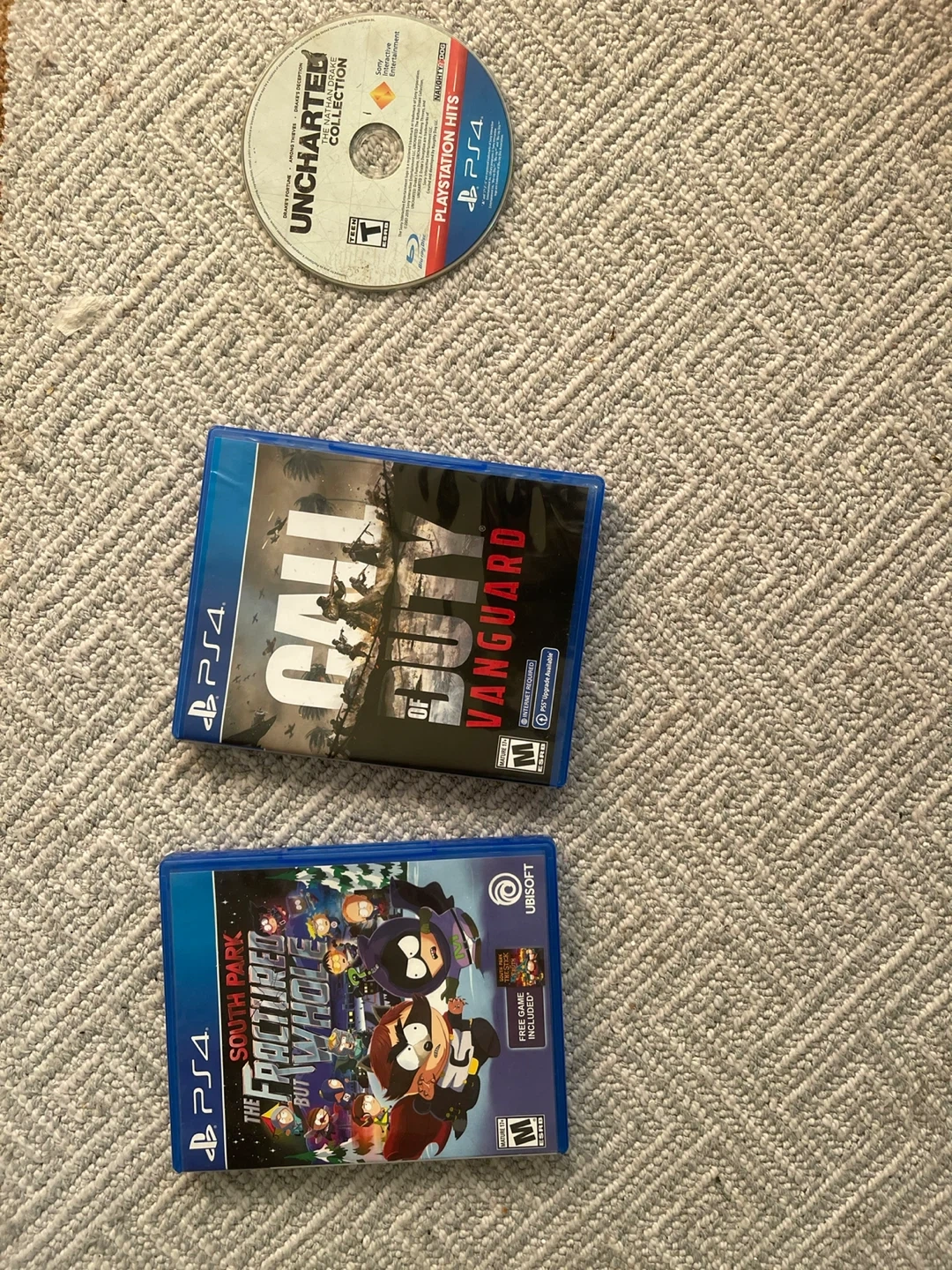 Bundle of three PS4 games: The Uncharted: The Nathan Drake Collection, South Park: The Fractured But Whole, and Call of Duty: Modern Warfare - The Last Mission. All games come in their original cases with discs.