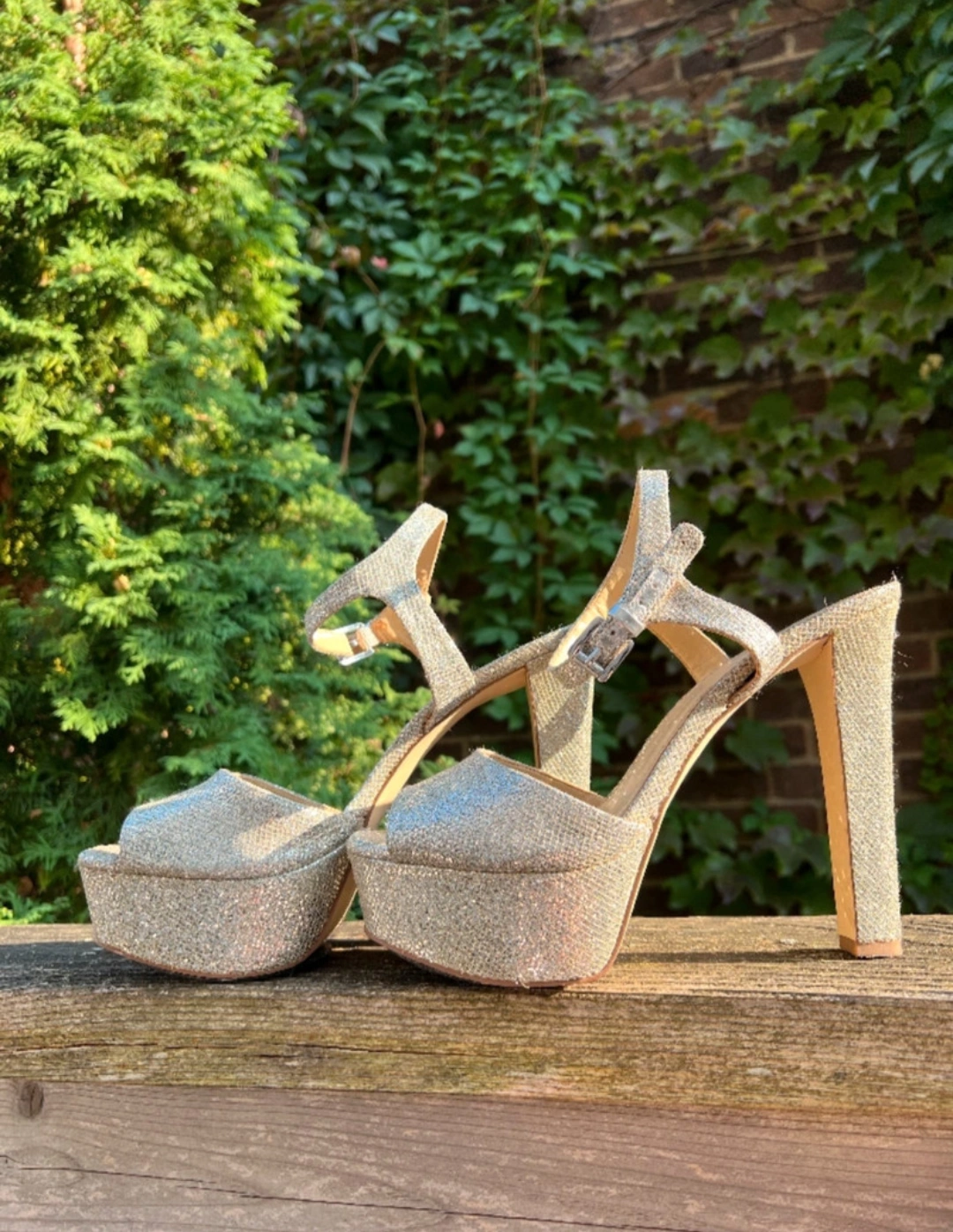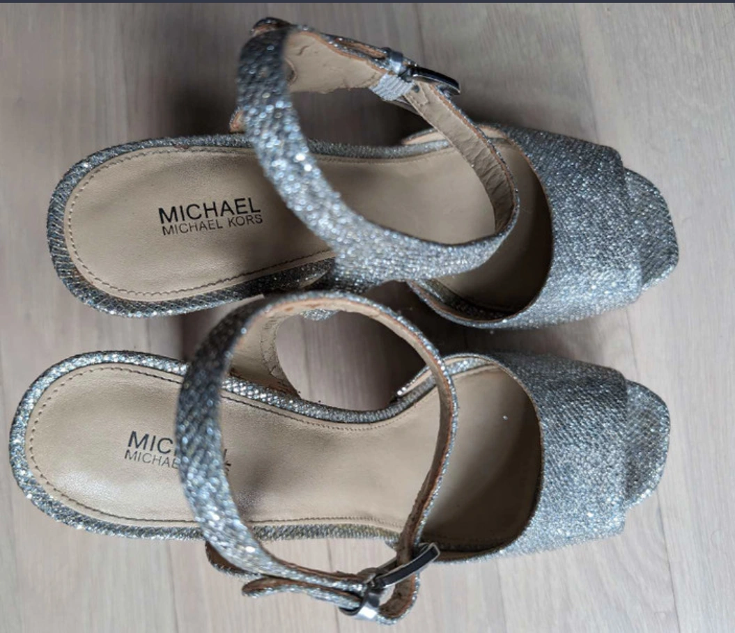 These heels are a great addition to any wardrobe. They are very comfortable and stylish. They have a chunky heel , a delicate silver sparkle throughout, and a platform. Worn once.