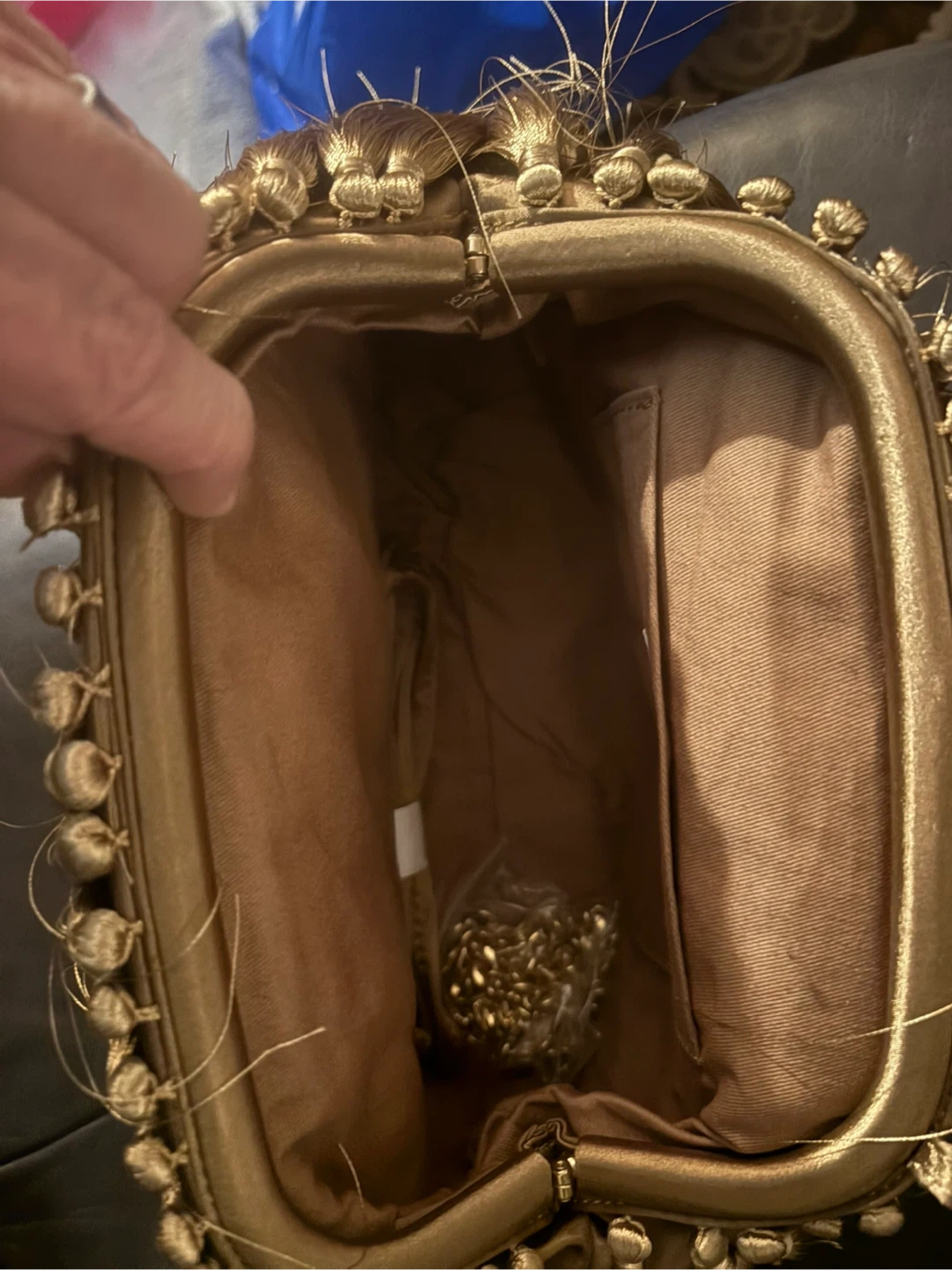 Gorgeous gold taupe tassel clutch bag. It's embellished with gold hardware and has a detachable chain strap. Interior has a small slip pocket. This statement piece would be perfect for an evening out or a special occasion! This has never been used - pet and smoke free home