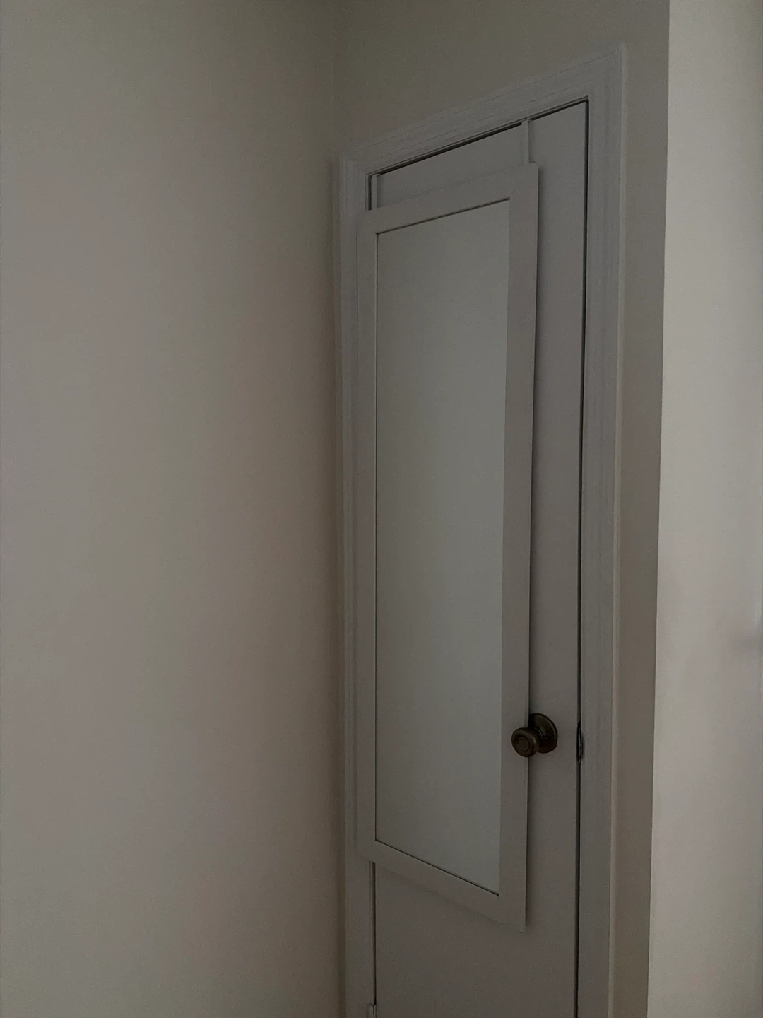 This is a full-length mirror designed to hang over a door. It's perfect for checking your outfit before heading out. The mirror has a slim white frame. There are a few minor scuffs that can be easily painted.